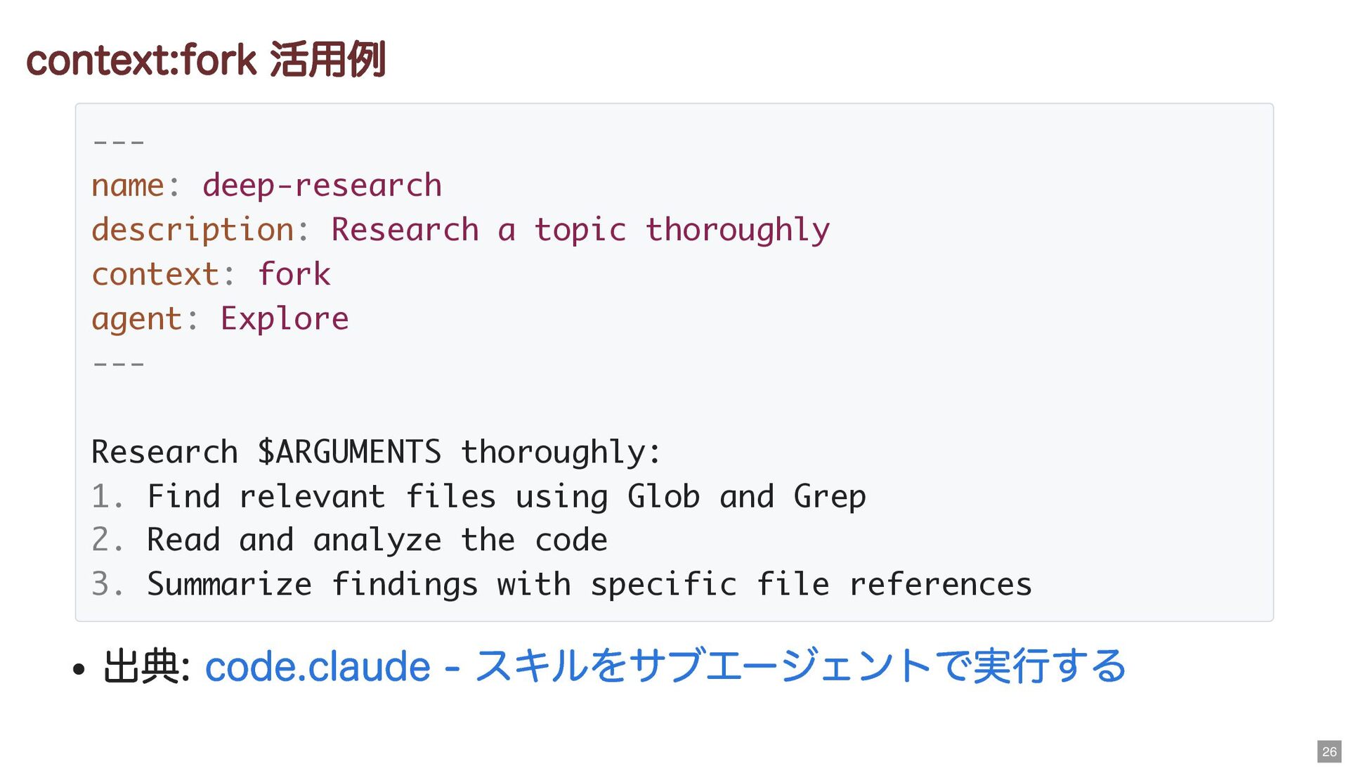 thoroughly context: fork agent: Explore --- Research $ARGUMENTS thoroughly: 1. Find relevant files using Glob and Grep 2. Read and analyze the code 3. Summarize findings with specific file references code.claude - スキルをサブエージェントで実行する 26