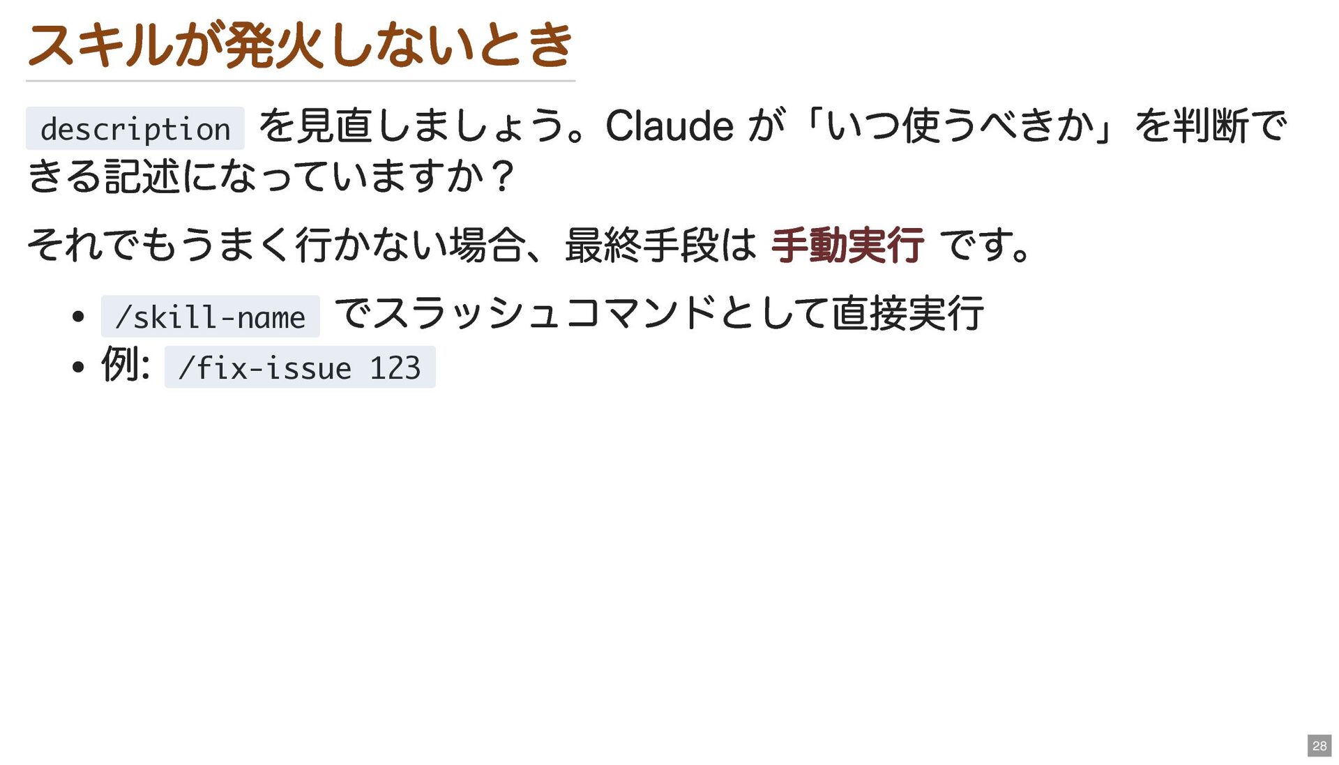 スキルが発火しないとき description を見直しましょう。Claude が「いつ使うべきか」を判断で きる記述になっていますか? それでもうまく行かない場合、最終手段は 手動実行 です。 /skill-name でスラッシュコマンドとして直接実行