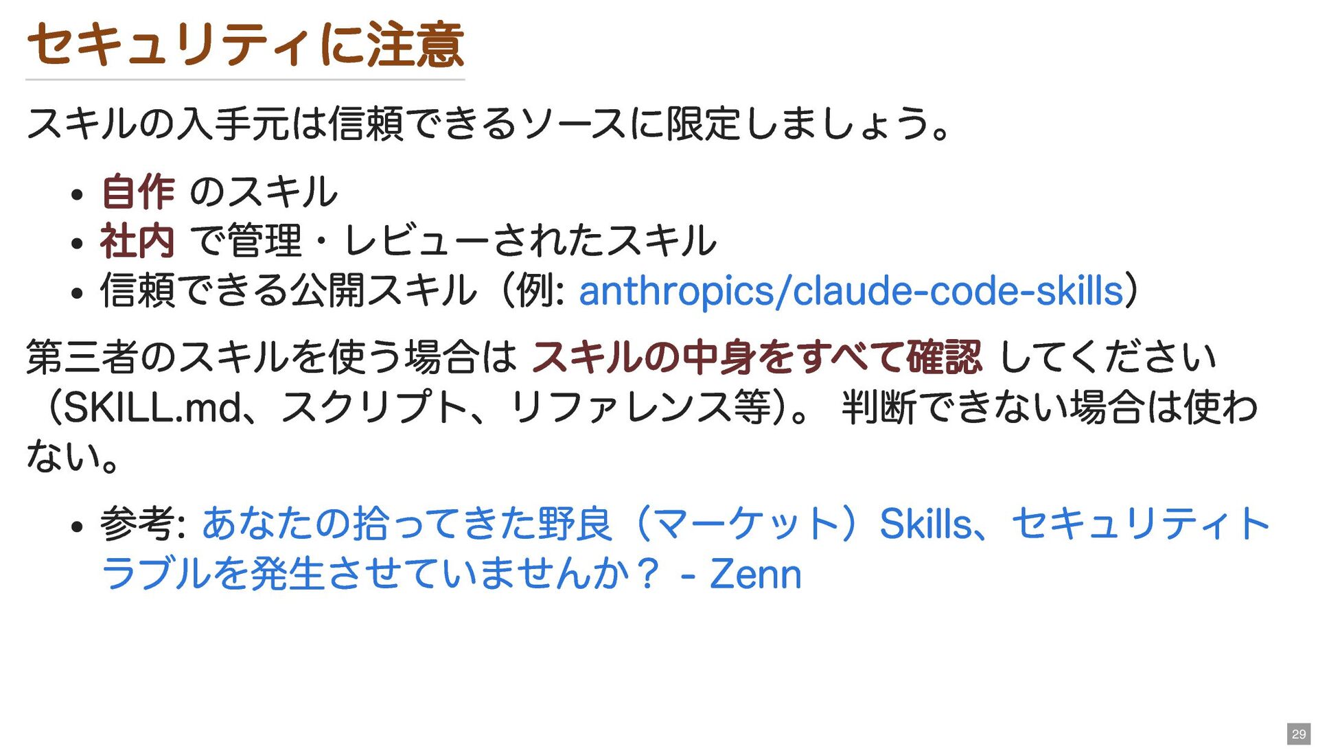 セキュリティに注意 スキルの入手元は信頼できるソースに限定しましょう。 自作 のスキル 社内 で管理・レビューされたスキル 信頼できる公開スキル(例: ) 第三者のスキルを使う場合は スキルの中身をすべて確認