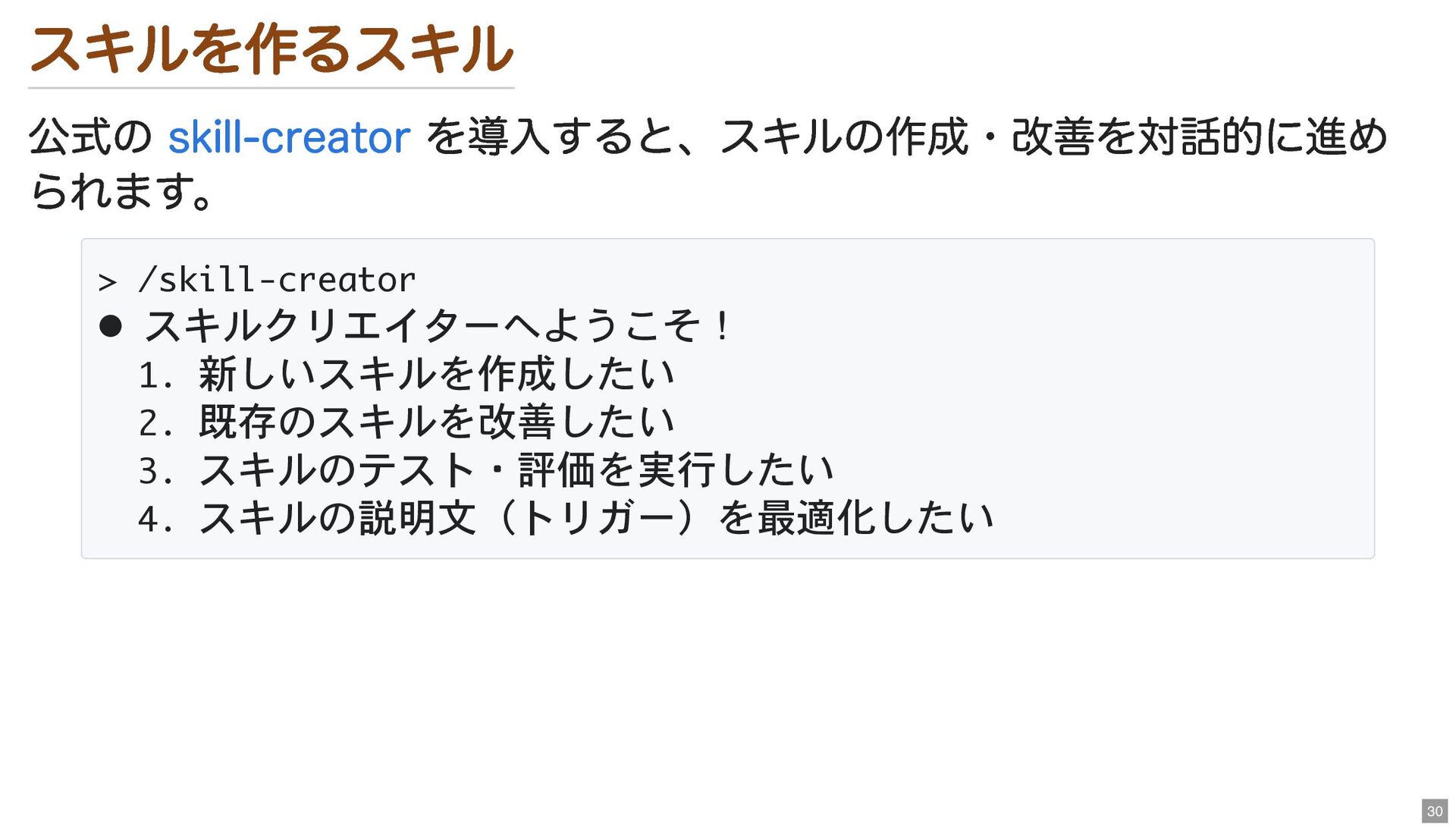 新しいスキルを作成したい 2. 既存のスキルを改善したい 3. スキルのテスト・評価を実行したい 4. スキルの説明文(トリガー)を最適化したい 30