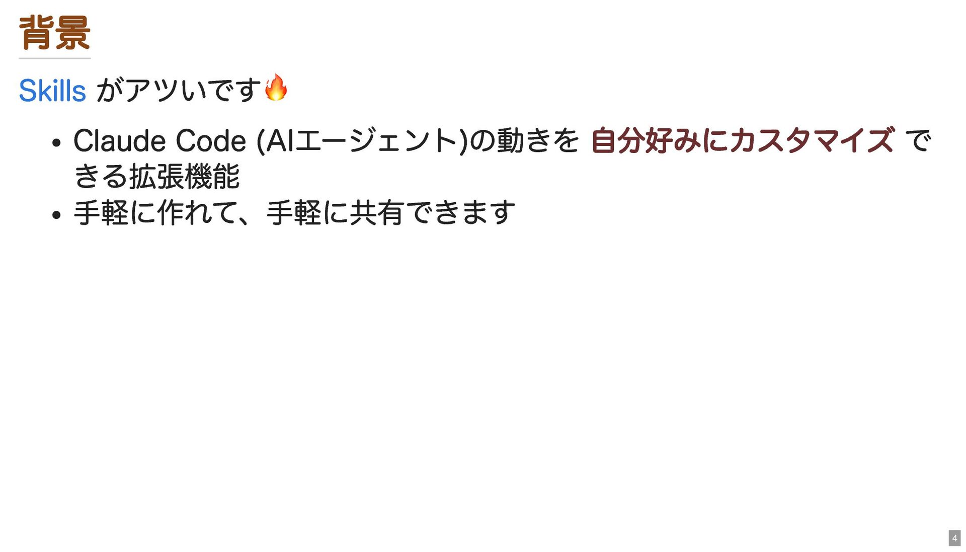 背景 がアツいです🔥 Claude Code (AIエージェント)の動きを 自分好みにカスタマイズ で きる拡張機能 手軽に作れて、手軽に共有できます Skills
