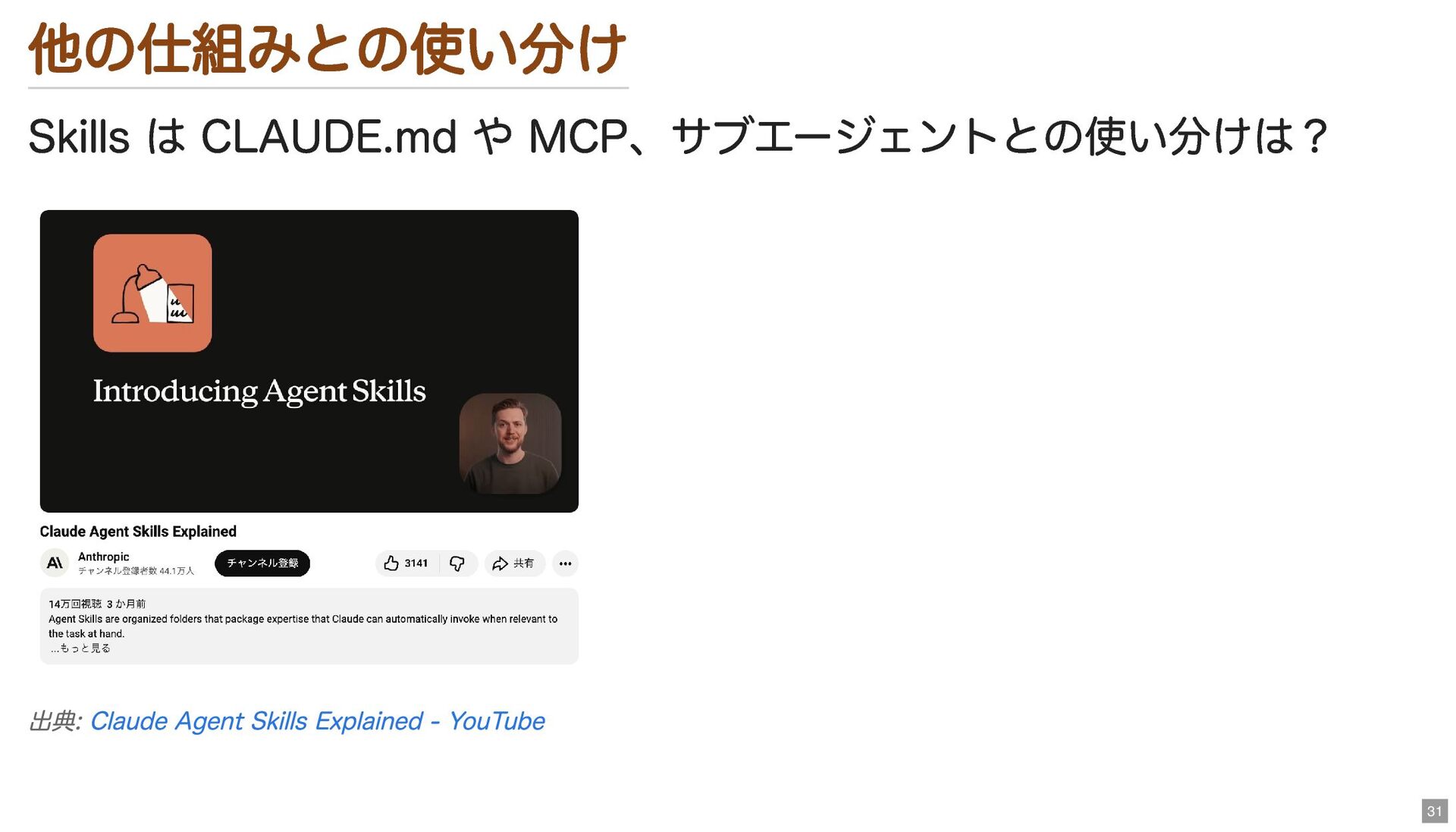 他の仕組みとの使い分け Skills は CLAUDE.md や MCP、サブエージェントとの使い分けは? 出典: Claude Agent Skills
