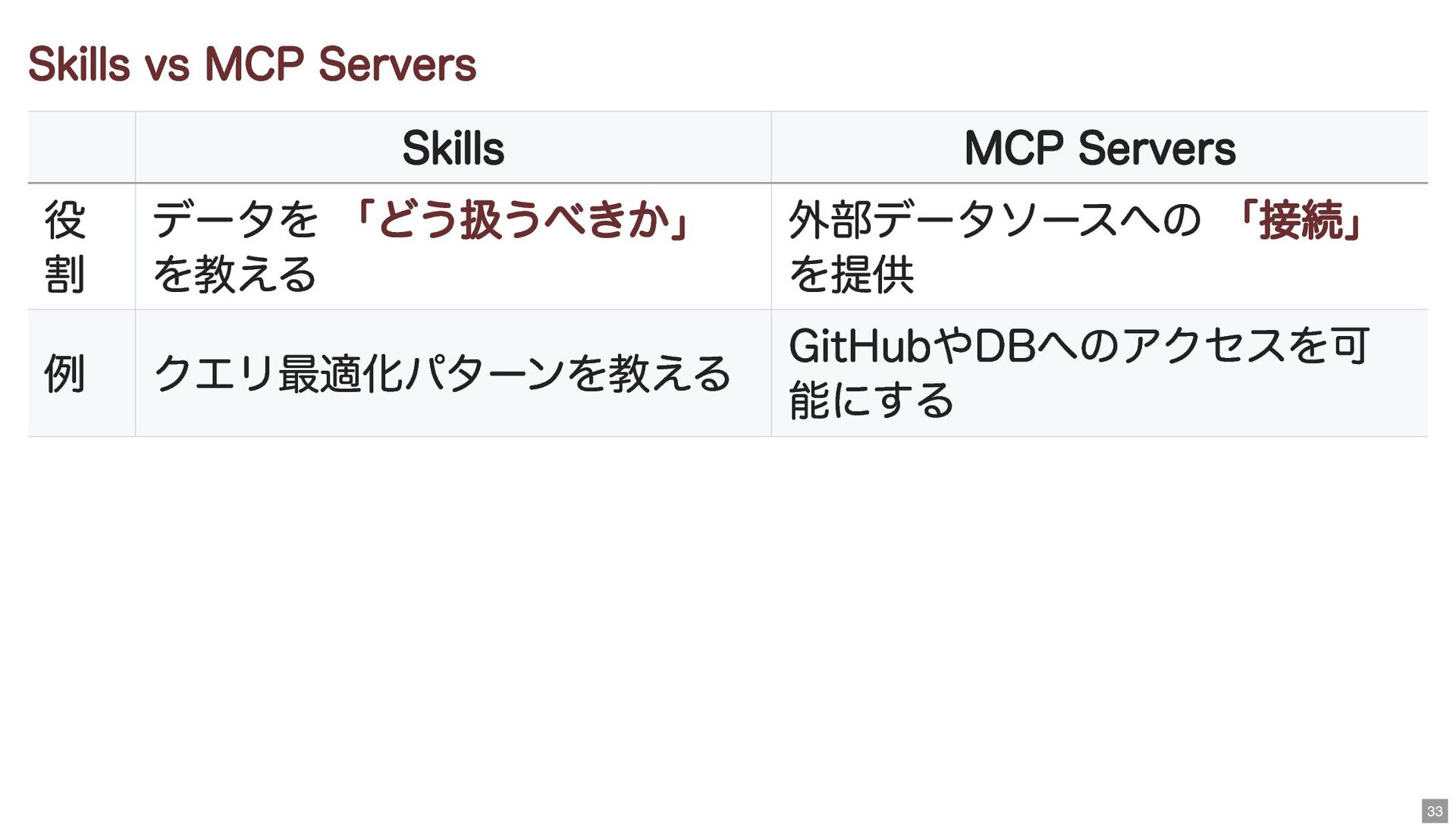 「どう扱うべきか」 を教える 外部データソースへの 「接続」 を提供 例 クエリ最適化パターンを教える GitHubやDBへのアクセスを可 能にする 33