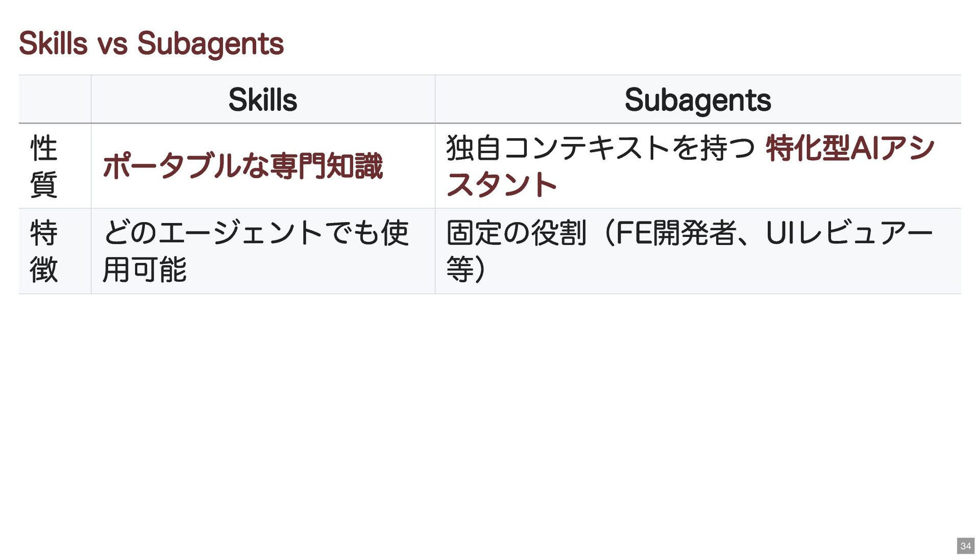 Skills vs Subagents Skills Subagents 性 質 ポータブルな専門知識 独自コンテキストを持つ 特化型AIアシ