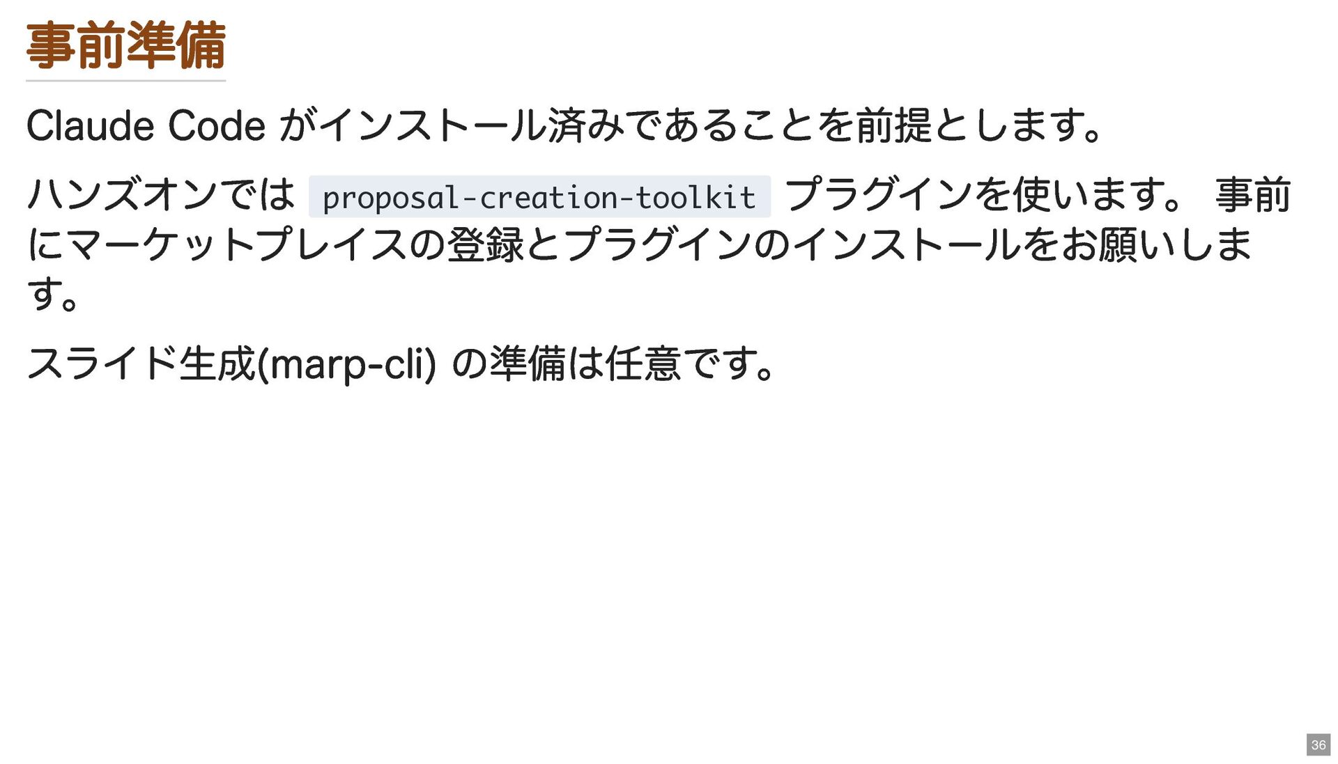 事前準備 Claude Code がインストール済みであることを前提とします。 ハンズオンでは proposal-creation-toolkit プラグインを使います。 事前 にマーケットプレイスの登録とプラグインのインストールをお願いしま す。