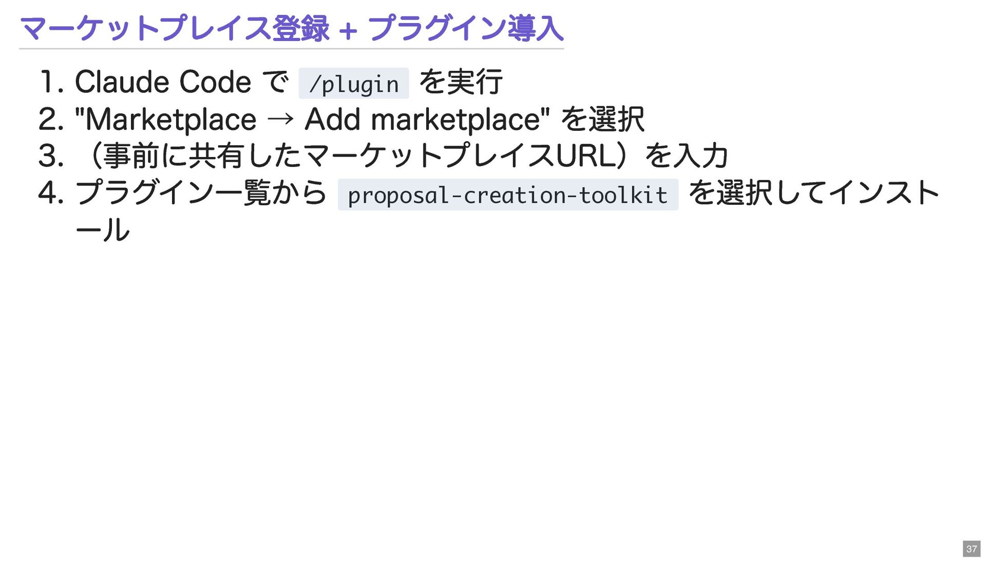 "Marketplace → Add marketplace" を選択 3. (事前に共有したマーケットプレイスURL)を入力 4. プラグイン一覧から proposal-creation-toolkit を選択してインスト ール 37