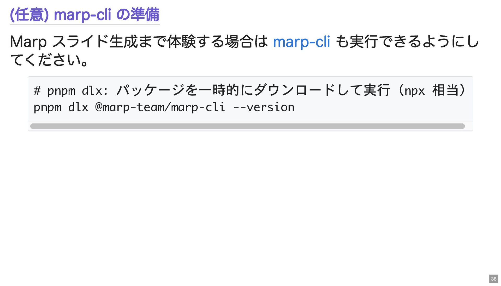 (任意) marp-cli の準備 Marp スライド生成まで体験する場合は も実行できるようにし てください。 marp-cli # pnpm
