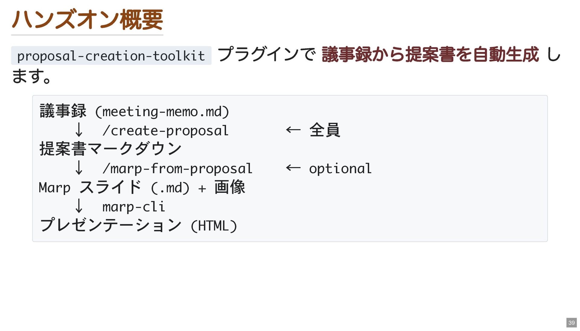 ← 全員 提案書マークダウン ↓ /marp-from-proposal ← optional Marp スライド (.md) + 画像 ↓ marp-cli プレゼンテーション (HTML) 39