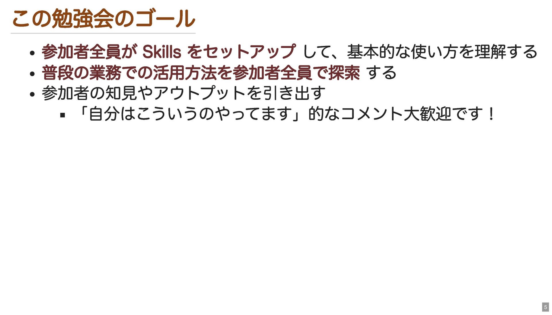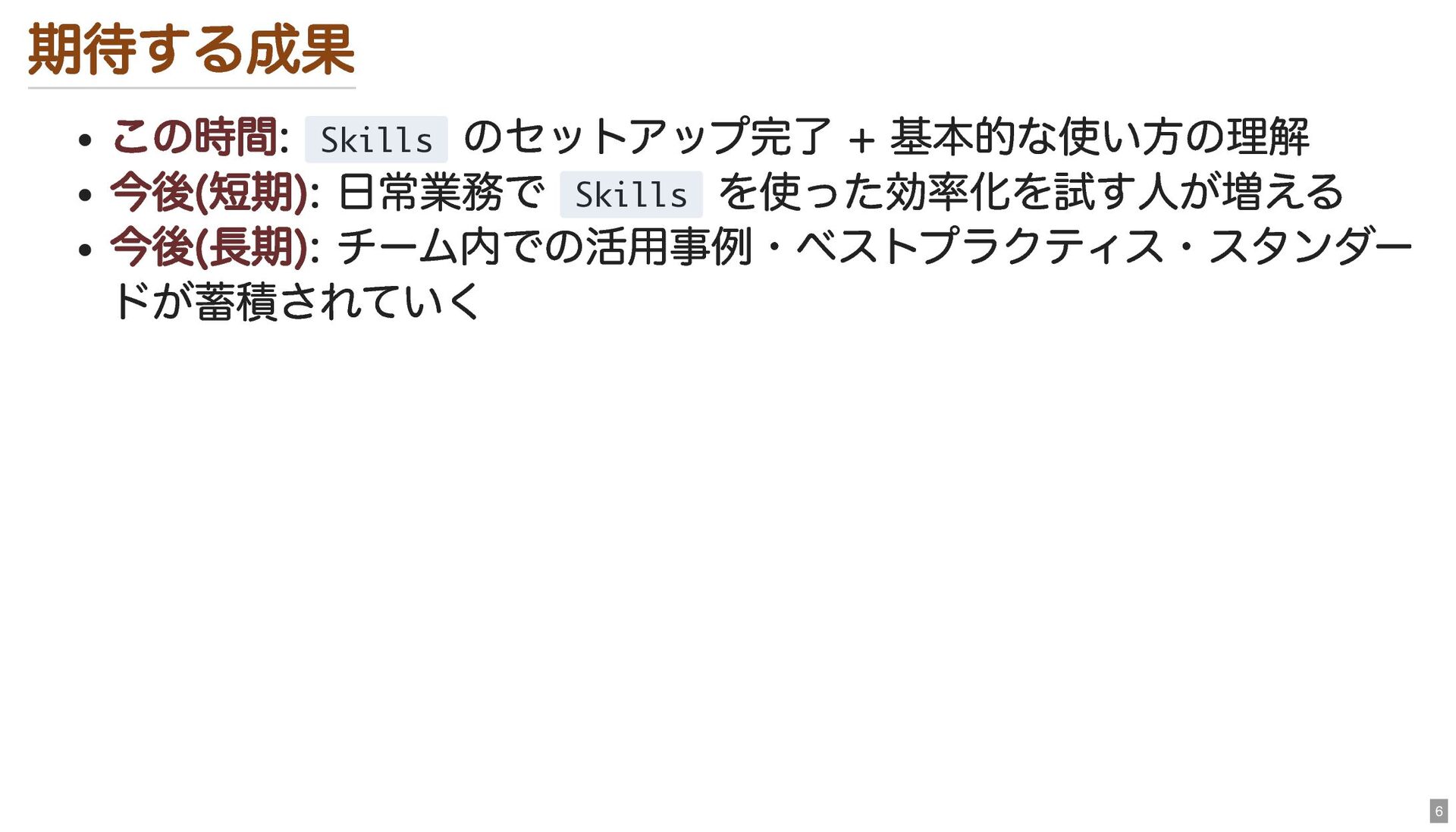 期待する成果 この時間: Skills のセットアップ完了 + 基本的な使い方の理解 今後(短期): 日常業務で Skills を使った効率化を試す人が増える