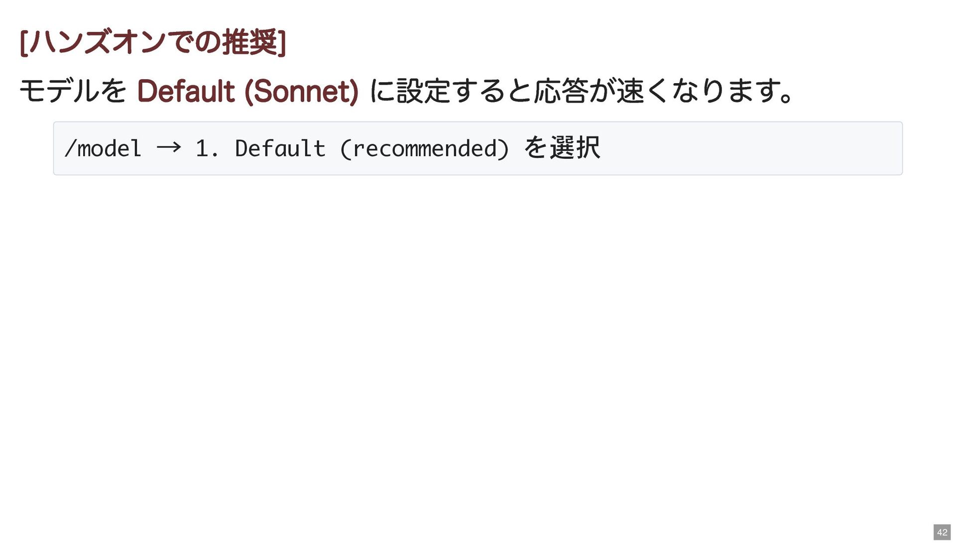 [ハンズオンでの推奨] モデルを Default (Sonnet) に設定すると応答が速くなります。 /model → 1. Default (recommended)