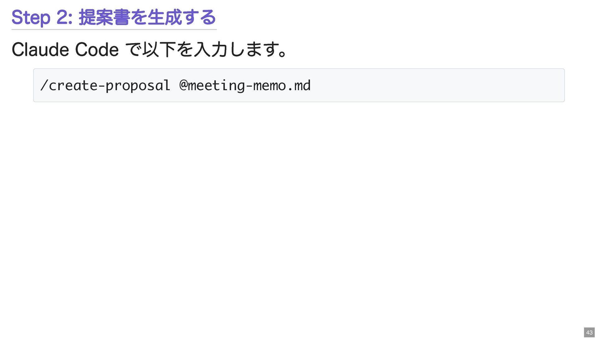 Step 2: 提案書を生成する Claude Code で以下を入力します。 /create-proposal @meeting-memo.md 43