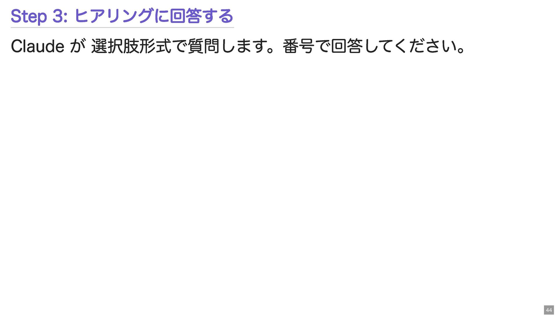 Step 3: ヒアリングに回答する Claude が 選択肢形式で質問します。番号で回答してください。 44