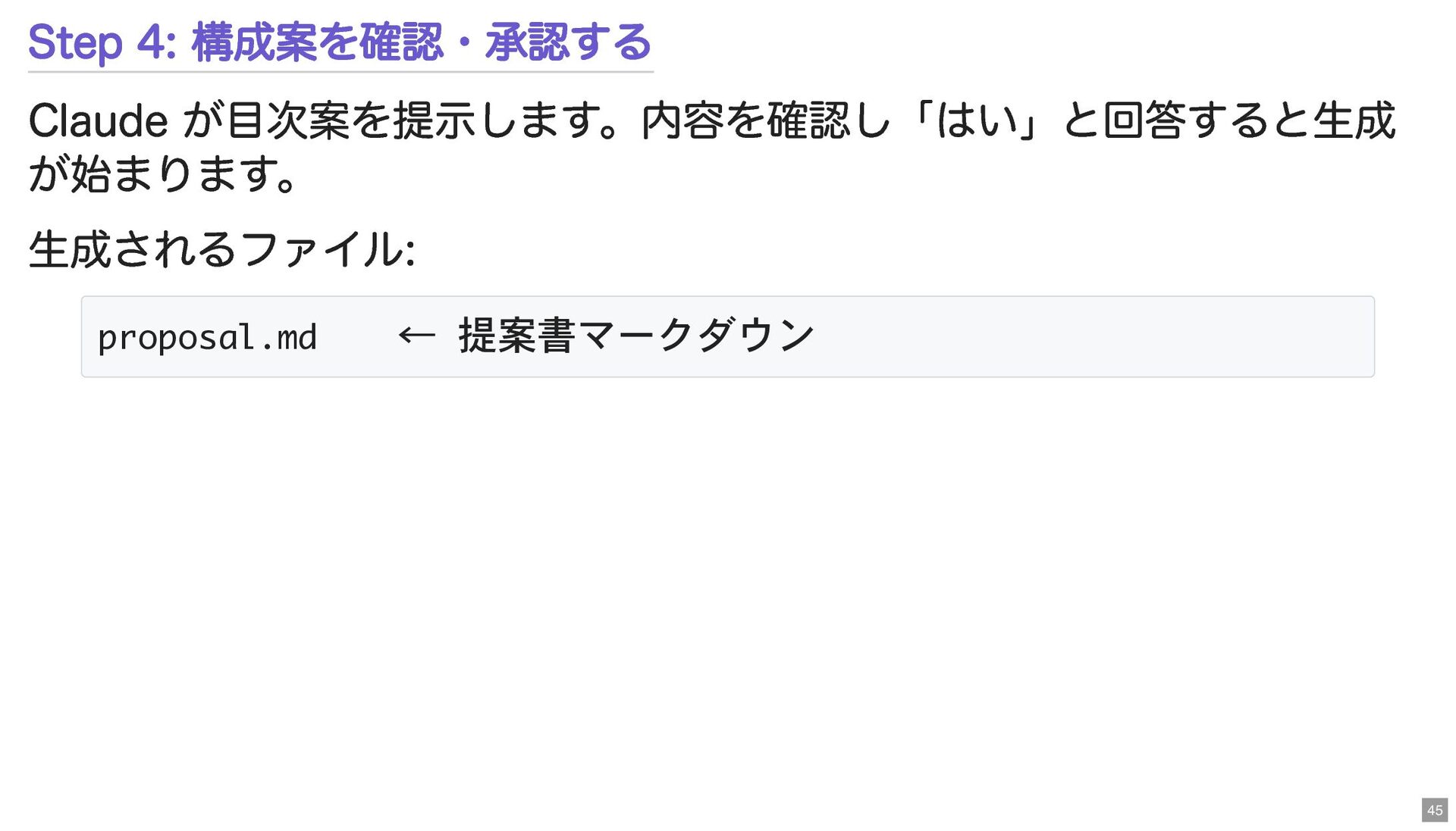 Step 4: 構成案を確認・承認する Claude が目次案を提示します。内容を確認し「はい」と回答すると生成 が始まります。 生成されるファイル: proposal.md ← 提案書マークダウン