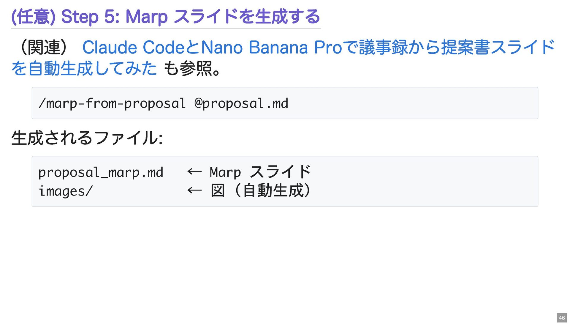 Banana Proで議事録から提案書スライド を自動生成してみた /marp-from-proposal @proposal.md proposal_marp.md ← Marp スライド images/ ← 図(自動生成) 46