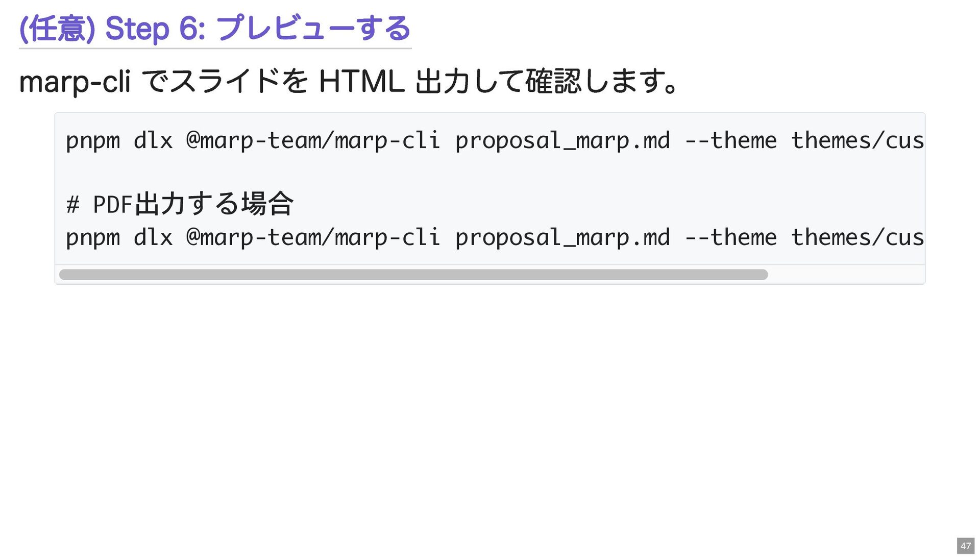 (任意) Step 6: プレビューする marp-cli でスライドを HTML 出力して確認します。 pnpm dlx