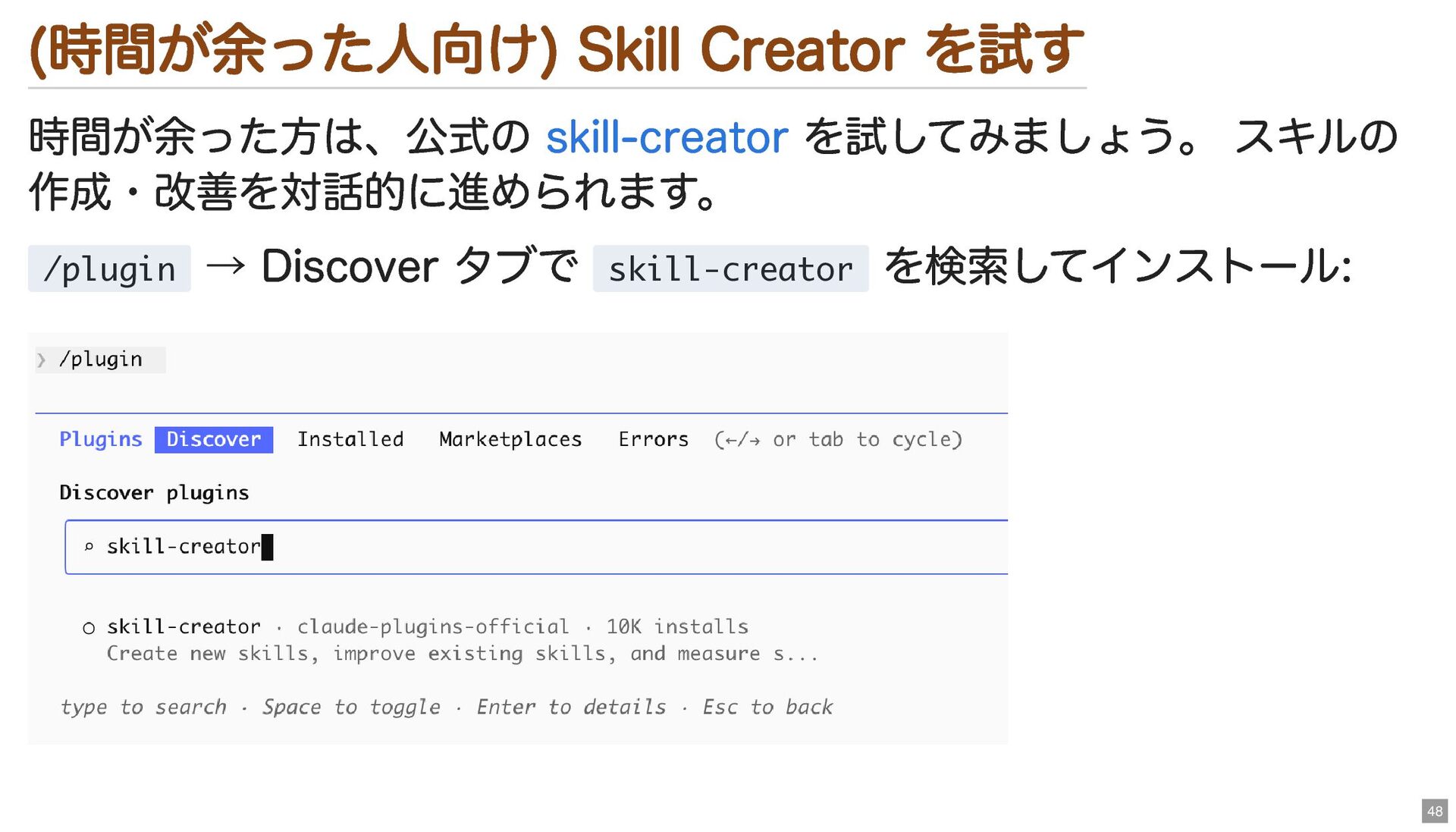 (時間が余った人向け) Skill Creator を試す 時間が余った方は、公式の を試してみましょう。 スキルの 作成・改善を対話的に進められます。 /plugin →