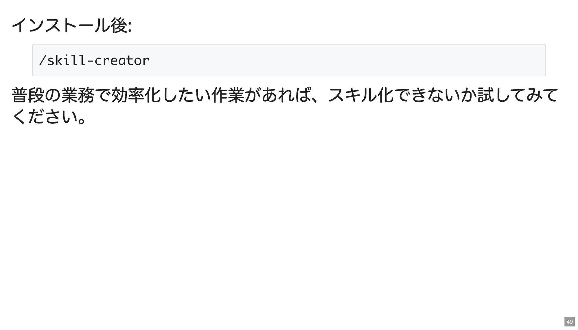インストール後: 普段の業務で効率化したい作業があれば、スキル化できないか試してみて ください。 /skill-creator 49