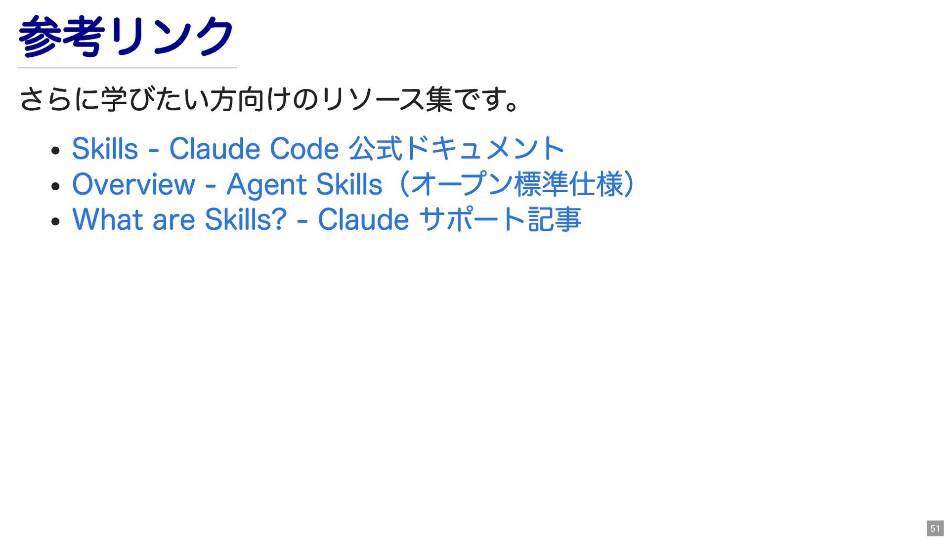 SKILL.md・段階的情報開示 スキル活用のTips : 他の仕組み(CLAUDE.md / MCP / Subagents)との使い分け ハンズオン : proposal-creation-toolkit で議事録→提案書→スライド 生成 50
