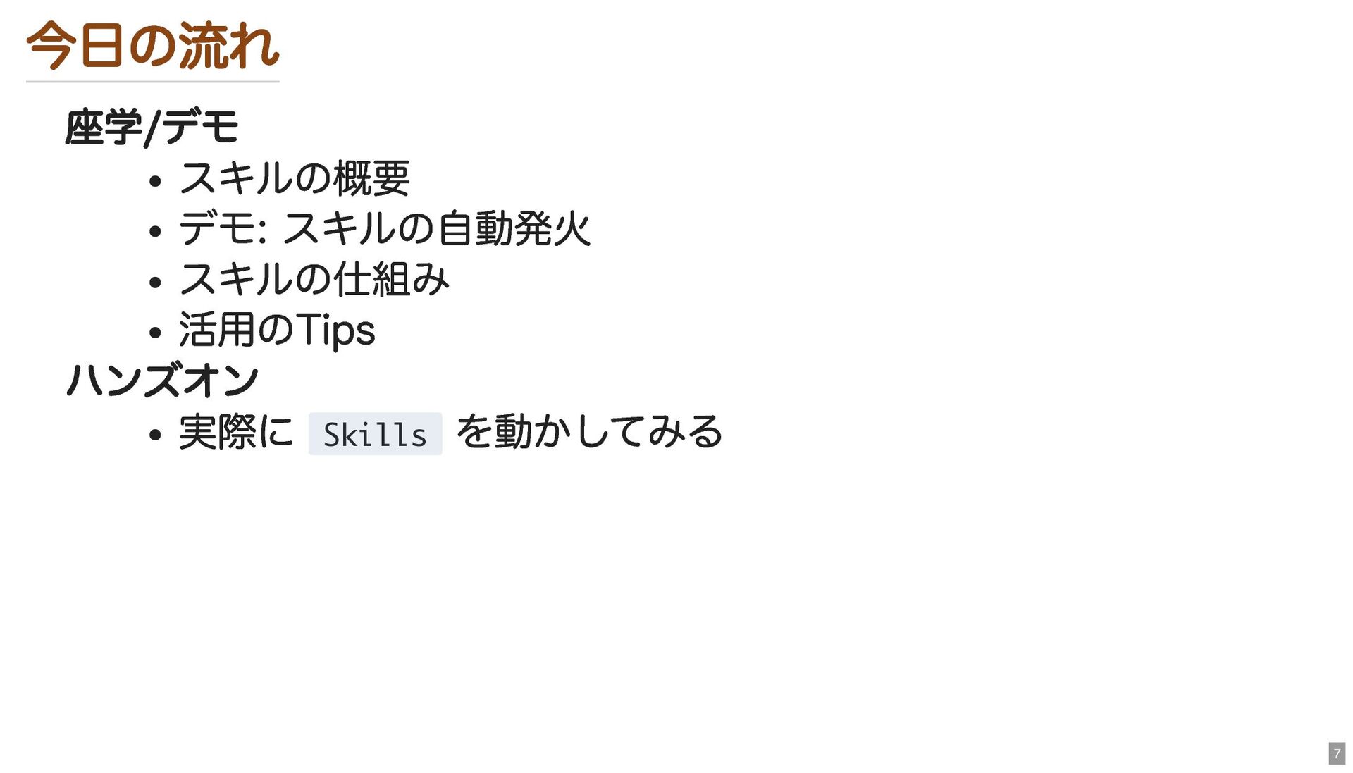 今日の流れ 座学/デモ スキルの概要 デモ: スキルの自動発火 スキルの仕組み 活用のTips ハンズオン 実際に Skills