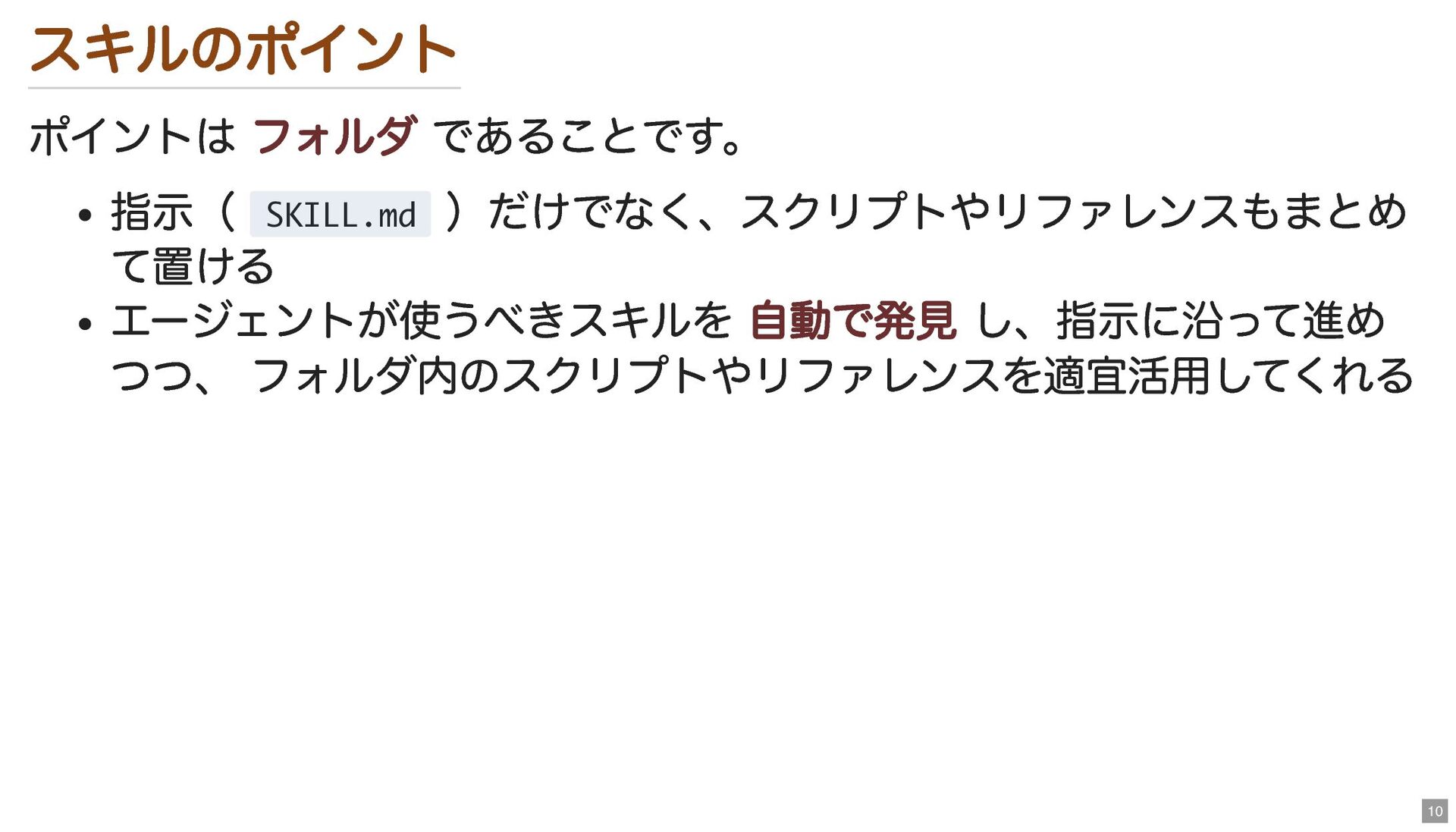 スキルのポイント ポイントは フォルダ であることです。 指示( SKILL.md )だけでなく、スクリプトやリファレンスもまとめ て置ける エージェントが使うべきスキルを 自動で発見