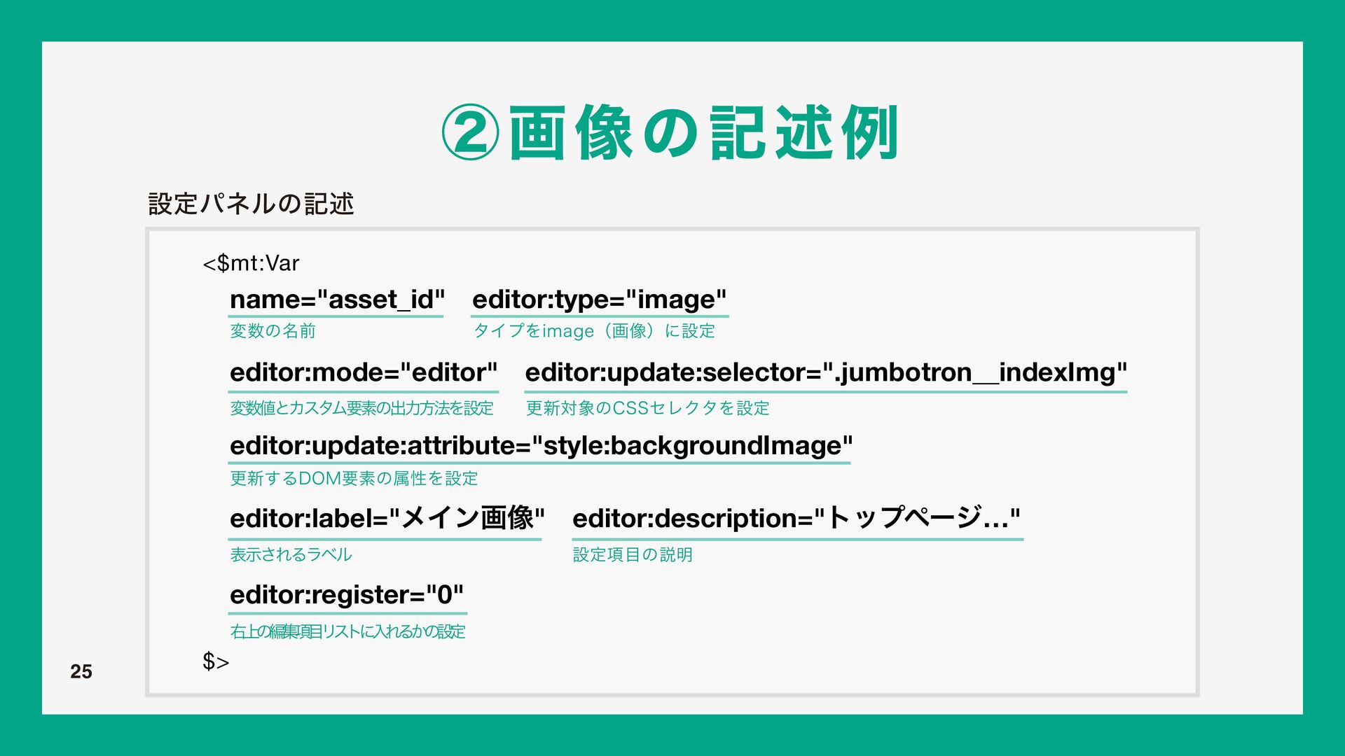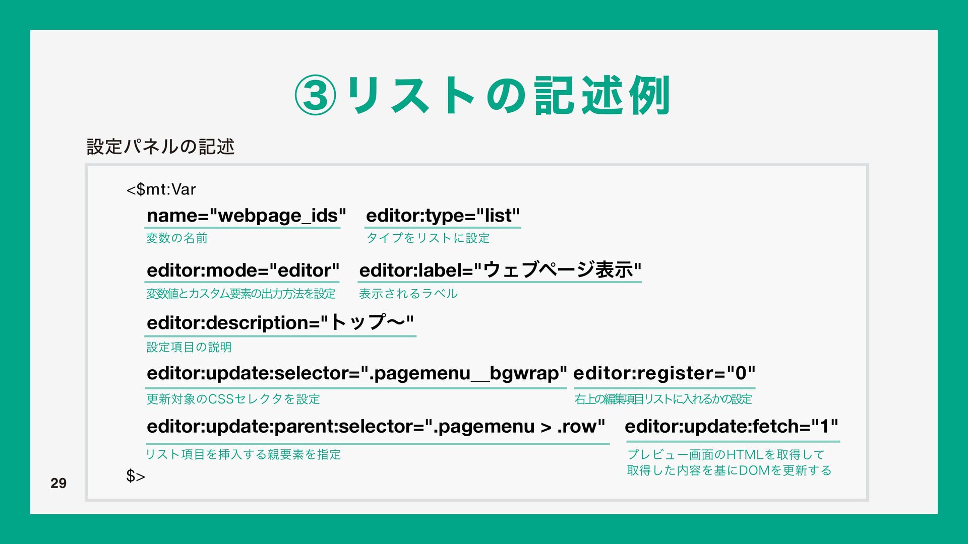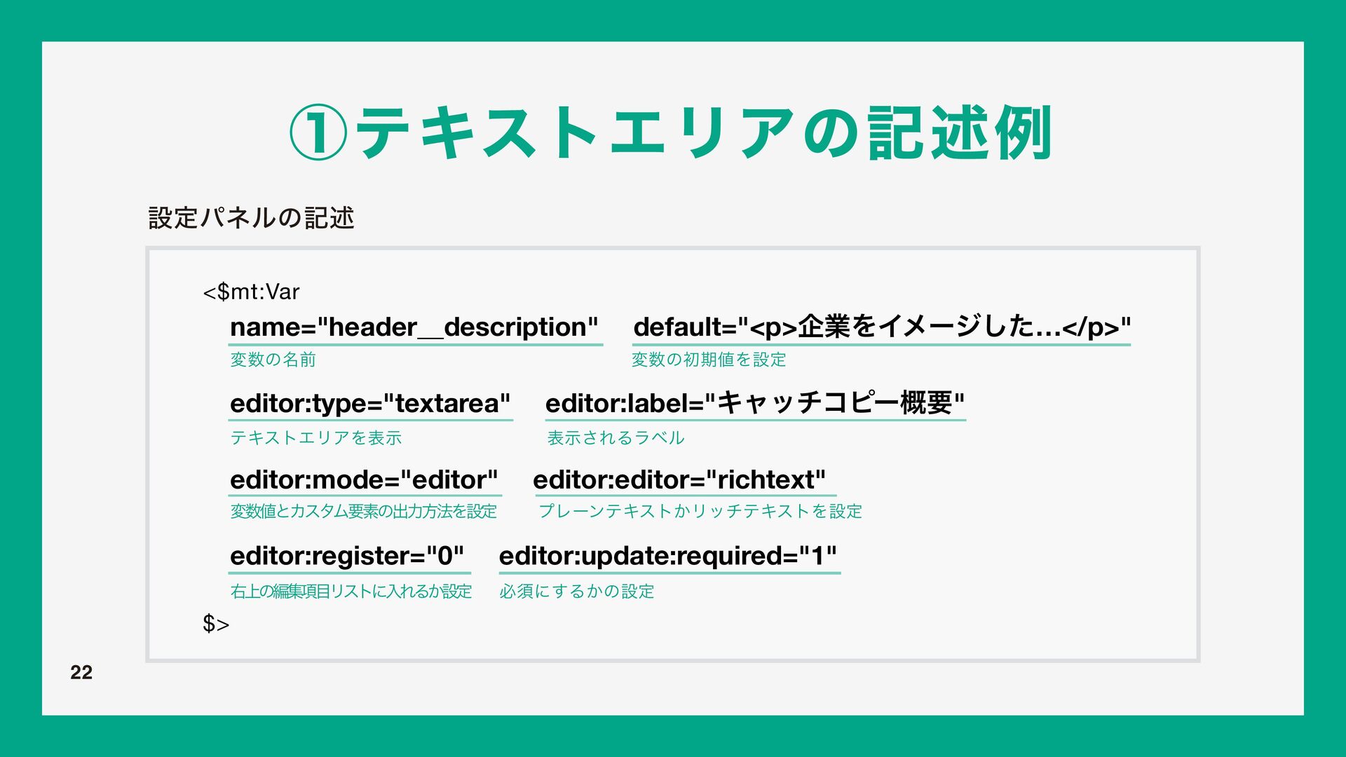 w FEJUPSUZQF ඞਢ߲ ͔ΜͨΜσβΠϯฤूը໘Ͱ͜ͷNU7BSʹΛઃఆ͢ΔͨΊʹ͏ΤσΟλΛ ࢦఆ͠·͢ɻΤσΟλͷछྨʹ͍ͭͯޙड़͠·͢ɻ w FEJUPSMBCFM ͜ͷίϯϙʔωϯτͷ໊শͰɺӈ্ͷϝχϡʔೖྗϑΟʔϧυͷϥϕϧͱͯ͠ར༻͞Ε·͢ɻ w FEJUPSEFTDSJQUJPO ͜ͷίϯϙʔωϯτͷิઆ໌ͰɺೖྗϑΟʔϧυͷԼଆʹઃఆͨ͠༰͕දࣔ͞Ε·͢ɻ