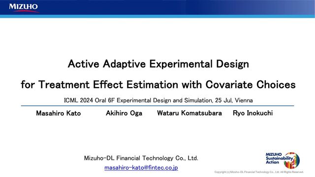 Thank you for your attention! Reference • Hahn, J., Hirano, K., and Karlan, D. Adaptive experimental design using the propensity score. Journal of Business and Economic Statistics, 2011. • Kato, M., Ishihara, T., Honda, J., and Narita, Y. Adaptive experimental design for efficient treatment effect estimation: Randomized allocation via contextual bandit algorithm. arXiv:2002.05308, 2020. • Shimodaira, H., “Improving predictive inference under covariate shift by weighting the log-likelihood function,” Journal of statistical planning and inference, 2010. • Sugiyama, M. Active learning in approximately linear regression based on conditional expectation of generalization error. Journal of Machine Learning Research, 2006. • Uehara, M., Kato, M., and Yasui, S., Off-Policy Evaluation and Learning for External Validity under a Covariate Shift. In NeurIPS 2020