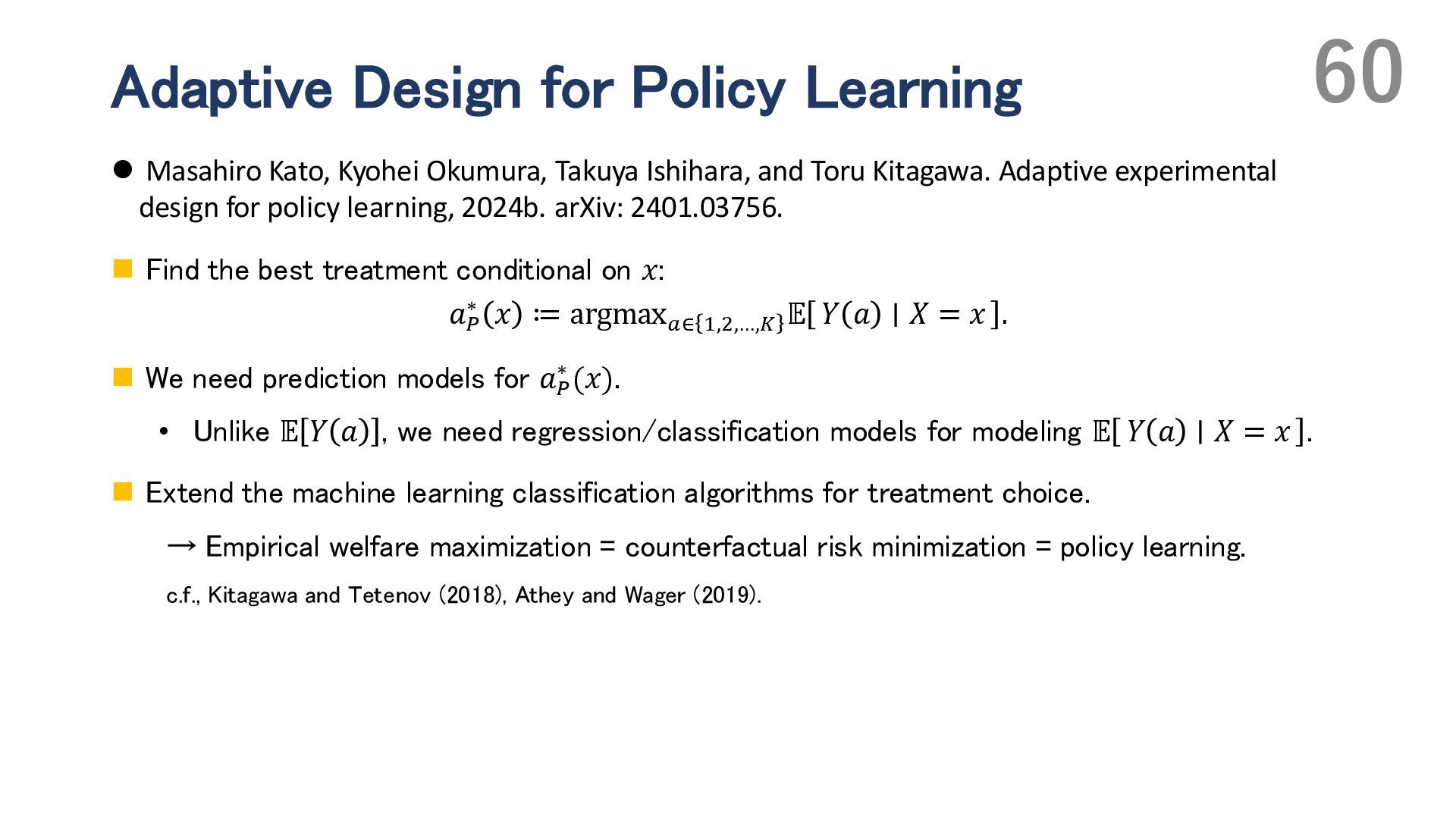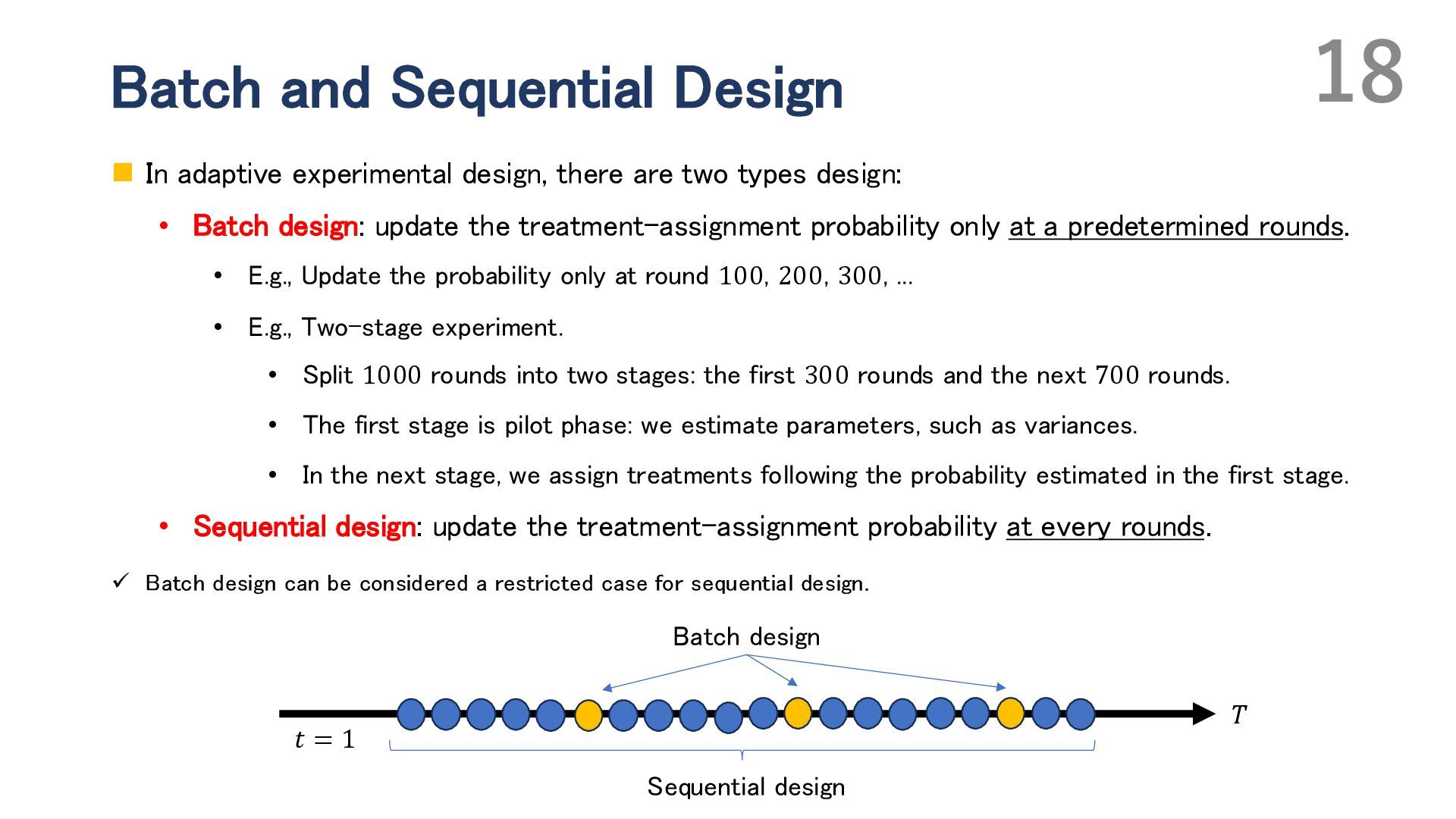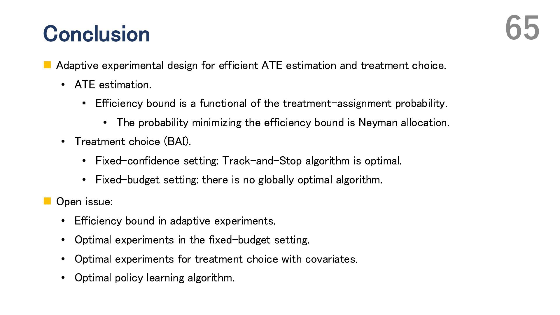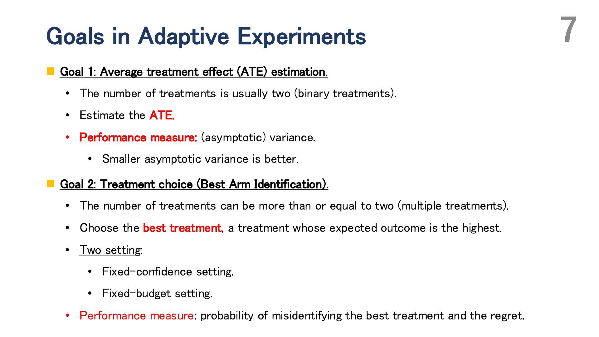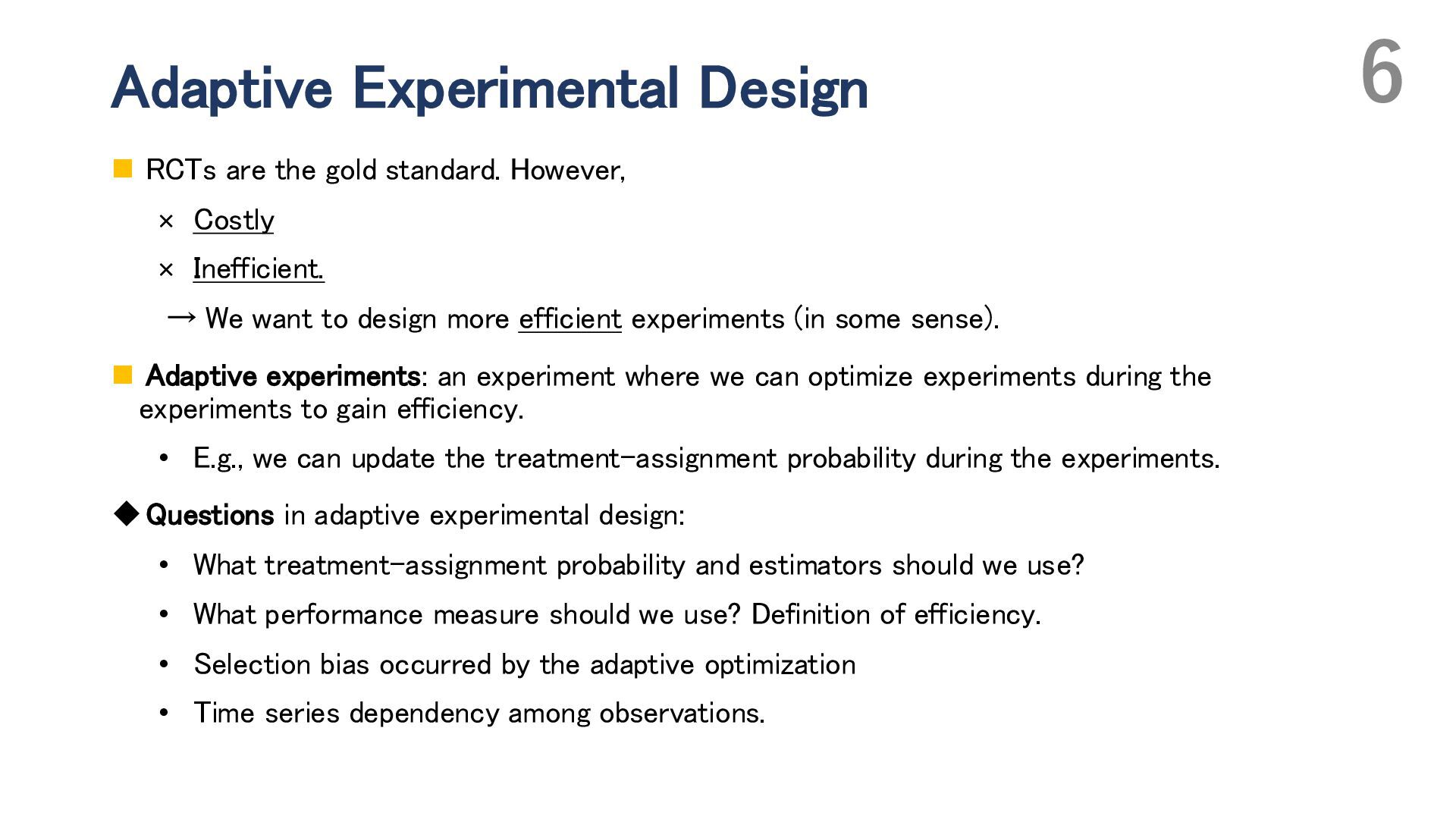 Adaptive experimental design has attracted attention for improving the efficiency of both average treatment effect (ATE) estimation and treatment choice. In such designs, the probability of assigning treatments (i.e., the propensity score) can be updated during the experiment based on previously collected observations. In ATE estimation, the objective is to reduce the estimation error of the ATE, whereas in treatment choice, the goal is to identify the best treatment—the one with the highest expected outcome. While ATE estimation typically involves binary treatments, treatment choice problems often consider multiple treatment options. In this talk, I begin by discussing adaptive experimental design for ATE estimation. I introduce the basic approach based on Neyman allocation, which provides a treatment-assignment probability that minimizes the asymptotic variance of ATE estimators, and then present several extensions, including adaptive optimization of the covariate distribution. Next, I address adaptive experimental design for treatment choice, also known as the best-arm identification problem, and highlight the challenges in developing “optimal” algorithms, especially in the presence of multiple treatments. I propose minimax and Bayes optimal algorithms for treatment choice in the setting without covariates. In particular, I generalize Neyman allocation to construct a minimax optimal algorithm. Finally, I discuss how incorporating covariates can further enhance the efficiency of treatment choice, focusing on conditional treatment choice (policy learning).