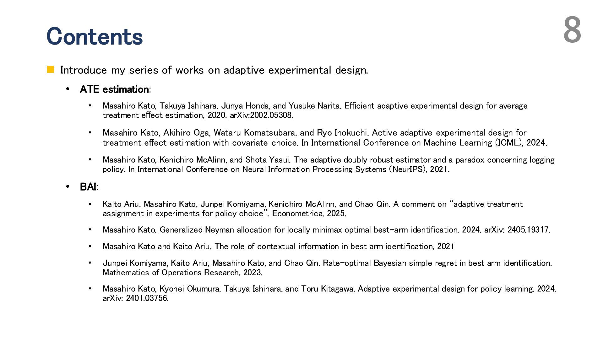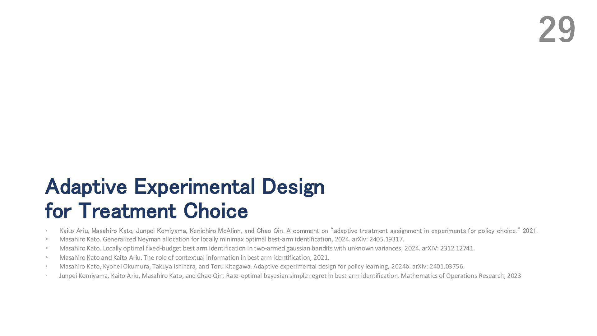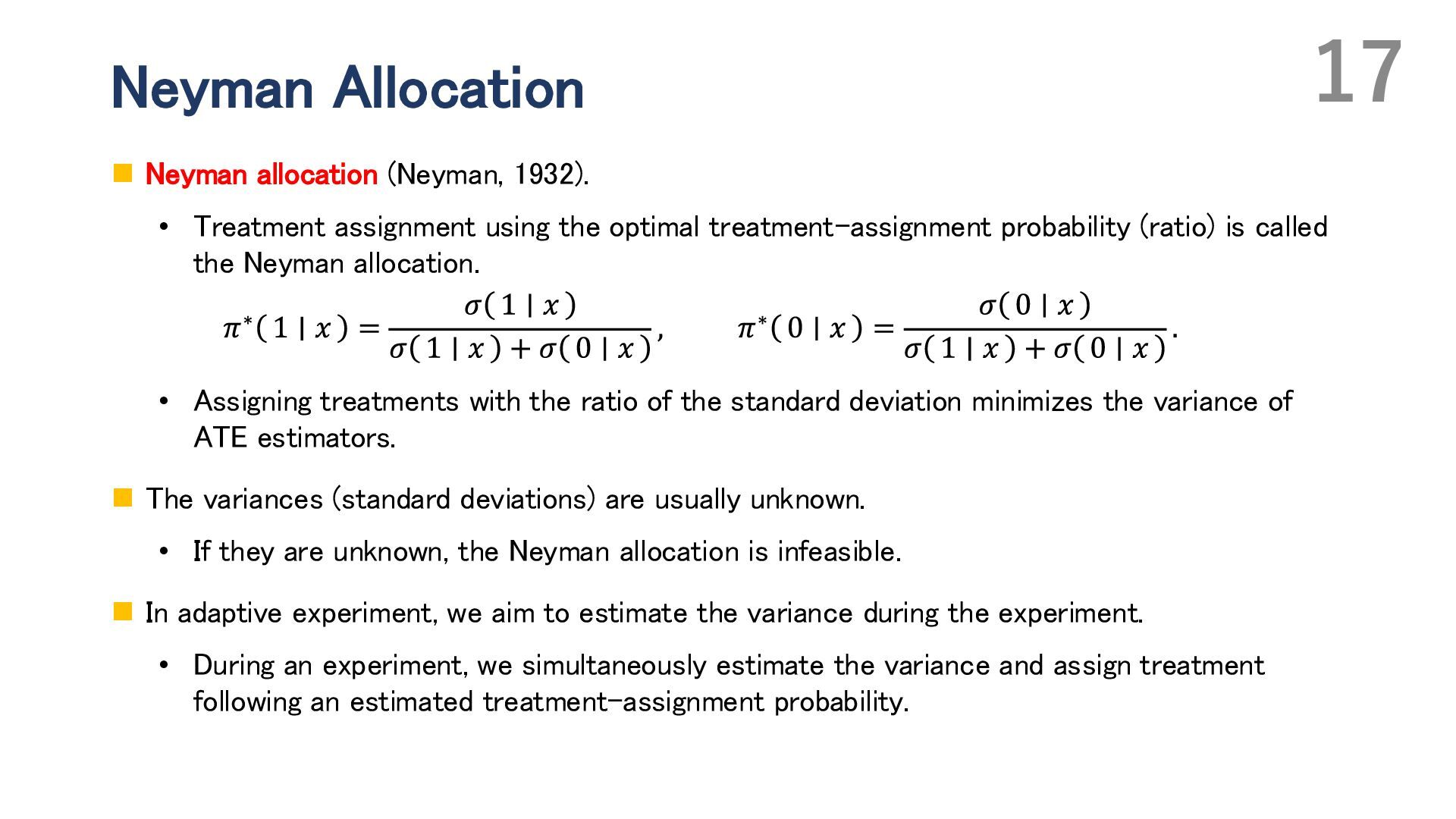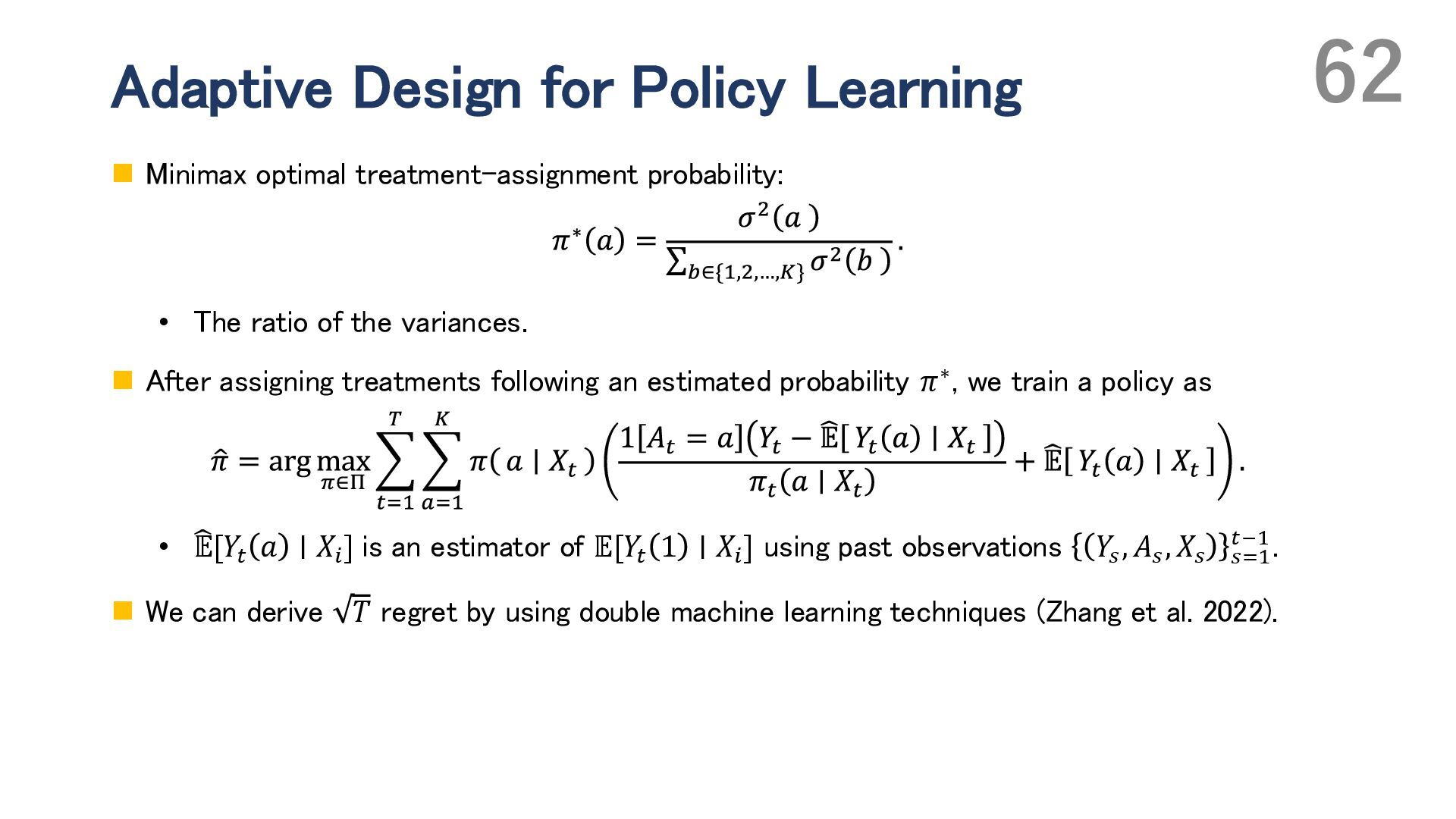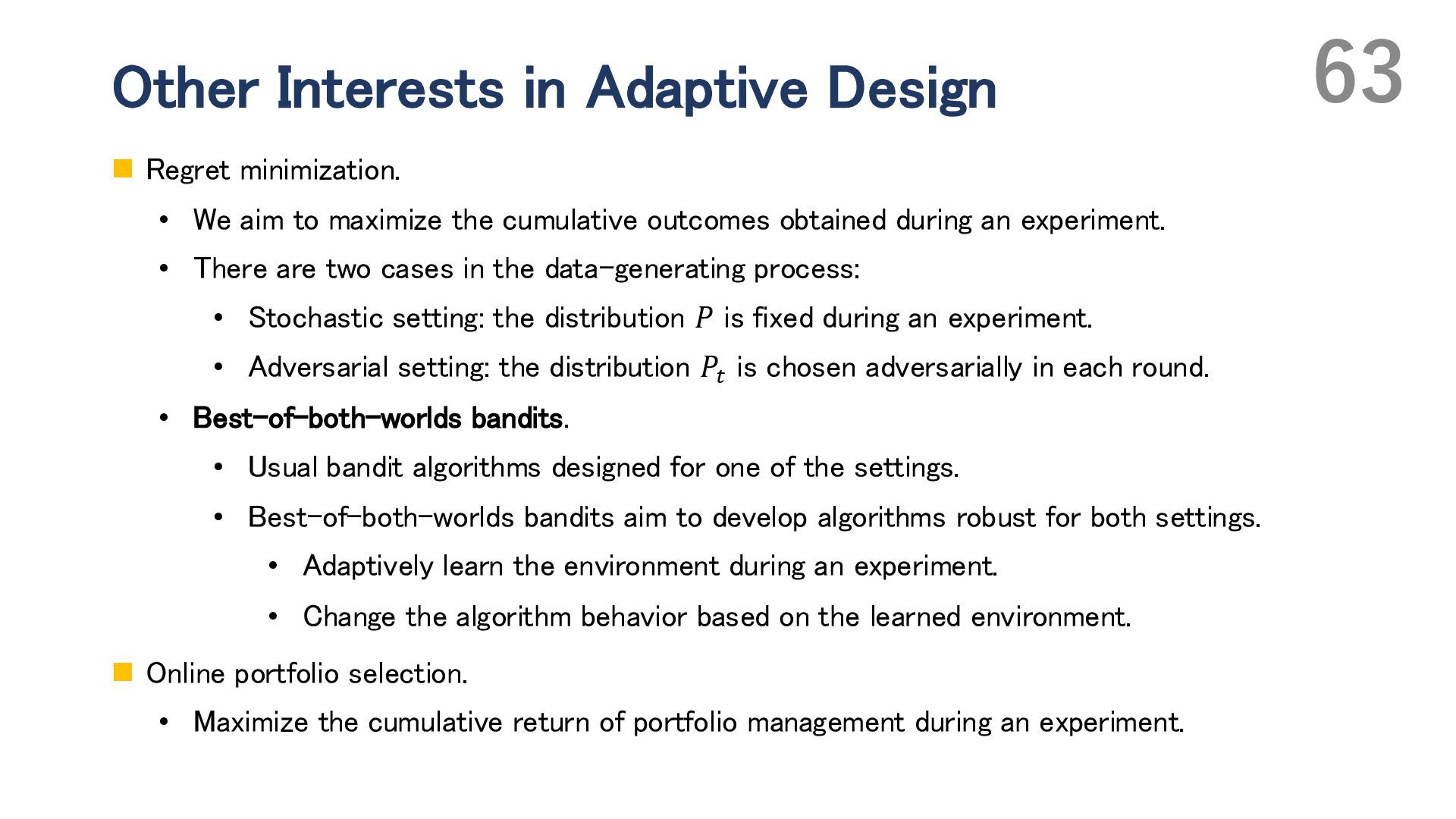 Adaptive experimental design has attracted attention for improving the efficiency of both average treatment effect (ATE) estimation and treatment choice. In such designs, the probability of assigning treatments (i.e., the propensity score) can be updated during the experiment based on previously collected observations. In ATE estimation, the objective is to reduce the estimation error of the ATE, whereas in treatment choice, the goal is to identify the best treatment—the one with the highest expected outcome. While ATE estimation typically involves binary treatments, treatment choice problems often consider multiple treatment options. In this talk, I begin by discussing adaptive experimental design for ATE estimation. I introduce the basic approach based on Neyman allocation, which provides a treatment-assignment probability that minimizes the asymptotic variance of ATE estimators, and then present several extensions, including adaptive optimization of the covariate distribution. Next, I address adaptive experimental design for treatment choice, also known as the best-arm identification problem, and highlight the challenges in developing “optimal” algorithms, especially in the presence of multiple treatments. I propose minimax and Bayes optimal algorithms for treatment choice in the setting without covariates. In particular, I generalize Neyman allocation to construct a minimax optimal algorithm. Finally, I discuss how incorporating covariates can further enhance the efficiency of treatment choice, focusing on conditional treatment choice (policy learning).