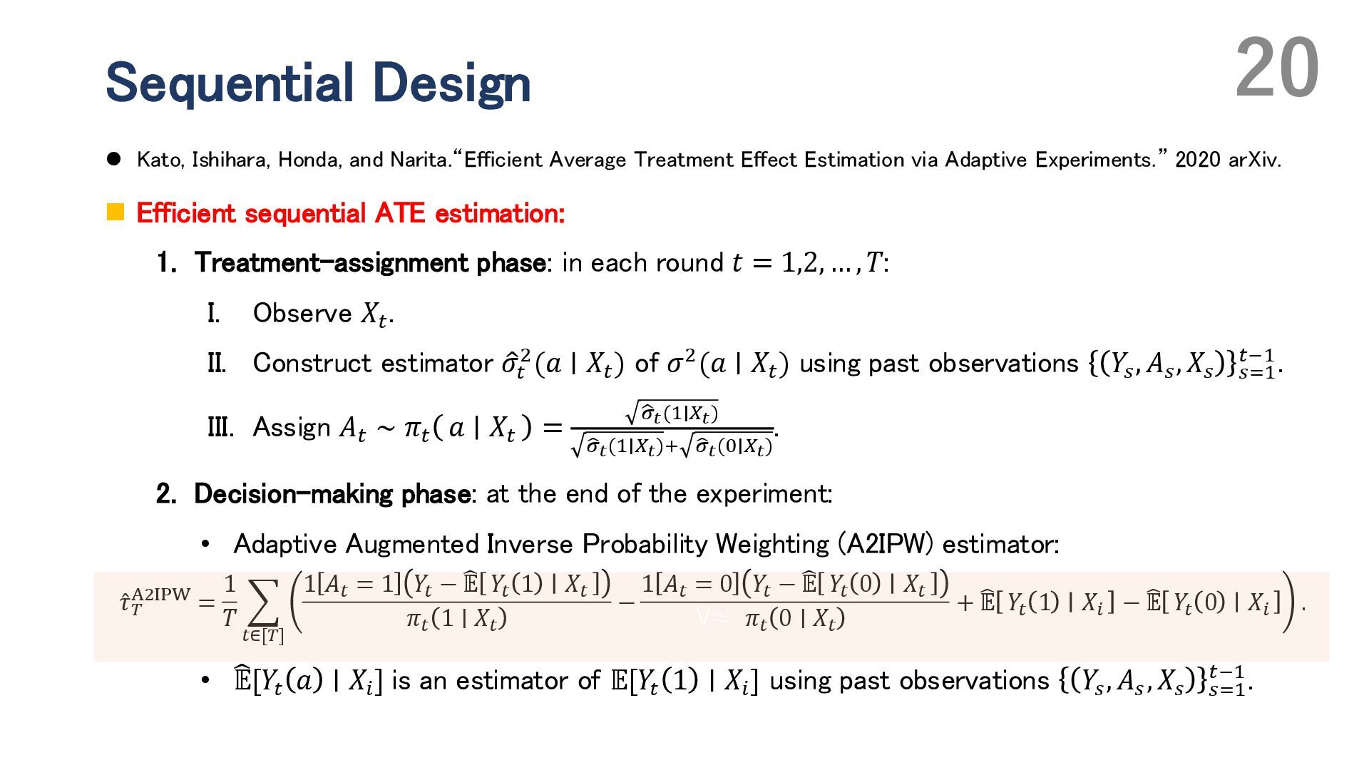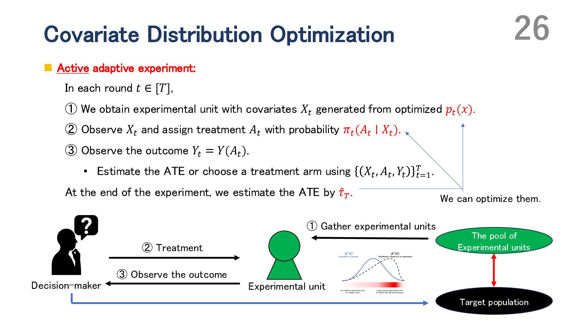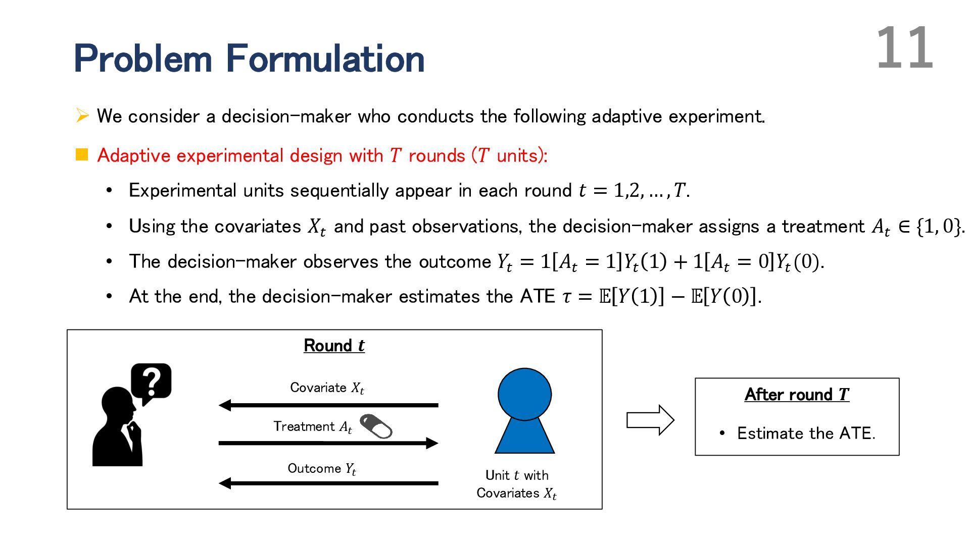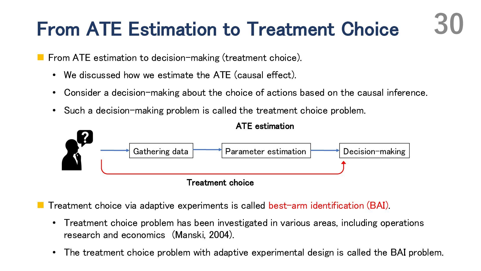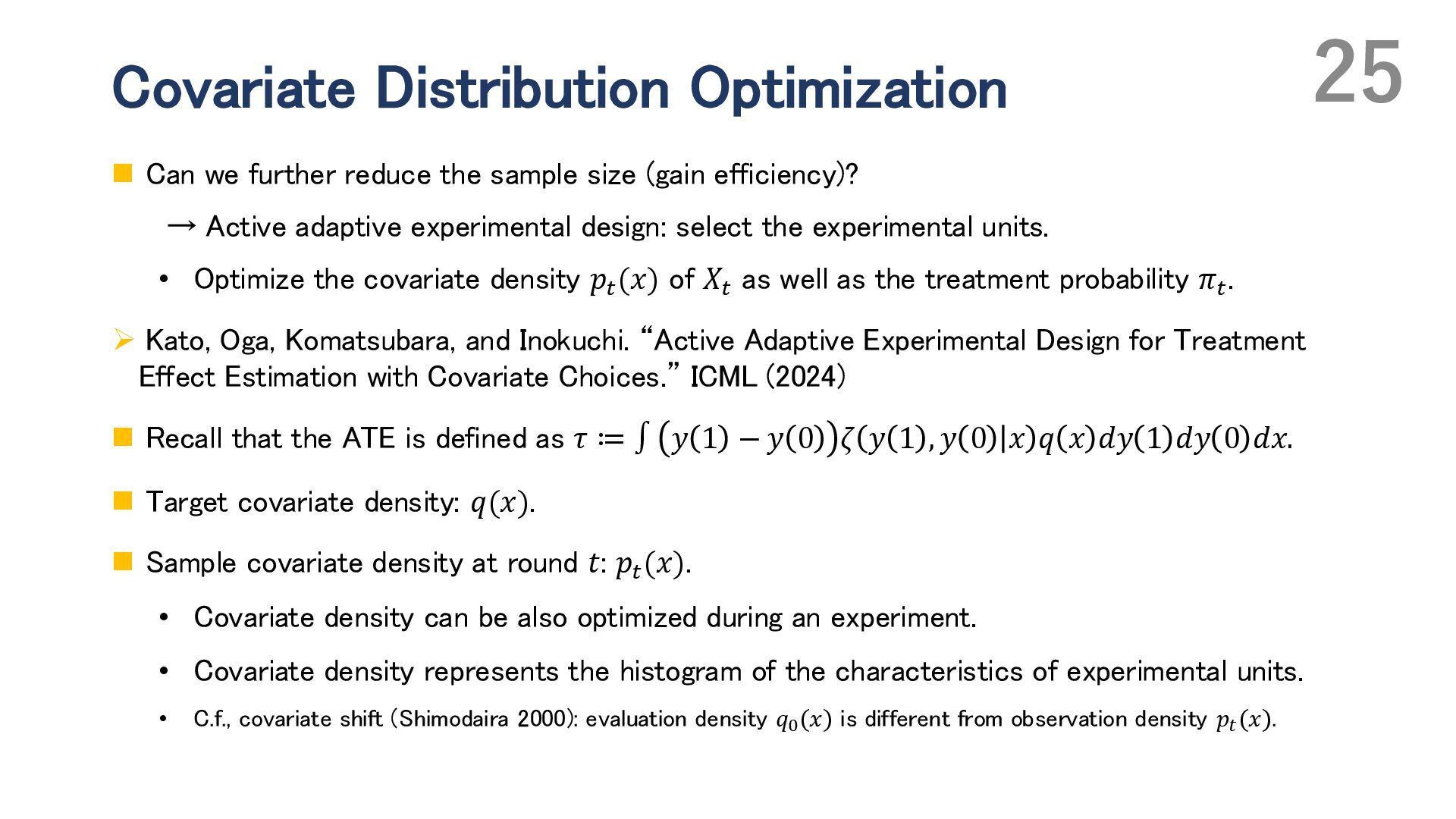 Adaptive experimental design has attracted attention for improving the efficiency of both average treatment effect (ATE) estimation and treatment choice. In such designs, the probability of assigning treatments (i.e., the propensity score) can be updated during the experiment based on previously collected observations. In ATE estimation, the objective is to reduce the estimation error of the ATE, whereas in treatment choice, the goal is to identify the best treatment—the one with the highest expected outcome. While ATE estimation typically involves binary treatments, treatment choice problems often consider multiple treatment options. In this talk, I begin by discussing adaptive experimental design for ATE estimation. I introduce the basic approach based on Neyman allocation, which provides a treatment-assignment probability that minimizes the asymptotic variance of ATE estimators, and then present several extensions, including adaptive optimization of the covariate distribution. Next, I address adaptive experimental design for treatment choice, also known as the best-arm identification problem, and highlight the challenges in developing “optimal” algorithms, especially in the presence of multiple treatments. I propose minimax and Bayes optimal algorithms for treatment choice in the setting without covariates. In particular, I generalize Neyman allocation to construct a minimax optimal algorithm. Finally, I discuss how incorporating covariates can further enhance the efficiency of treatment choice, focusing on conditional treatment choice (policy learning).