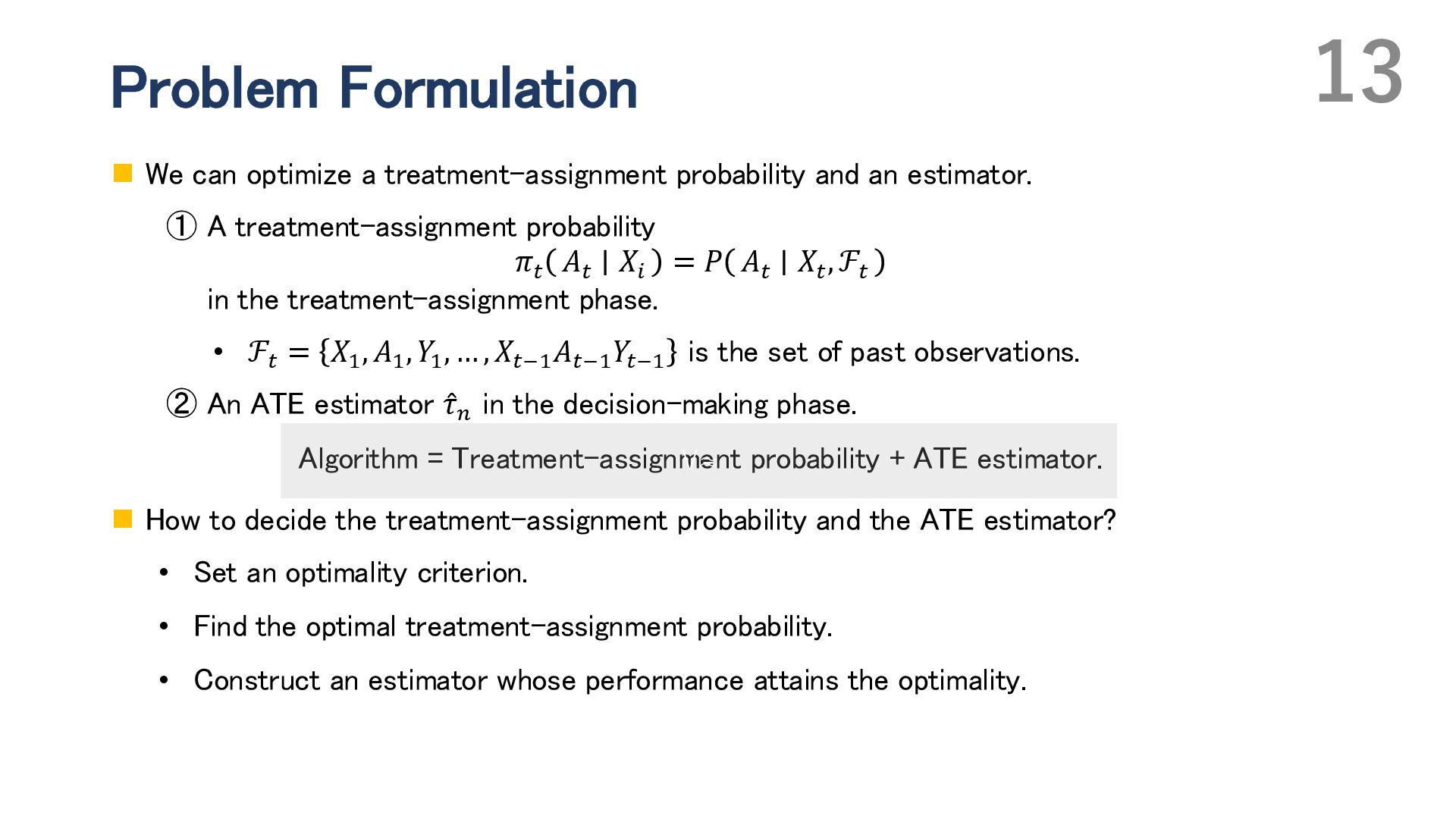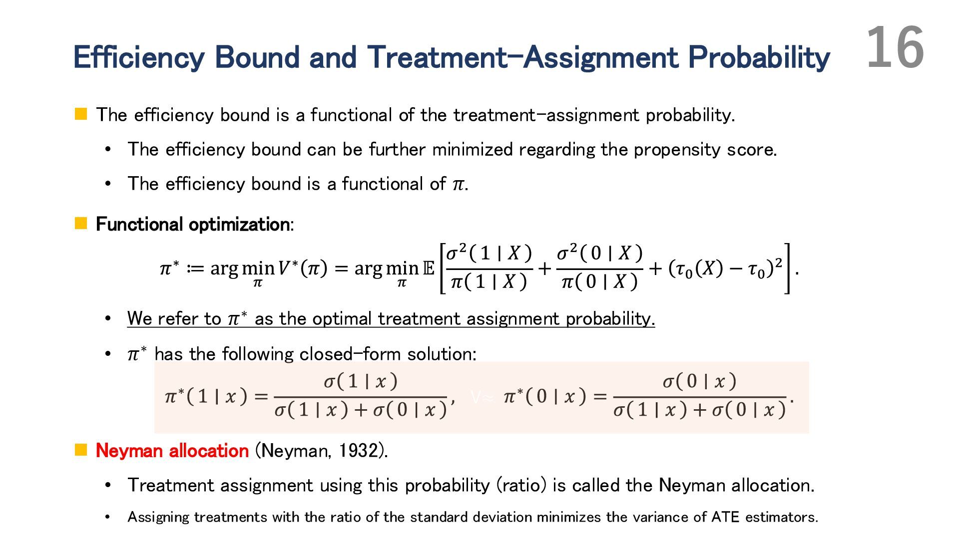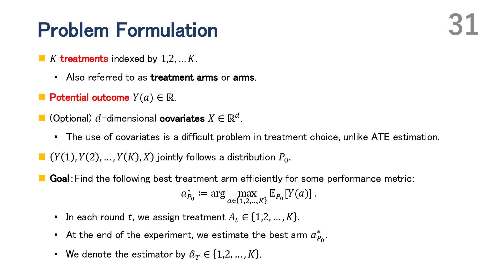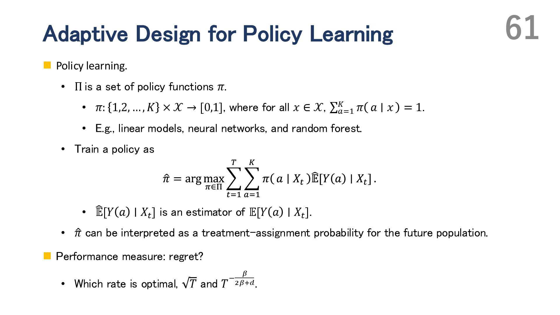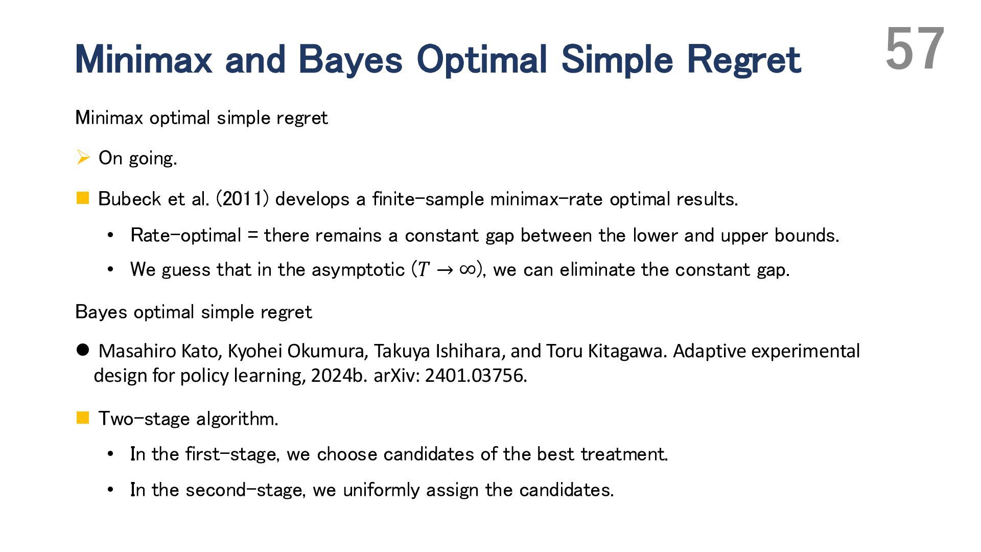 Adaptive experimental design has attracted attention for improving the efficiency of both average treatment effect (ATE) estimation and treatment choice. In such designs, the probability of assigning treatments (i.e., the propensity score) can be updated during the experiment based on previously collected observations. In ATE estimation, the objective is to reduce the estimation error of the ATE, whereas in treatment choice, the goal is to identify the best treatment—the one with the highest expected outcome. While ATE estimation typically involves binary treatments, treatment choice problems often consider multiple treatment options. In this talk, I begin by discussing adaptive experimental design for ATE estimation. I introduce the basic approach based on Neyman allocation, which provides a treatment-assignment probability that minimizes the asymptotic variance of ATE estimators, and then present several extensions, including adaptive optimization of the covariate distribution. Next, I address adaptive experimental design for treatment choice, also known as the best-arm identification problem, and highlight the challenges in developing “optimal” algorithms, especially in the presence of multiple treatments. I propose minimax and Bayes optimal algorithms for treatment choice in the setting without covariates. In particular, I generalize Neyman allocation to construct a minimax optimal algorithm. Finally, I discuss how incorporating covariates can further enhance the efficiency of treatment choice, focusing on conditional treatment choice (policy learning).