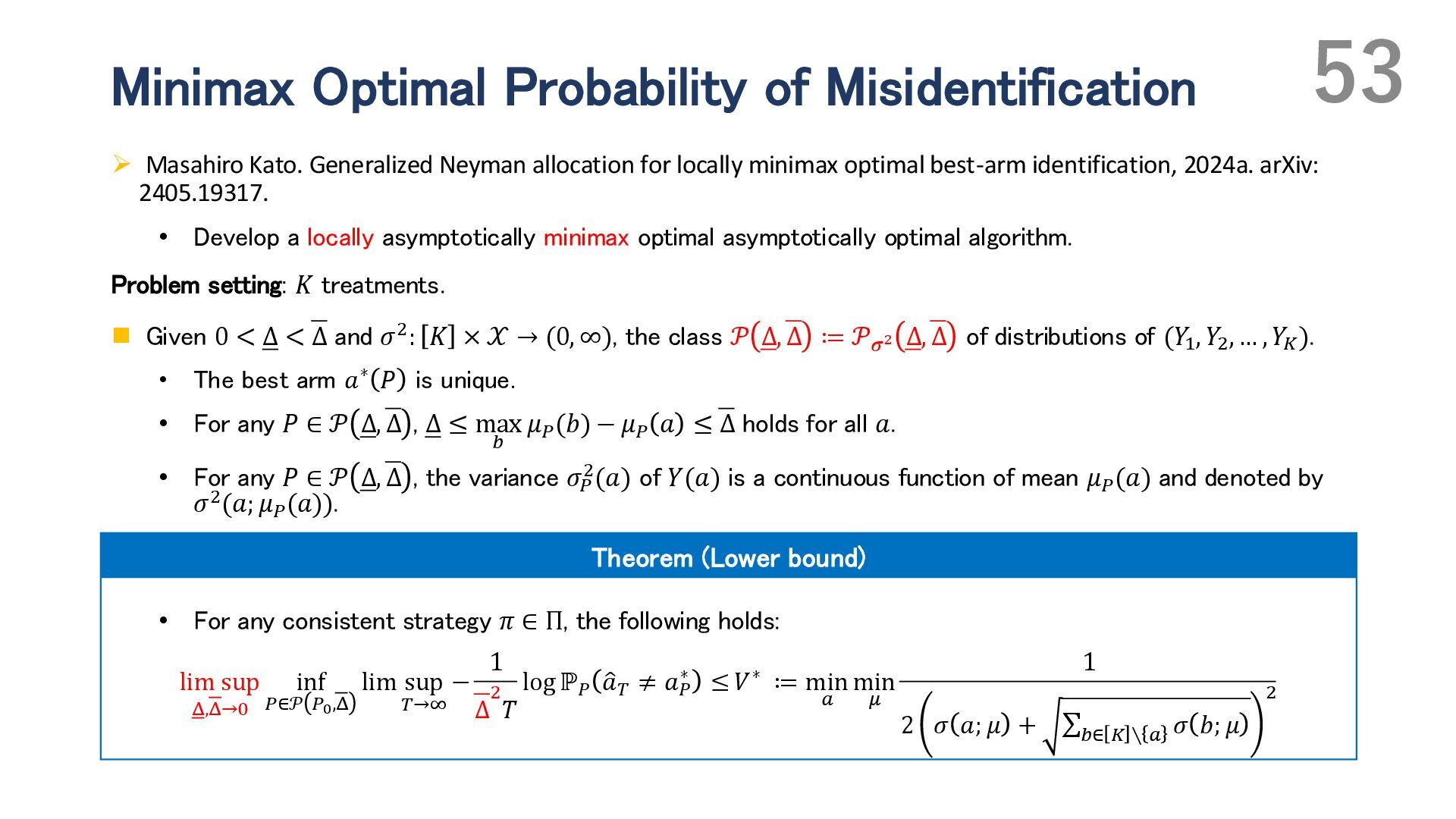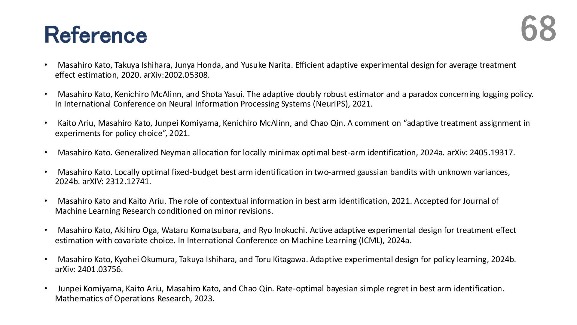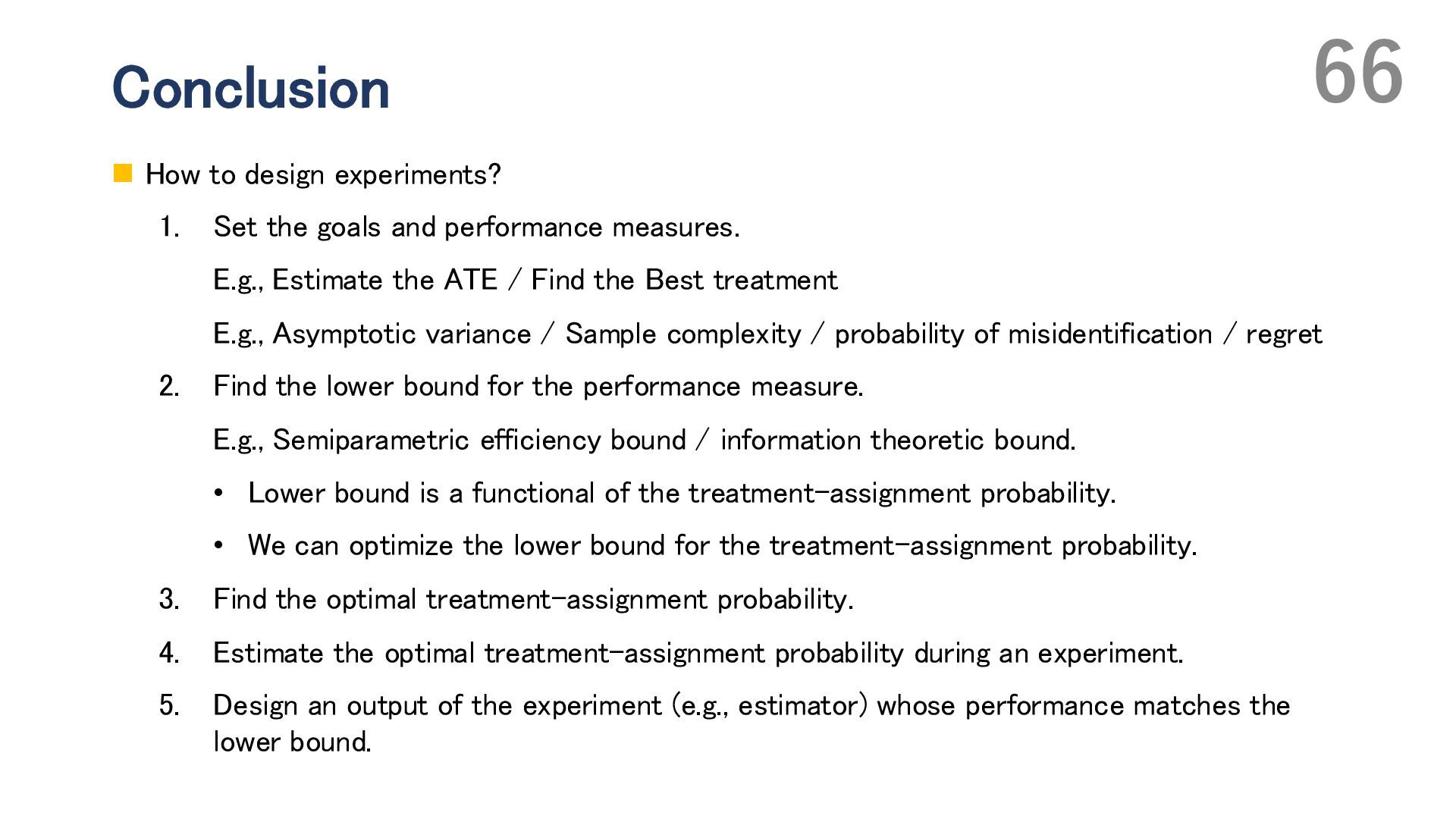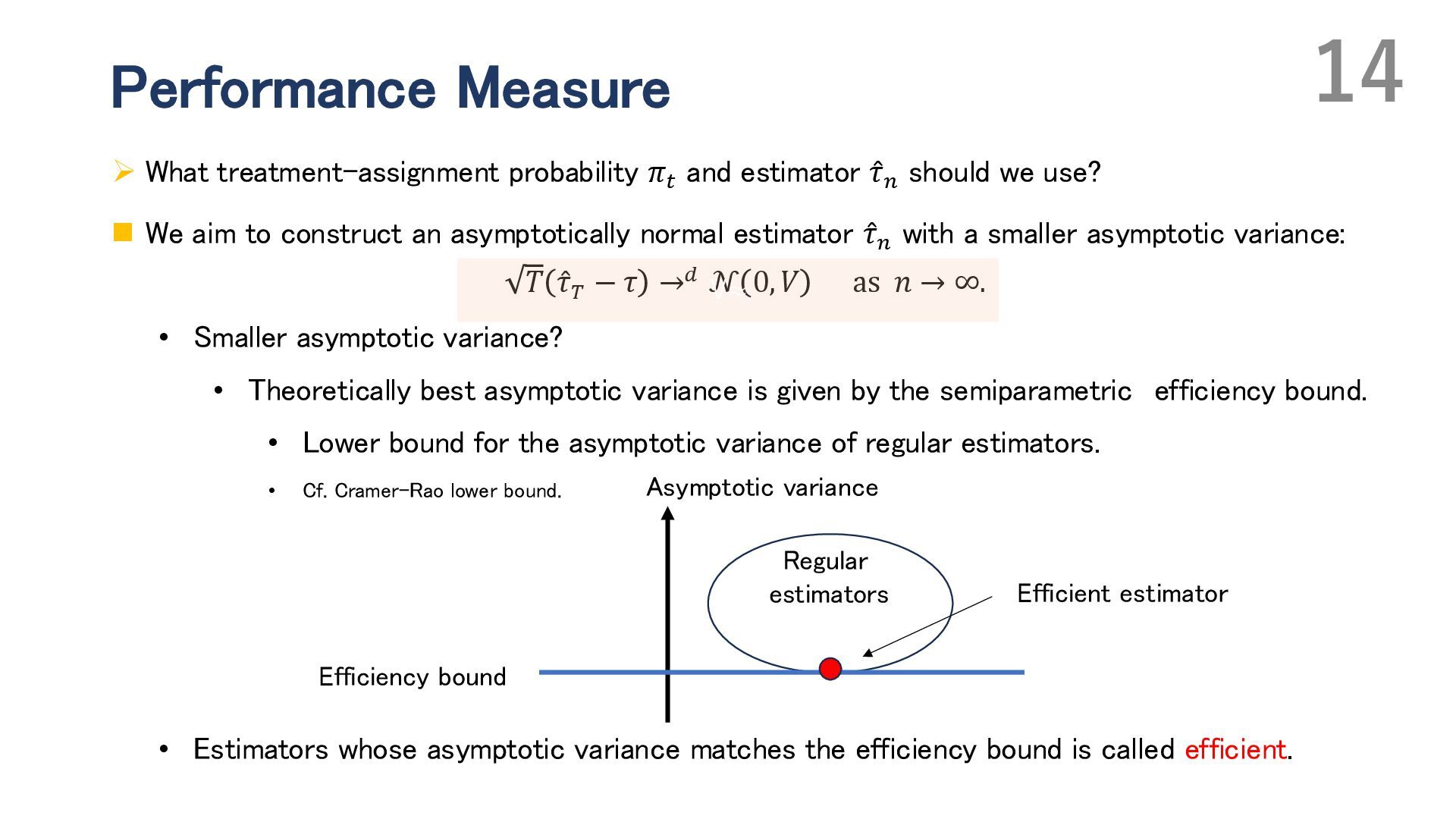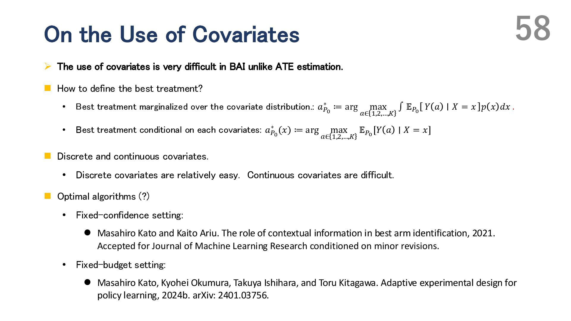 Adaptive experimental design has attracted attention for improving the efficiency of both average treatment effect (ATE) estimation and treatment choice. In such designs, the probability of assigning treatments (i.e., the propensity score) can be updated during the experiment based on previously collected observations. In ATE estimation, the objective is to reduce the estimation error of the ATE, whereas in treatment choice, the goal is to identify the best treatment—the one with the highest expected outcome. While ATE estimation typically involves binary treatments, treatment choice problems often consider multiple treatment options. In this talk, I begin by discussing adaptive experimental design for ATE estimation. I introduce the basic approach based on Neyman allocation, which provides a treatment-assignment probability that minimizes the asymptotic variance of ATE estimators, and then present several extensions, including adaptive optimization of the covariate distribution. Next, I address adaptive experimental design for treatment choice, also known as the best-arm identification problem, and highlight the challenges in developing “optimal” algorithms, especially in the presence of multiple treatments. I propose minimax and Bayes optimal algorithms for treatment choice in the setting without covariates. In particular, I generalize Neyman allocation to construct a minimax optimal algorithm. Finally, I discuss how incorporating covariates can further enhance the efficiency of treatment choice, focusing on conditional treatment choice (policy learning).