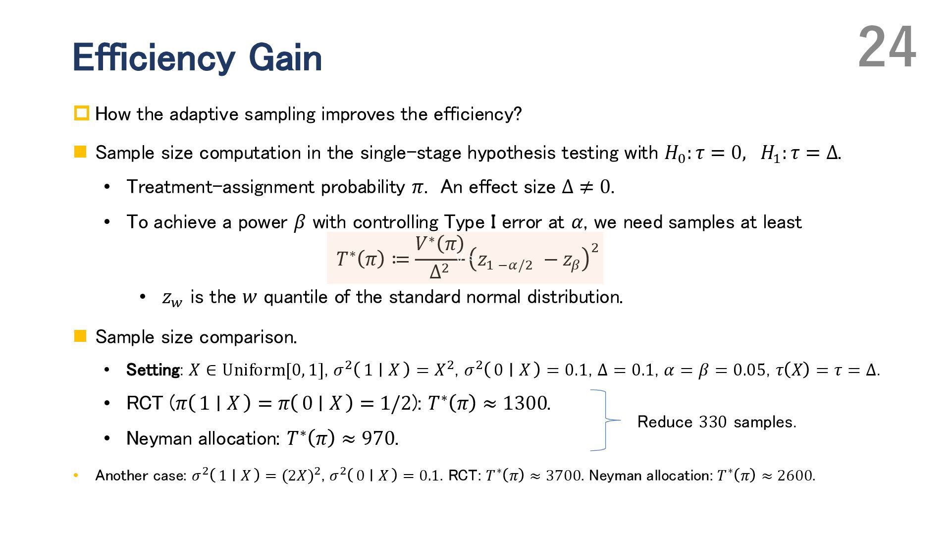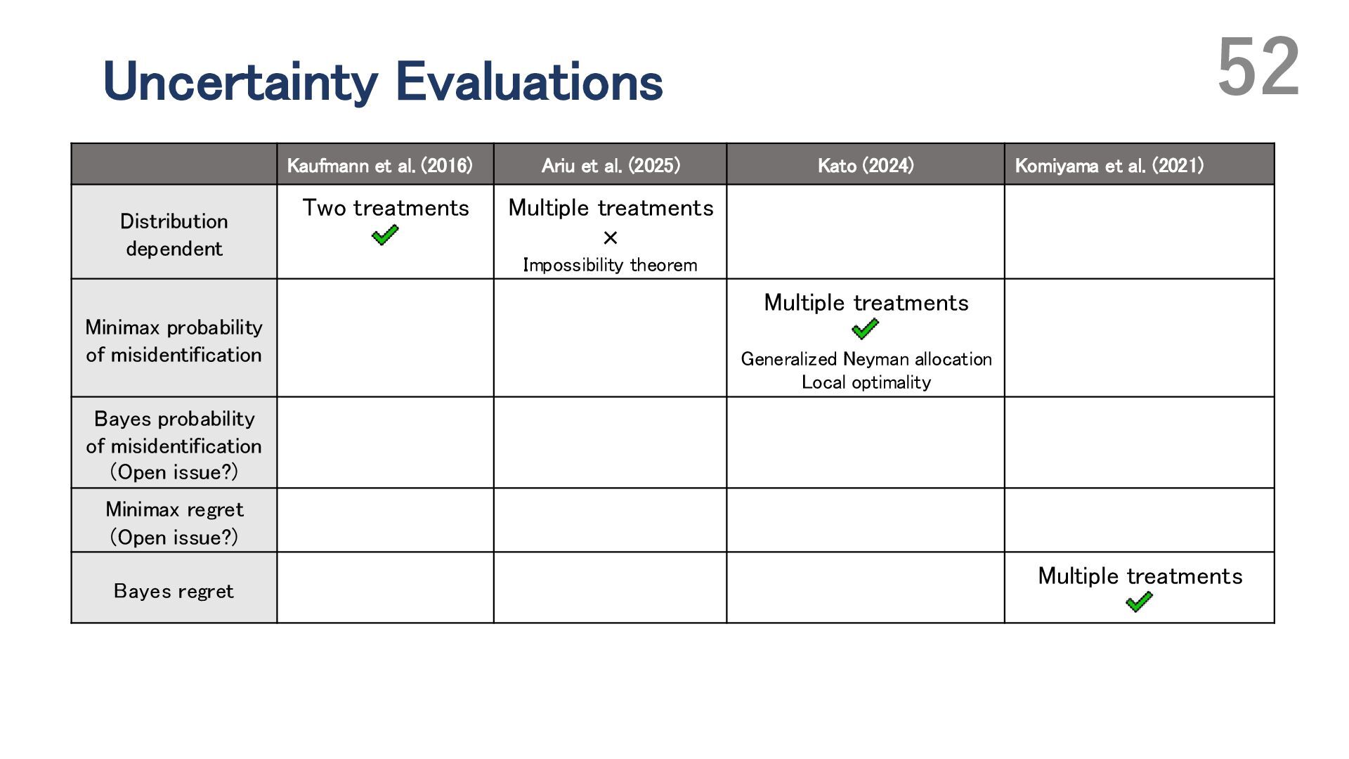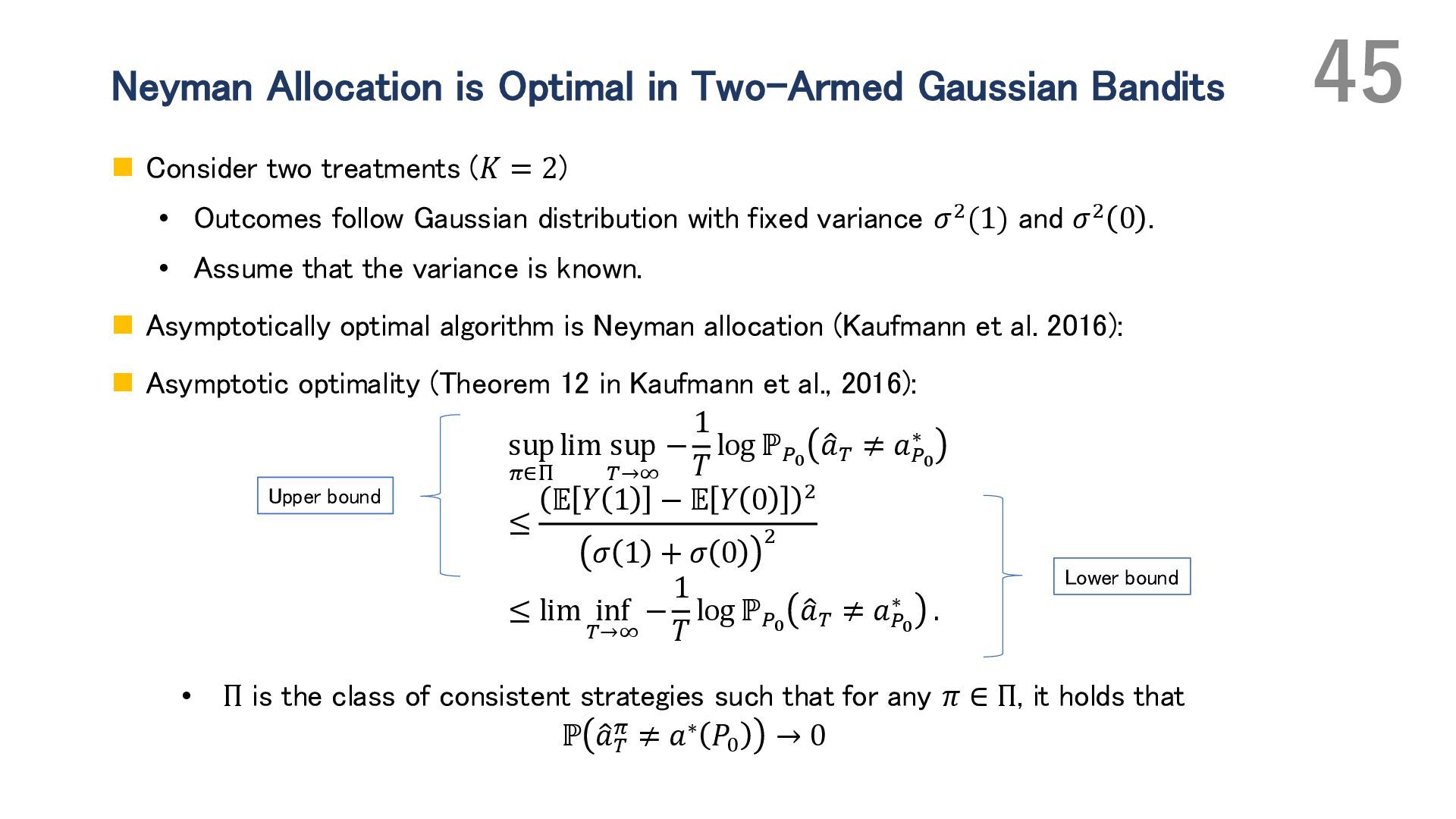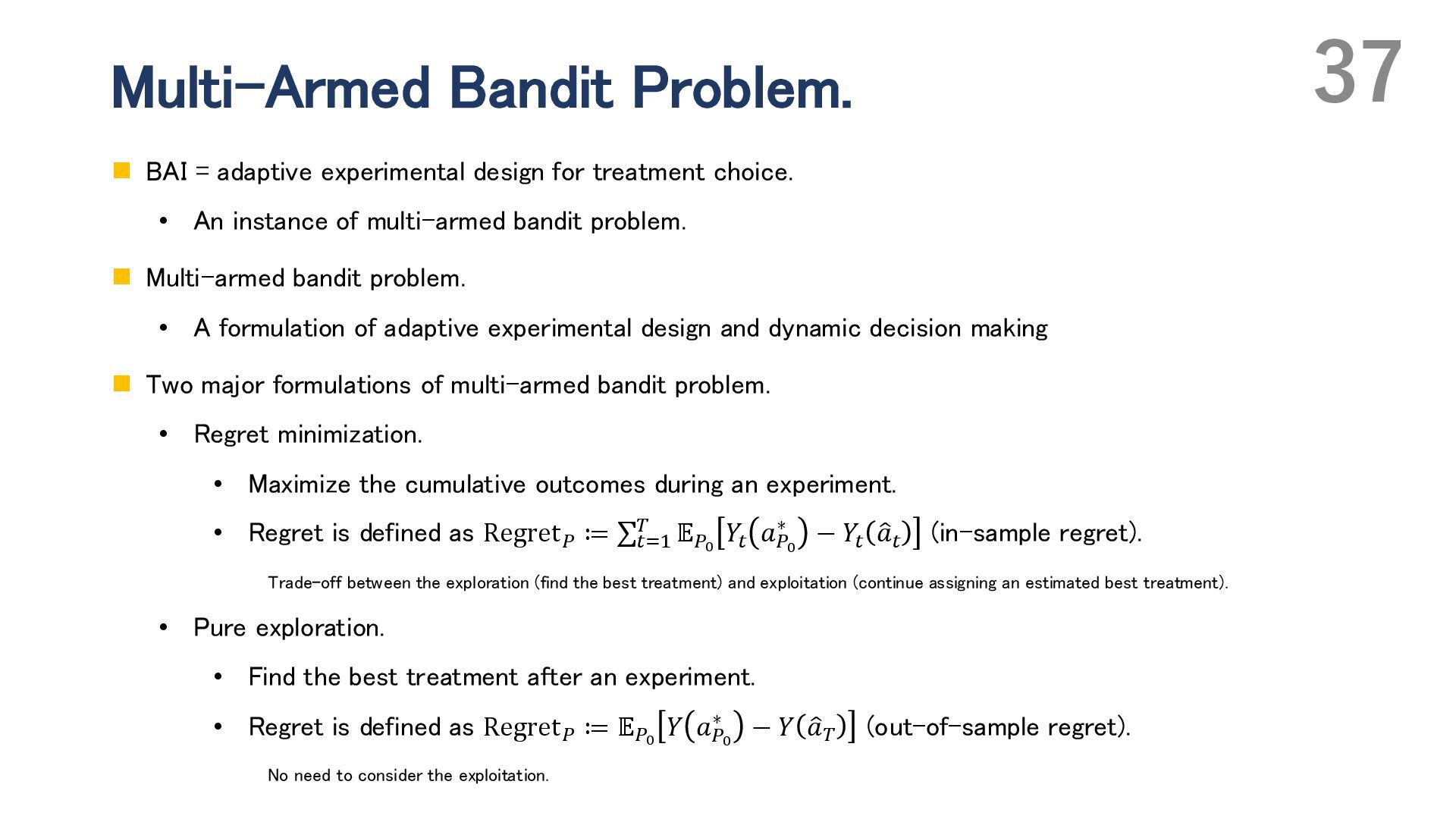 Adaptive experimental design has attracted attention for improving the efficiency of both average treatment effect (ATE) estimation and treatment choice. In such designs, the probability of assigning treatments (i.e., the propensity score) can be updated during the experiment based on previously collected observations. In ATE estimation, the objective is to reduce the estimation error of the ATE, whereas in treatment choice, the goal is to identify the best treatment—the one with the highest expected outcome. While ATE estimation typically involves binary treatments, treatment choice problems often consider multiple treatment options. In this talk, I begin by discussing adaptive experimental design for ATE estimation. I introduce the basic approach based on Neyman allocation, which provides a treatment-assignment probability that minimizes the asymptotic variance of ATE estimators, and then present several extensions, including adaptive optimization of the covariate distribution. Next, I address adaptive experimental design for treatment choice, also known as the best-arm identification problem, and highlight the challenges in developing “optimal” algorithms, especially in the presence of multiple treatments. I propose minimax and Bayes optimal algorithms for treatment choice in the setting without covariates. In particular, I generalize Neyman allocation to construct a minimax optimal algorithm. Finally, I discuss how incorporating covariates can further enhance the efficiency of treatment choice, focusing on conditional treatment choice (policy learning).
