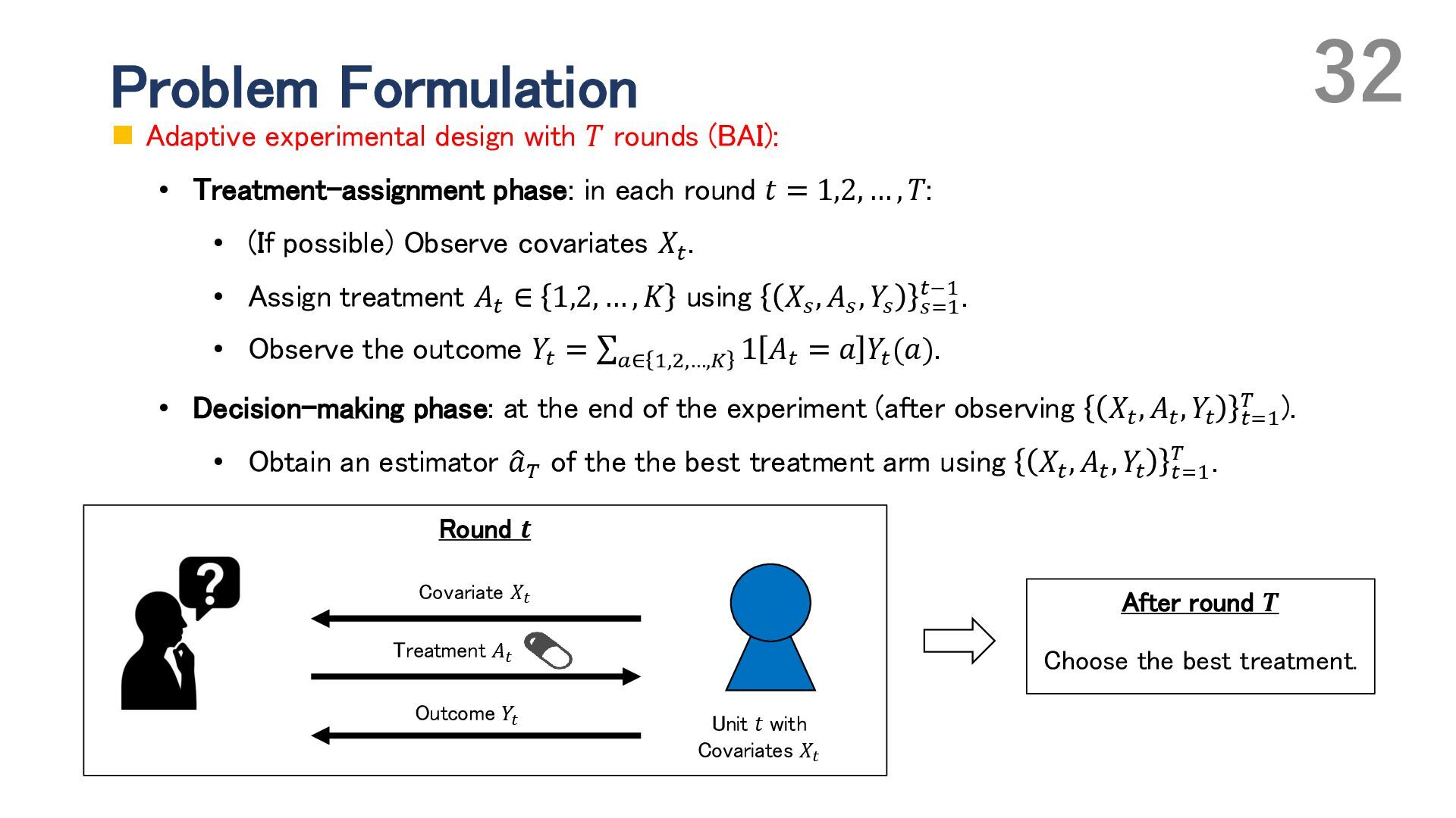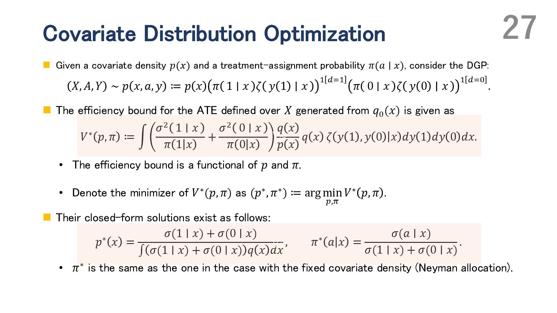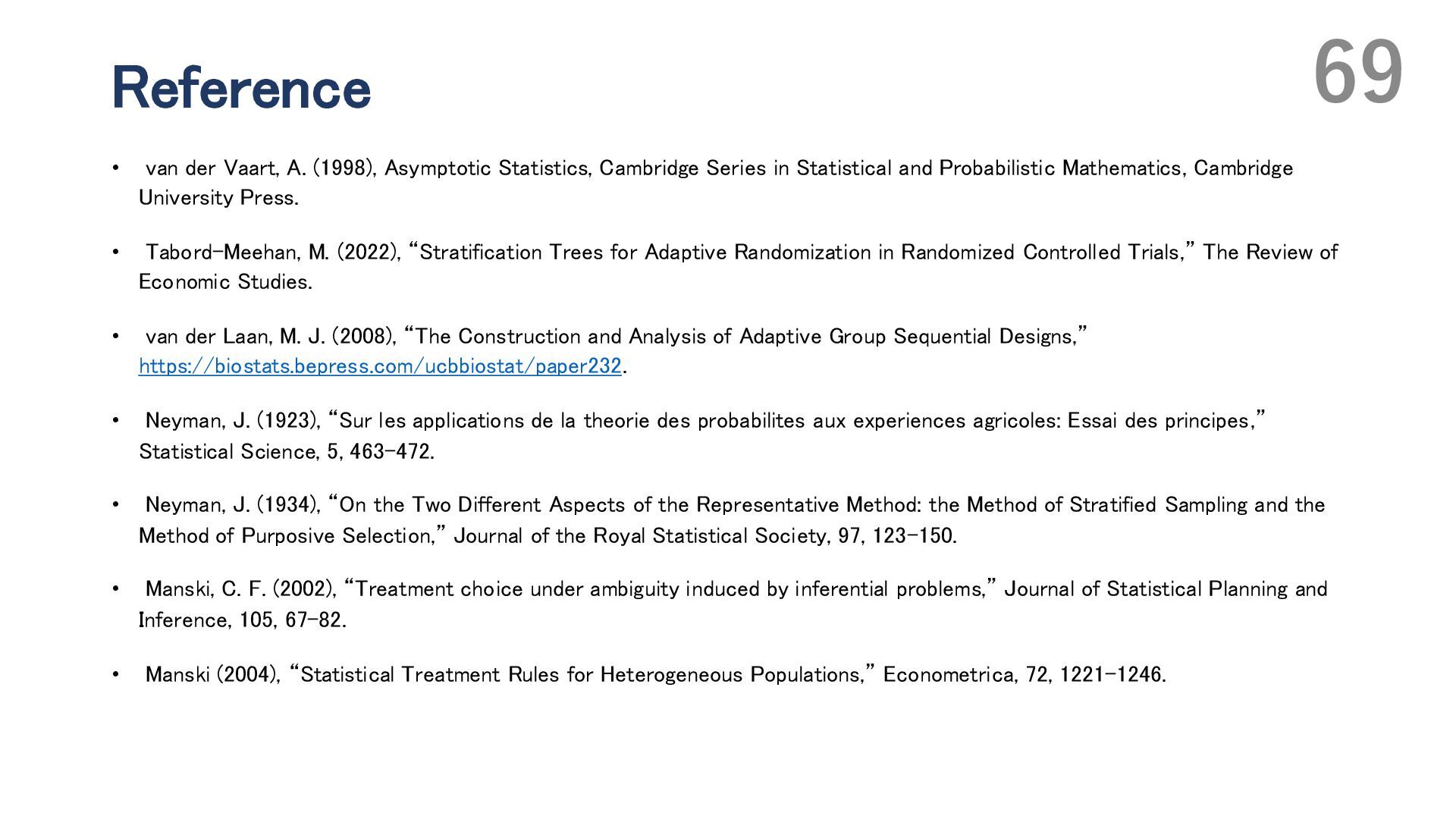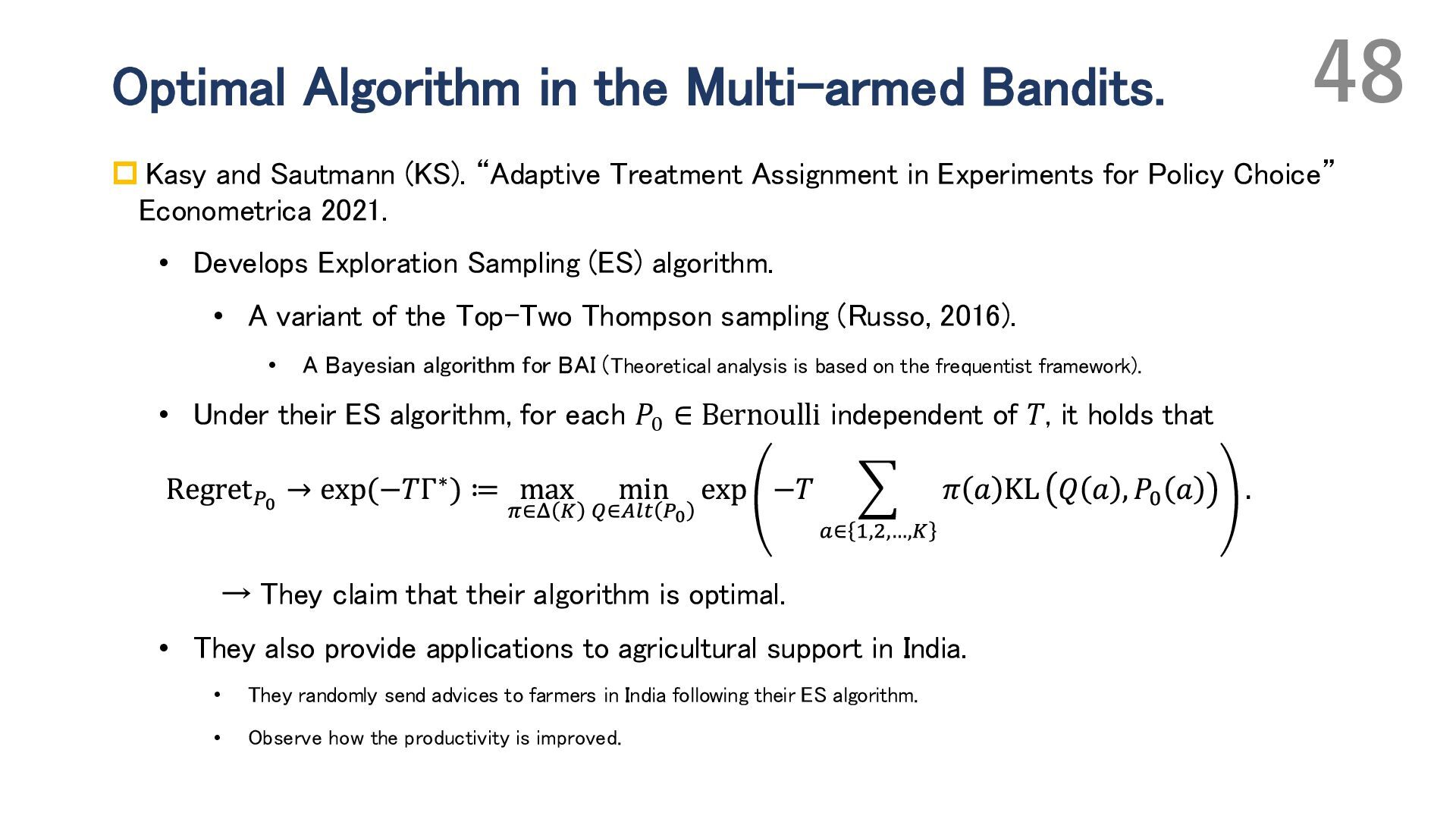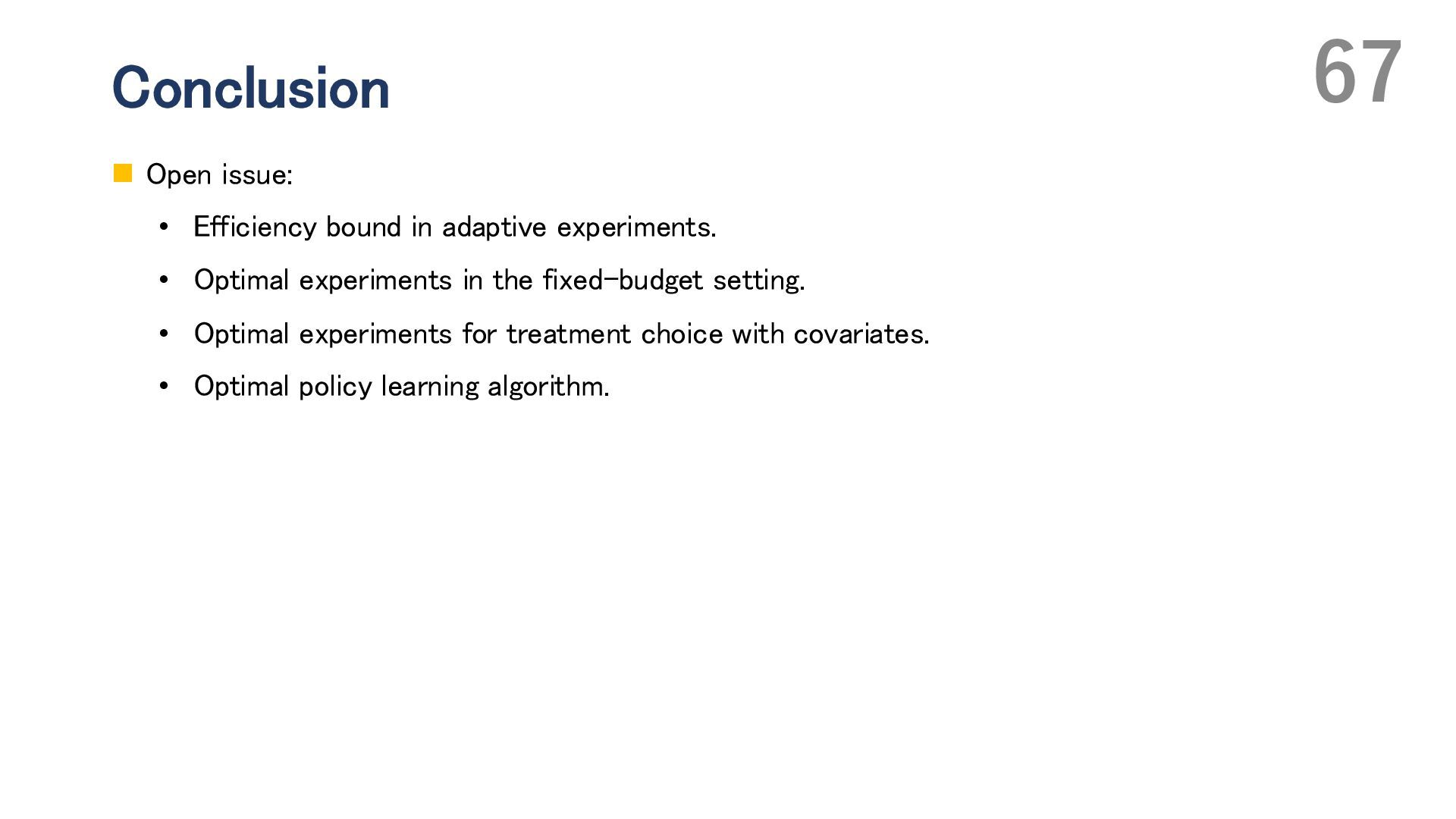 Adaptive experimental design has attracted attention for improving the efficiency of both average treatment effect (ATE) estimation and treatment choice. In such designs, the probability of assigning treatments (i.e., the propensity score) can be updated during the experiment based on previously collected observations. In ATE estimation, the objective is to reduce the estimation error of the ATE, whereas in treatment choice, the goal is to identify the best treatment—the one with the highest expected outcome. While ATE estimation typically involves binary treatments, treatment choice problems often consider multiple treatment options. In this talk, I begin by discussing adaptive experimental design for ATE estimation. I introduce the basic approach based on Neyman allocation, which provides a treatment-assignment probability that minimizes the asymptotic variance of ATE estimators, and then present several extensions, including adaptive optimization of the covariate distribution. Next, I address adaptive experimental design for treatment choice, also known as the best-arm identification problem, and highlight the challenges in developing “optimal” algorithms, especially in the presence of multiple treatments. I propose minimax and Bayes optimal algorithms for treatment choice in the setting without covariates. In particular, I generalize Neyman allocation to construct a minimax optimal algorithm. Finally, I discuss how incorporating covariates can further enhance the efficiency of treatment choice, focusing on conditional treatment choice (policy learning).