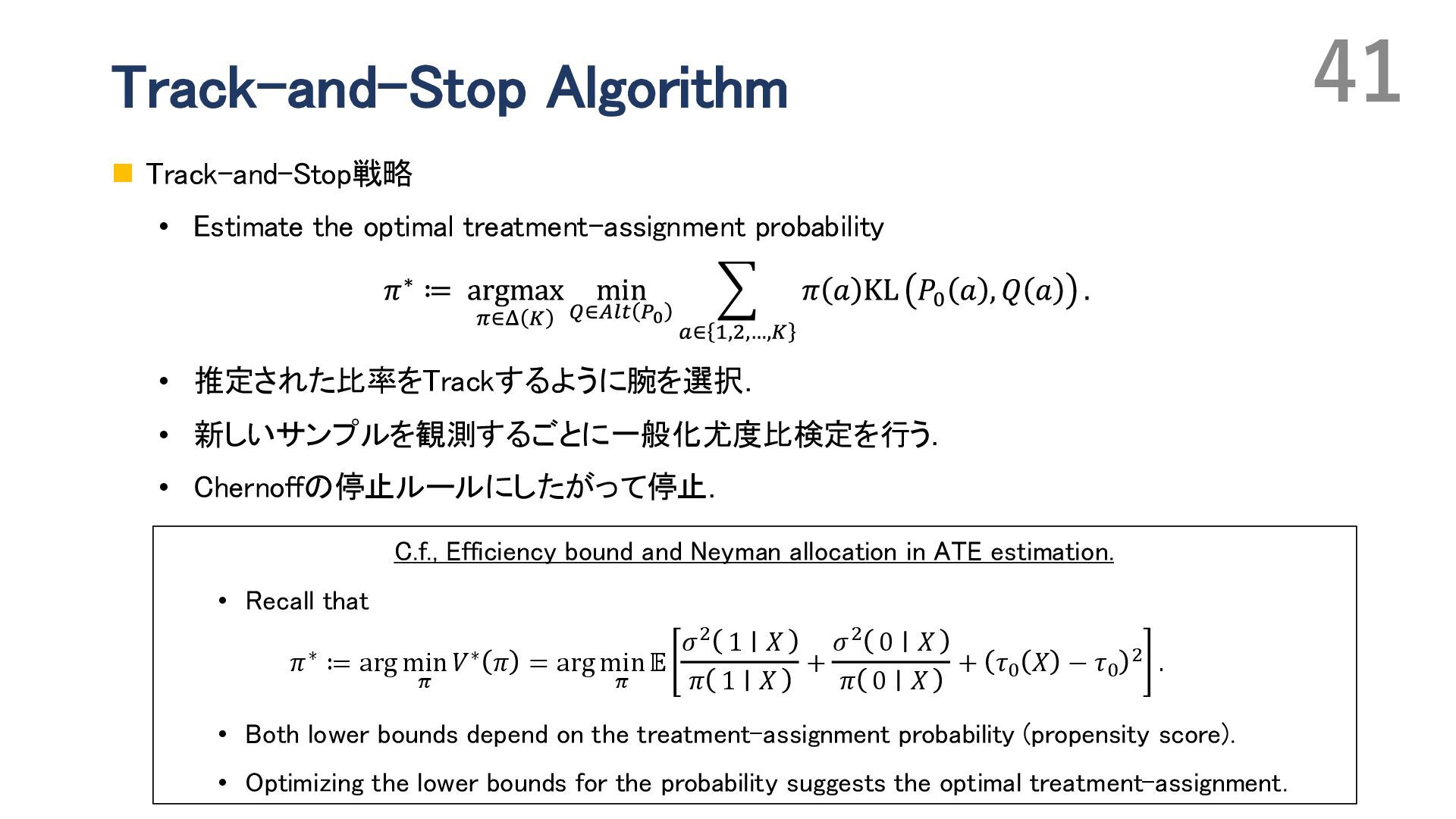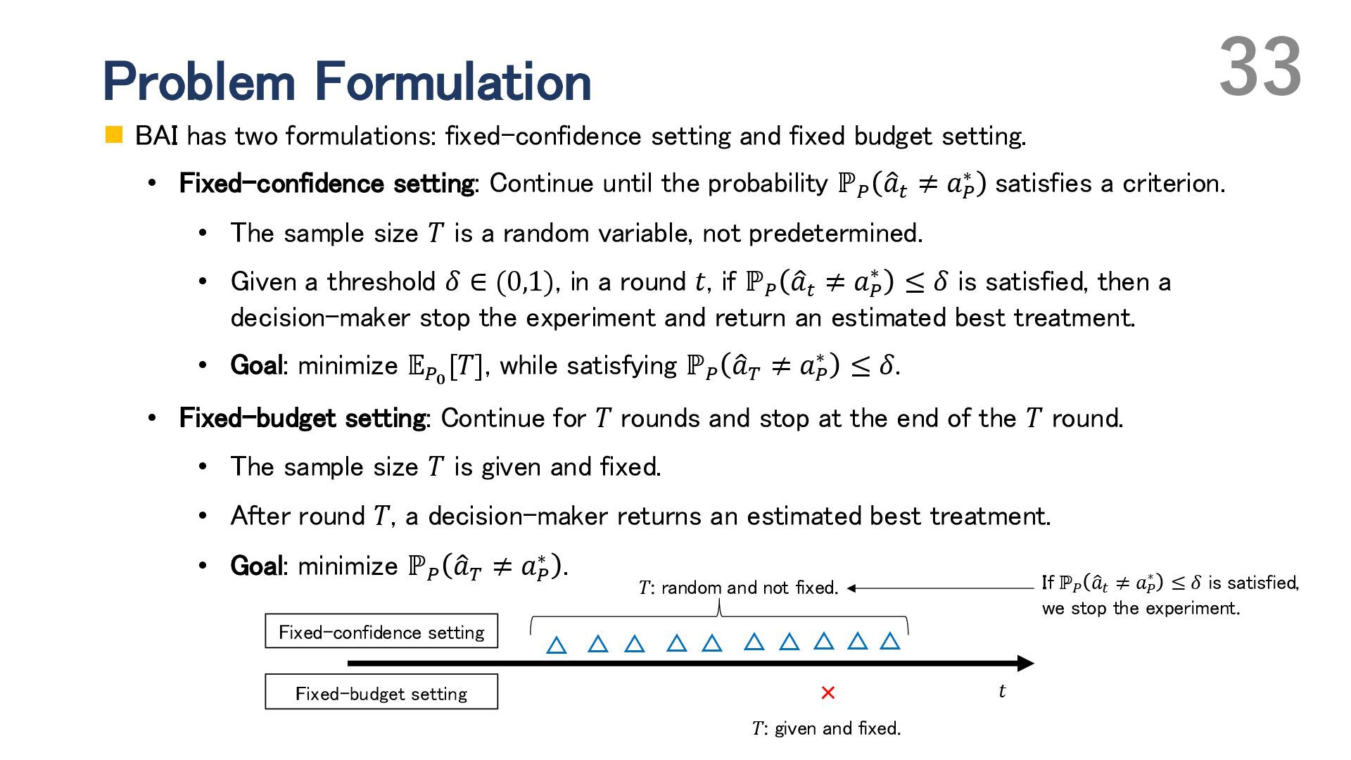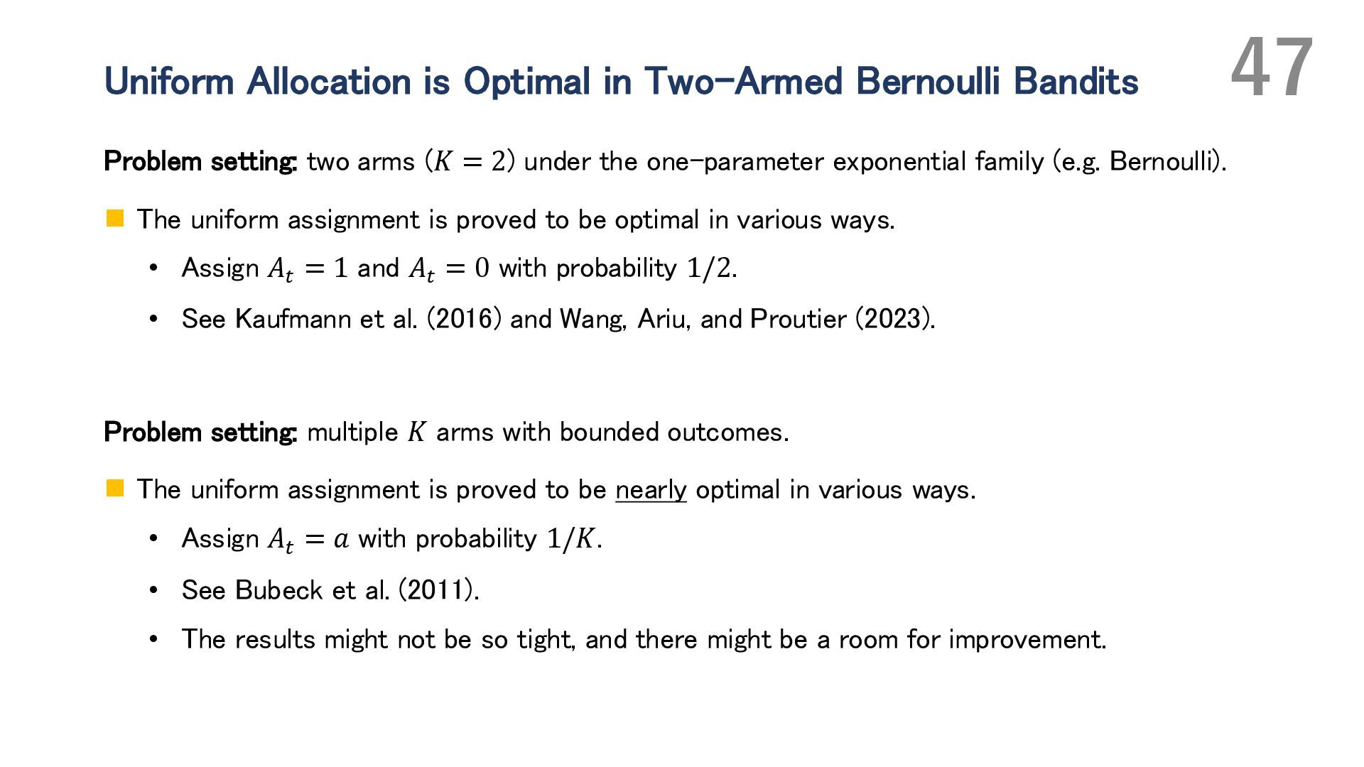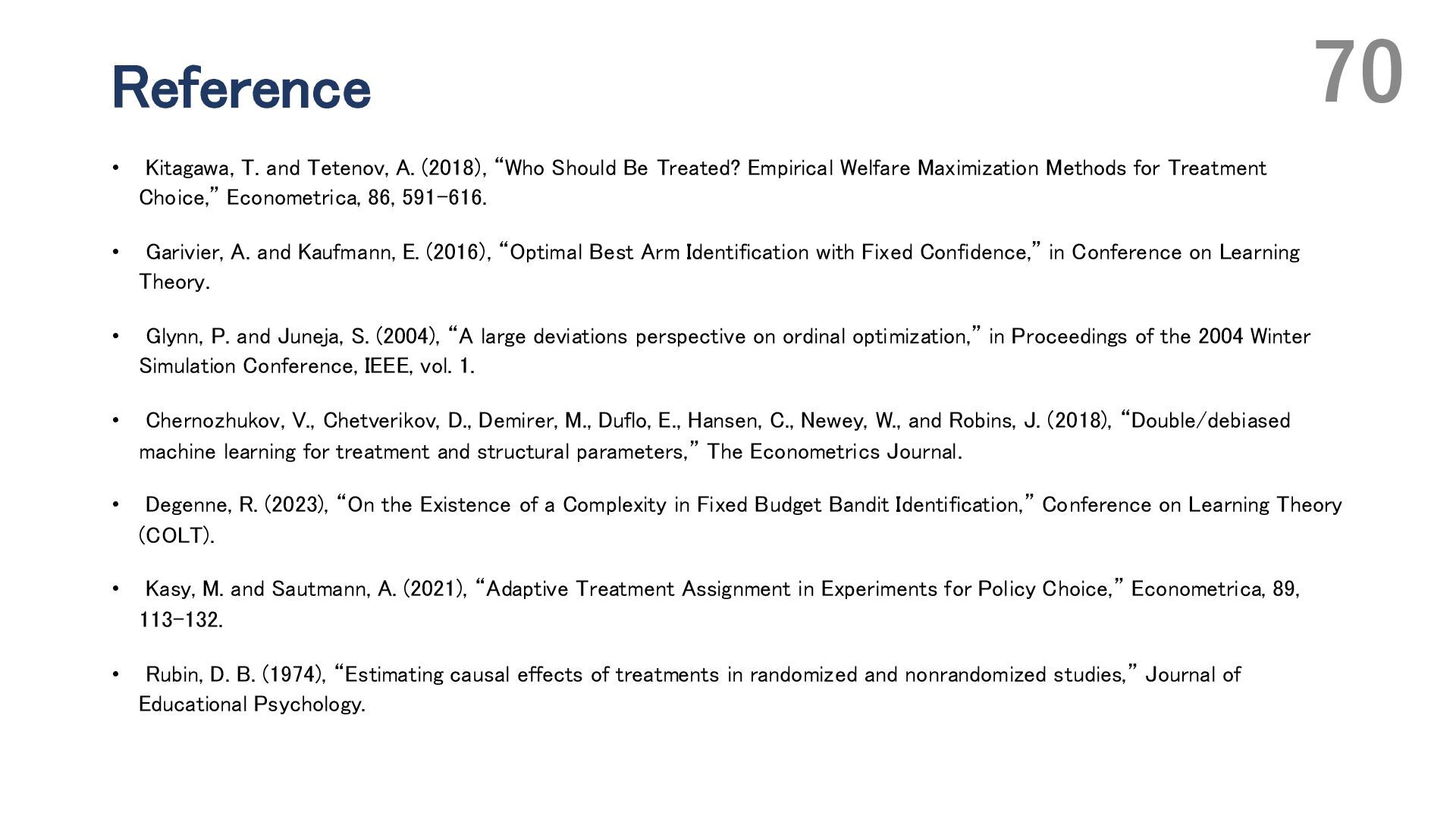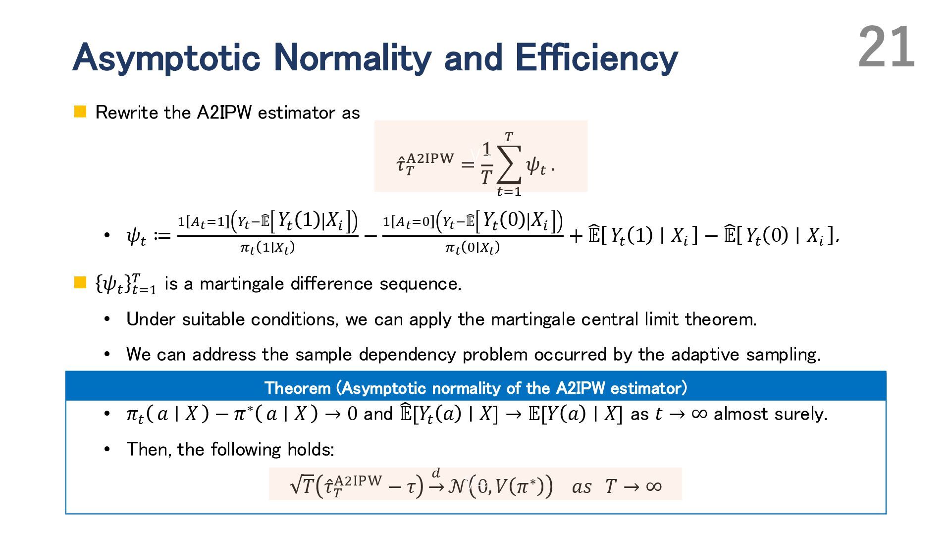 Adaptive experimental design has attracted attention for improving the efficiency of both average treatment effect (ATE) estimation and treatment choice. In such designs, the probability of assigning treatments (i.e., the propensity score) can be updated during the experiment based on previously collected observations. In ATE estimation, the objective is to reduce the estimation error of the ATE, whereas in treatment choice, the goal is to identify the best treatment—the one with the highest expected outcome. While ATE estimation typically involves binary treatments, treatment choice problems often consider multiple treatment options. In this talk, I begin by discussing adaptive experimental design for ATE estimation. I introduce the basic approach based on Neyman allocation, which provides a treatment-assignment probability that minimizes the asymptotic variance of ATE estimators, and then present several extensions, including adaptive optimization of the covariate distribution. Next, I address adaptive experimental design for treatment choice, also known as the best-arm identification problem, and highlight the challenges in developing “optimal” algorithms, especially in the presence of multiple treatments. I propose minimax and Bayes optimal algorithms for treatment choice in the setting without covariates. In particular, I generalize Neyman allocation to construct a minimax optimal algorithm. Finally, I discuss how incorporating covariates can further enhance the efficiency of treatment choice, focusing on conditional treatment choice (policy learning).