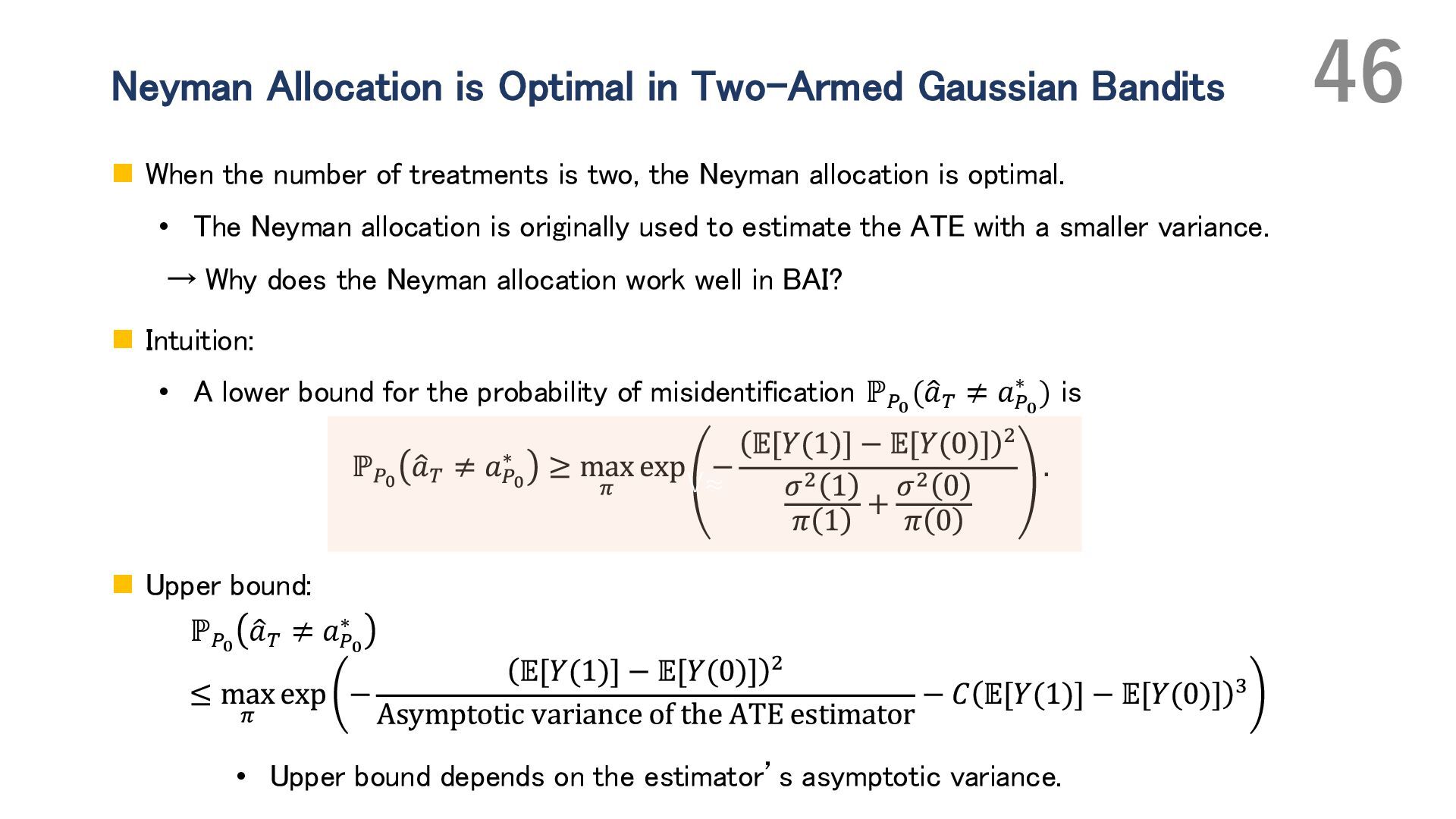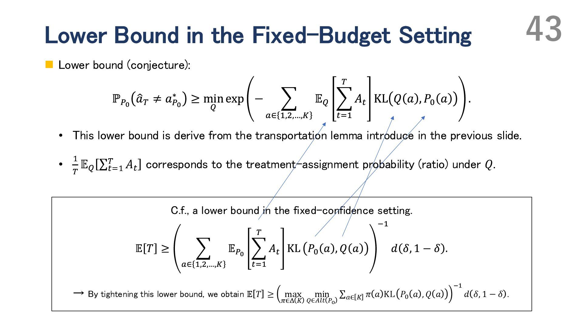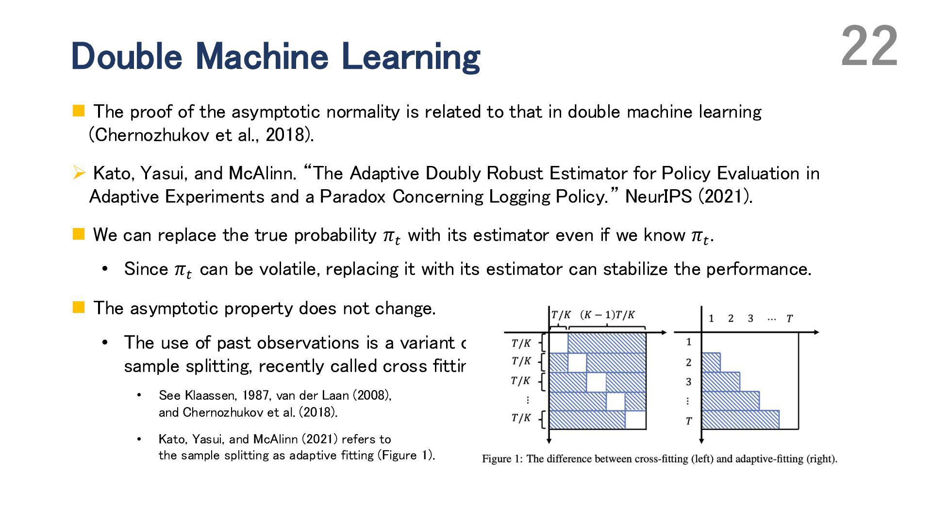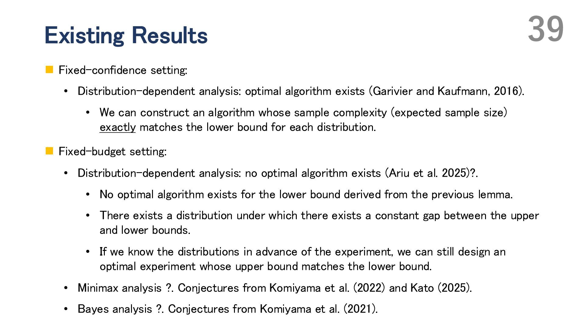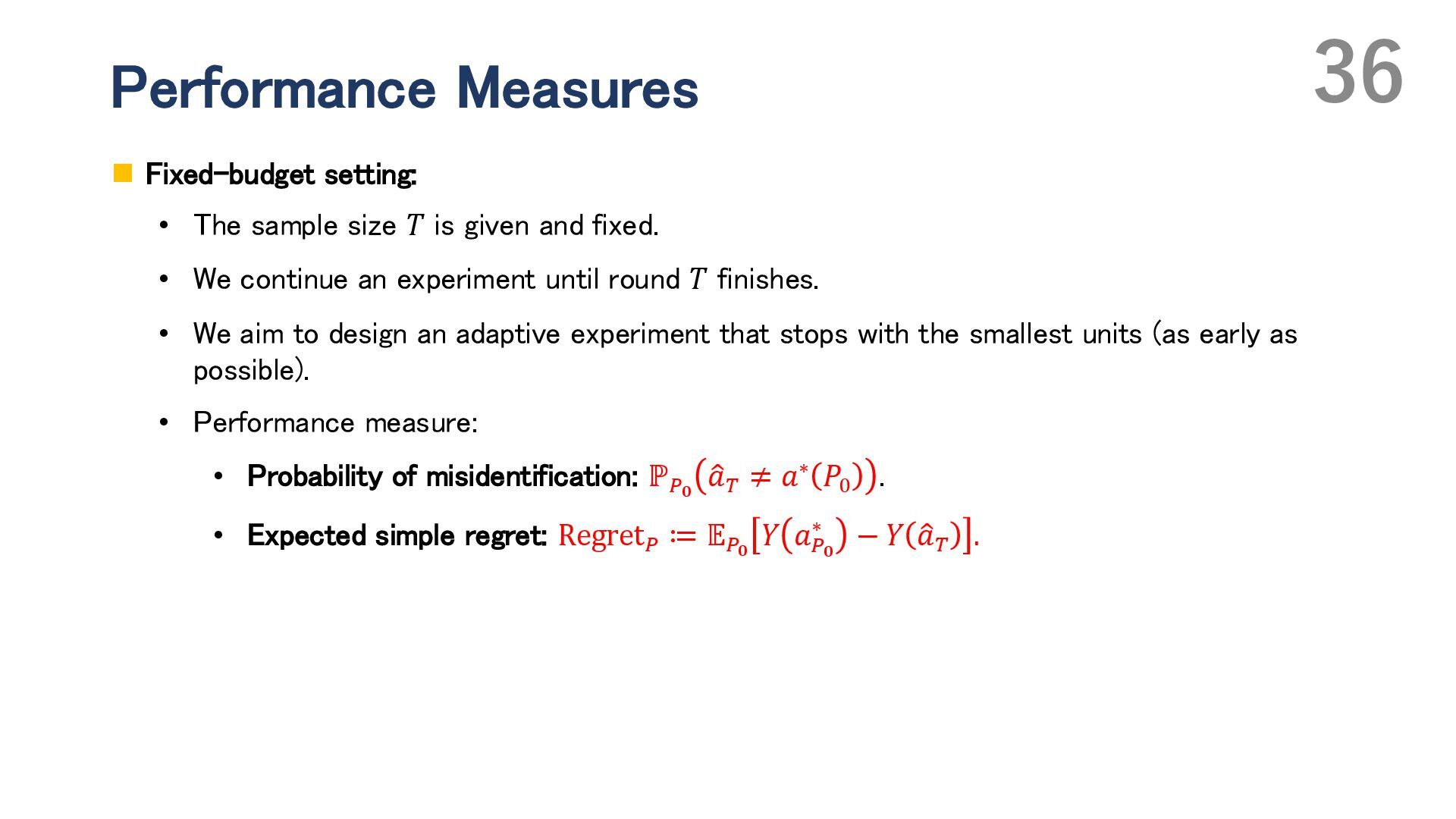 Adaptive experimental design has attracted attention for improving the efficiency of both average treatment effect (ATE) estimation and treatment choice. In such designs, the probability of assigning treatments (i.e., the propensity score) can be updated during the experiment based on previously collected observations. In ATE estimation, the objective is to reduce the estimation error of the ATE, whereas in treatment choice, the goal is to identify the best treatment—the one with the highest expected outcome. While ATE estimation typically involves binary treatments, treatment choice problems often consider multiple treatment options. In this talk, I begin by discussing adaptive experimental design for ATE estimation. I introduce the basic approach based on Neyman allocation, which provides a treatment-assignment probability that minimizes the asymptotic variance of ATE estimators, and then present several extensions, including adaptive optimization of the covariate distribution. Next, I address adaptive experimental design for treatment choice, also known as the best-arm identification problem, and highlight the challenges in developing “optimal” algorithms, especially in the presence of multiple treatments. I propose minimax and Bayes optimal algorithms for treatment choice in the setting without covariates. In particular, I generalize Neyman allocation to construct a minimax optimal algorithm. Finally, I discuss how incorporating covariates can further enhance the efficiency of treatment choice, focusing on conditional treatment choice (policy learning).