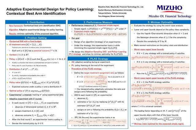 Ø Contextual BAI with a fixed budget. n 𝑲 treatment arms 𝐾 = 1,2, … , 𝐾 : Treatment arms: alternatives of medicine, policy, and advertisements. • Each arm 𝑎 ∈ [𝐾] has a potential outcome 𝑌! ∈ ℝ. n Context 𝑋 ∈ 𝒳 ⊆ ℝ". n Policy 𝜋: 𝐾 ×𝒳 → 0,1 such that ∑!∈[%] 𝜋(𝑎 ∣ 𝑥) = 1 ∀𝑥 ∈ 𝒳. • A policy is a function that returns a estimated best arm given a context 𝑥. • Policy class Π: a set of policies 𝜋. Ex. Neural networks. n Distribution 𝑃 of (𝑌*, … , 𝑌%, 𝑋). • 𝒫: a set of 𝑃. • 𝔼! and ℙ! : expectation and probability laws under 𝑃. • 𝜇"(𝑃) = 𝔼! 𝑌# " and 𝜇"(𝑃)(𝑥) n Policy value 𝑄 𝑃 𝜋 ≔ 𝔼4 ∑!∈ % 𝜋 𝑎 𝑋 𝜇!(𝑃)(𝑋) . • Expected outcome under a policy 𝜋 and a distribution 𝑃. n Optimal policy 𝜋∗(𝑃) ∈ arg max6∈7 𝑄 𝑃 𝜋 . n Experimenter’s interest: training 𝜋∗ using experimental data. n Adaptive experiment with 𝑻 rounds: • In each round 𝑡 ∈ 𝑇 ≔ 1,2, … , 𝑇 , an experimenter 1. observes 𝑑-dimensional context 𝑋8 ∈ 𝒳 ⊆ ℝ". 2. assigns treatment 𝐴8 ∈ [𝐾], and 3. observes outcome 𝑌8 ≔ ∑!∈ % 1 𝐴8 = 𝑎 𝑌8 ! . • After the final round 𝑇, an experimenter trains a policy 𝜋. • Denote the trained policy by L 𝜋 ∈ Π. n AS: adaptive sampling during an experiment. n PL: policy learning at the end of the experiment. Ø Procedure of the PLAS strategy. • Define the target treatment-assignment ratio as follows: - 𝐾 = 2: 𝑤∗(𝑎 ∣ 𝑥) = 9!(:) 9"(:);9#(:) # ∀𝑎 ∈ [2] and ∀𝑥 ∈ 𝒳. - 𝐾 ≥ 3: 𝑤∗ 𝑎 𝑥 = 9! : # ∑ $∈ & 9$ : # ∀𝑎 ∈ 𝐾 and ∀𝑥 ∈ 𝒳. 𝜎"(𝑥) $: Conditional variance of 𝑌# " given 𝑥. → Our designed policy adaptively estimates the ratio and assigns arms following the probability. • (AS) In each round 𝒕 ∈ 𝑻 , an experimenter 1. observes 𝑋8 , 2. estimates 𝑤∗(𝑎 ∣ 𝑋8 ) by replacing 𝜎!(𝑋8 ) > with its estimator L 𝜎!(𝑋8 ) >, and 3. assigns an arm 𝑎 following the probability R 𝑤8 (𝑎 ∣ 𝑋8 ), an estimator of 𝑤∗(𝑎 ∣ 𝑋8 ). • (PL) At the end, the experimenter trains 𝜋 as ! 𝜋!"#$ ≔ arg max %∈' ) (∈[*] 1 𝑇 ) ,∈[-] 𝜋(𝑎 ∣ 𝑋, ) 1[𝐴, = 𝑎](𝑌, − ! 𝜇, (𝑎 ∣ 𝑋, )) 8 𝑤, (𝑎 ∣ 𝑋, ) + ! 𝜇, (𝑎 ∣ 𝑋, ) . • ? 𝑤#(𝑎 ∣ 𝑋#) and D 𝜇#(𝑎 ∣ 𝑋#) are estimators of 𝑤∗ and 𝜇(𝑃)(𝑥) using samples until 𝑡. v n Evaluate the strategy by using the worst-case analysis. n Lower and upper bounds depend on the policy class complexity. • Use the Vapnik-Chervonenkis dimension when 𝐾 = 2 and the Natarajan dimension when 𝐾 ≥ 3 for the complexity. • Denote the complexity of Π by 𝑀. n Make several restrictions on the policy class and distribution. Ø Worst-case regret lower bounds. • If 𝐾 = 2, any strategy with a trained policy L 𝜋 satisfies sup !∈𝒫 𝑇𝔼! 𝑅$ 𝑃 ( 𝜋 ≥ 1 8 𝔼% 𝑀 𝜎&(𝑋) + 𝜎'(𝑋) ' + 𝑜 1 𝑎𝑠 𝑇 → ∞. • If 𝐾 ≥ 3, any strategy with a trained policy L 𝜋 satisfies sup !∈𝒫 𝑇 𝔼! 𝑅$ 𝑃 , 𝜋 ≥ 1 8 𝔼% 𝑀 2 &∈ ' 𝜎&(𝑋) ( + 𝑜 1 𝑎𝑠 𝑇 → ∞. • Note that 𝔼% 𝑀 ∑ (∈ ) 𝜎((𝑋) ' ≥ 𝔼% 𝑀 𝜎&(𝑋) + 𝜎'(𝑋) ' . Ø Worst-case regret upper bounds of the PLAS strategy. • If 𝐾 = 2, the PLAS strategy satisfies 𝑇 𝔼4 𝑅F 𝑃 L 𝜋GHIJ ≤ 272 𝑀 + 870.4 𝔼K 𝜎*(𝑋) + 𝜎>(𝑋) > + 𝑜 1 𝑎𝑠 𝑇 → ∞. • If 𝐾 ≥ 3, the PLAS strategy satisfies 𝑇 𝔼! 𝑅$ 𝑃 , 𝜋)*+, ≤ 𝐶 log 𝑑 𝑀 + 870.4 𝔼% 𝑀 2 &∈ ' 𝜎&(𝑋) ( + 𝑜 1 𝑎𝑠 𝑇 → ∞, where 𝐶 > 0 is universal constant. Ø The leading factor depending on 𝑀, 𝑇, and 𝜎! 𝑥 > of the upper bounds aligns with that of the lower bounds. • 𝔼% 𝑀 𝜎&(𝑋) + 𝜎'(𝑋) ' and 𝔼% 𝑀 ∑ (∈ ) 𝜎((𝑋) ' . → Minimax (rate-)optimal for the expected simple regret. Masahiro Kato, Mizuho-DL Financial Technology Co., Ltd. Kyohei Okumura, Northwestern University Takuya Ishihara, Tohoku University Toru Kitagawa, Brown University ü New framework: Contextual best arm identification (BAI). ü Algorithm: Adaptive experimental design for policy learning. ü Results: minimax optimality of the proposed algorithm. 2. Problem Setting n Performance measure of L 𝜋 : Expected simple regret. • Simple regret: 𝑟F 𝑃 (L 𝜋)(𝑥) = 𝜇!∗ 4 𝑃 (𝑥) − 𝜇 D !( under 𝑃 • Expected simple regret: 𝑅F 𝑃 L 𝜋 ≔ 𝔼4 𝑟8 𝑃 L 𝜋 𝑋 = 𝑄 𝑃 𝜋∗ 𝑃 − 𝑄 𝑃 L 𝜋 . n Our goal: • Design of an algorithm (strategy) of an experimenter. • Under the strategy, the experimenter trains 𝜋 while minimizing the expected simple regret 𝔼4 𝑟8 𝑃 . → We design the Adaptive-Sampling (AS) and Policy-Learning (PL) strategy and show its minimax optimality for 𝑅F 𝑃 L 𝜋 . 3. Performance Measure 1. Contribution 4. PLAS Strategy v v v v 5. Minimax Optimality v v v