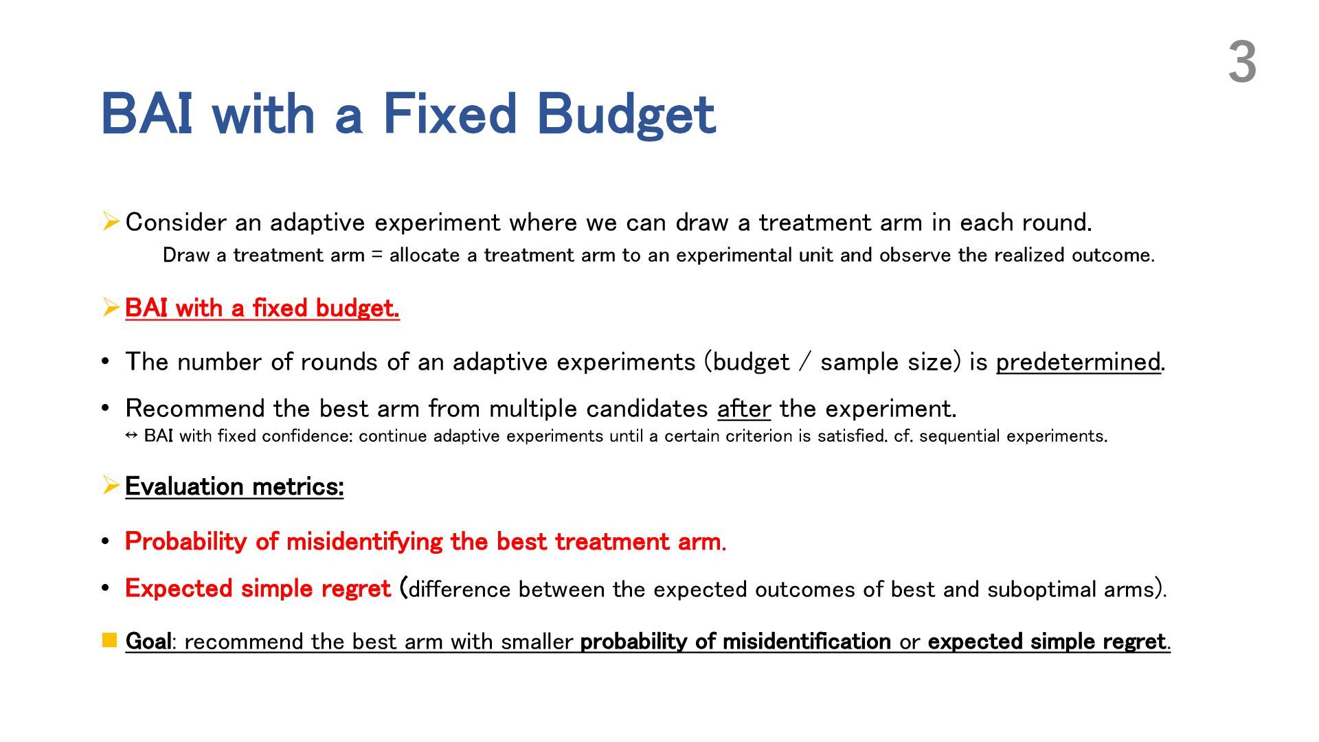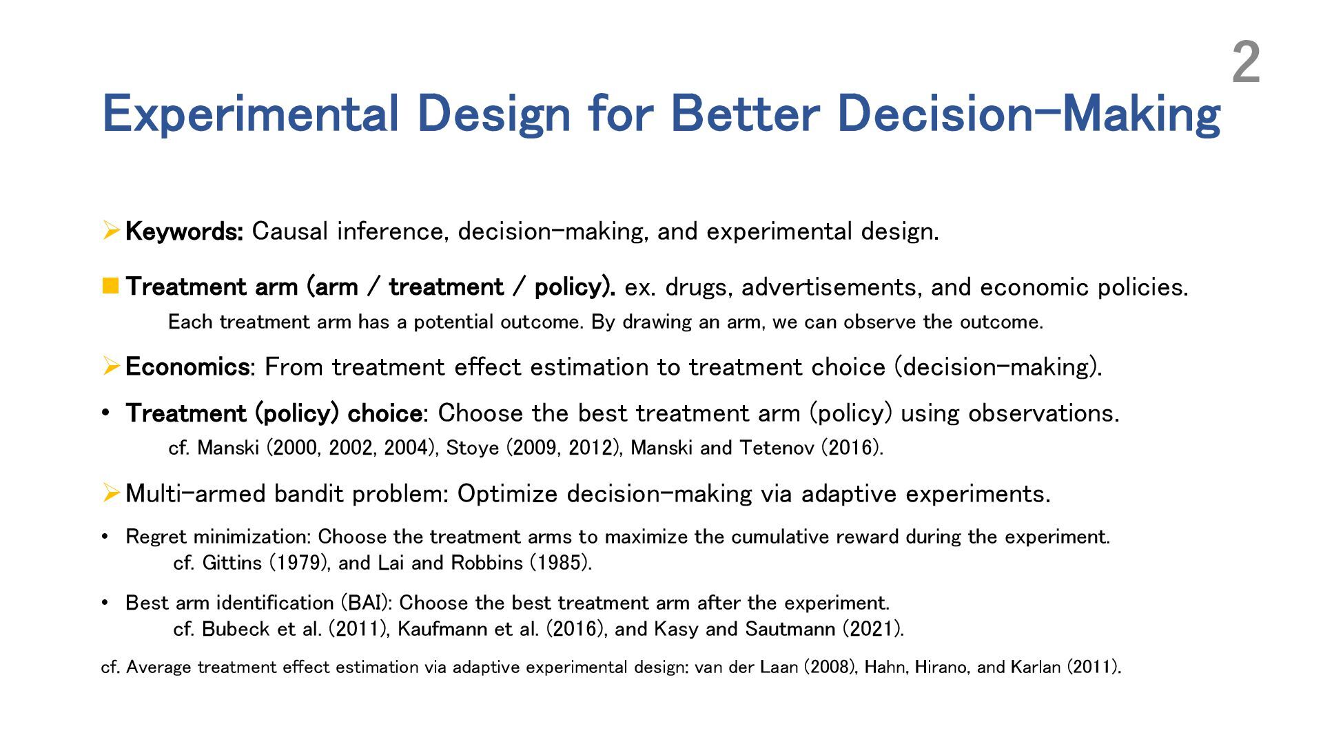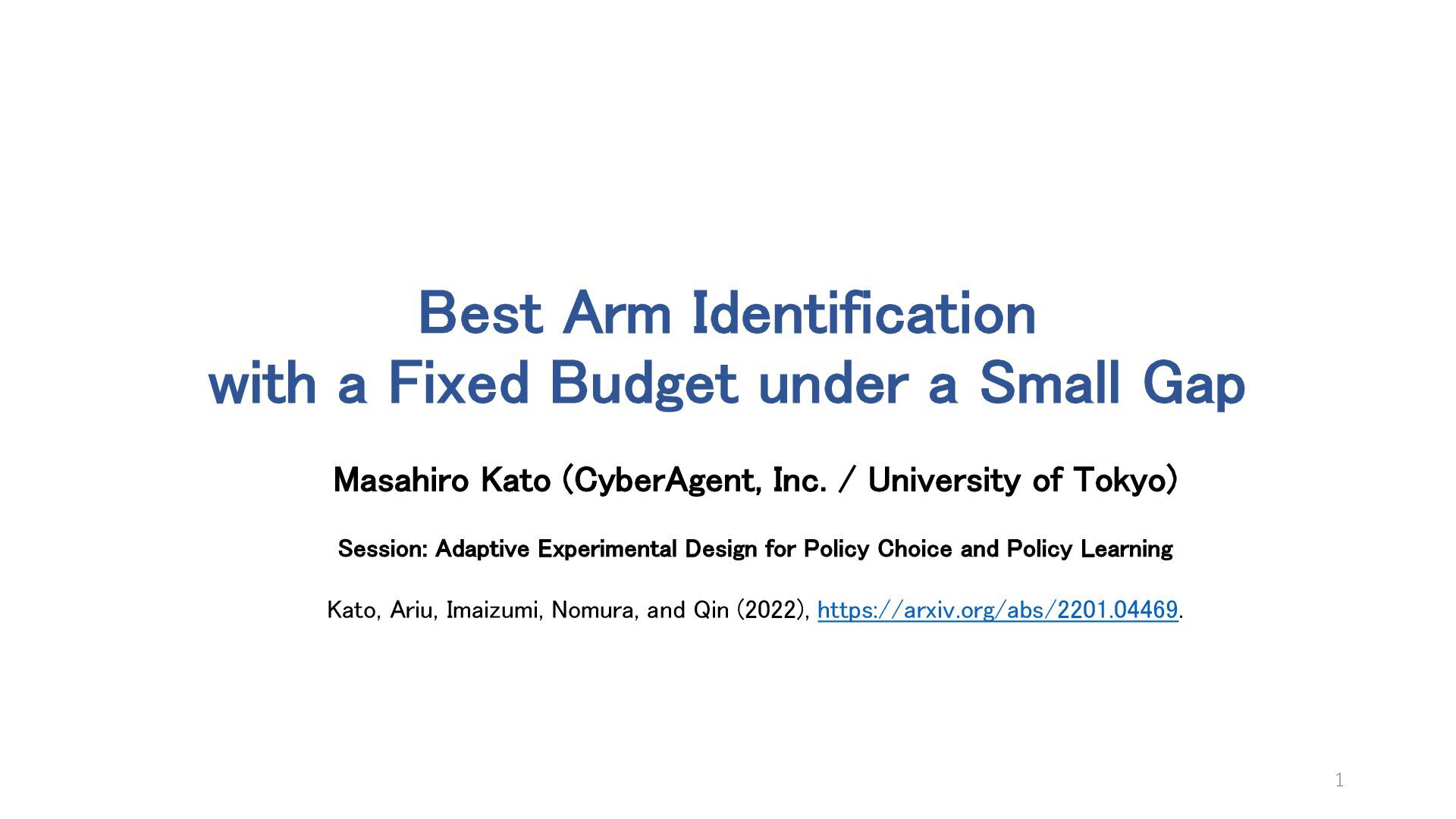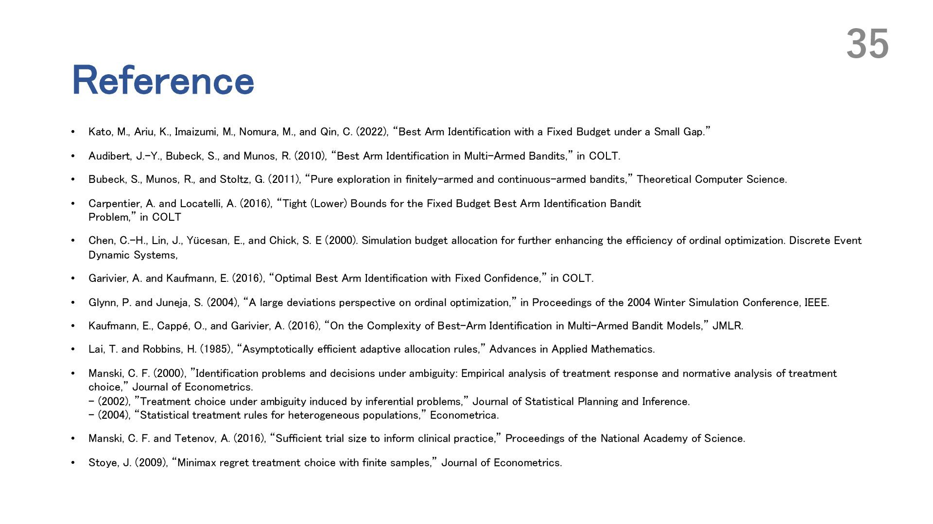 and Qin, C. (2022), โBest Arm Identification with a Fixed Budget under a Small Gap.โ โข Audibert, J.-Y., Bubeck, S., and Munos, R. (2010), โBest Arm Identification in Multi-Armed Bandits,โ in COLT. โข Bubeck, S., Munos, R., and Stoltz, G. (2011), โPure exploration in finitely-armed and continuous-armed bandits,โ Theoretical Computer Science. โข Carpentier, A. and Locatelli, A. (2016), โTight (Lower) Bounds for the Fixed Budget Best Arm Identification Bandit Problem,โ in COLT โข Chen, C.-H., Lin, J., Yรผcesan, E., and Chick, S. E (2000). Simulation budget allocation for further enhancing the efficiency of ordinal optimization. Discrete Event Dynamic Systems, โข Garivier, A. and Kaufmann, E. (2016), โOptimal Best Arm Identification with Fixed Confidence,โ in COLT. โข Glynn, P. and Juneja, S. (2004), โA large deviations perspective on ordinal optimization,โ in Proceedings of the 2004 Winter Simulation Conference, IEEE. โข Kaufmann, E., Cappรฉ, O., and Garivier, A. (2016), โOn the Complexity of Best-Arm Identification in Multi-Armed Bandit Models,โ JMLR. โข Lai, T. and Robbins, H. (1985), โAsymptotically efficient adaptive allocation rules,โ Advances in Applied Mathematics. โข Manski, C. F. (2000), โIdentification problems and decisions under ambiguity: Empirical analysis of treatment response and normative analysis of treatment choice,โ Journal of Econometrics. - (2002), โTreatment choice under ambiguity induced by inferential problems,โ Journal of Statistical Planning and Inference. - (2004), โStatistical treatment rules for heterogeneous populations,โ Econometrica. โข Manski, C. F. and Tetenov, A. (2016), โSufficient trial size to inform clinical practice,โ Proceedings of the National Academy of Science. โข Stoye, J. (2009), โMinimax regret treatment choice with finite samples,โ Journal of Econometrics. 35