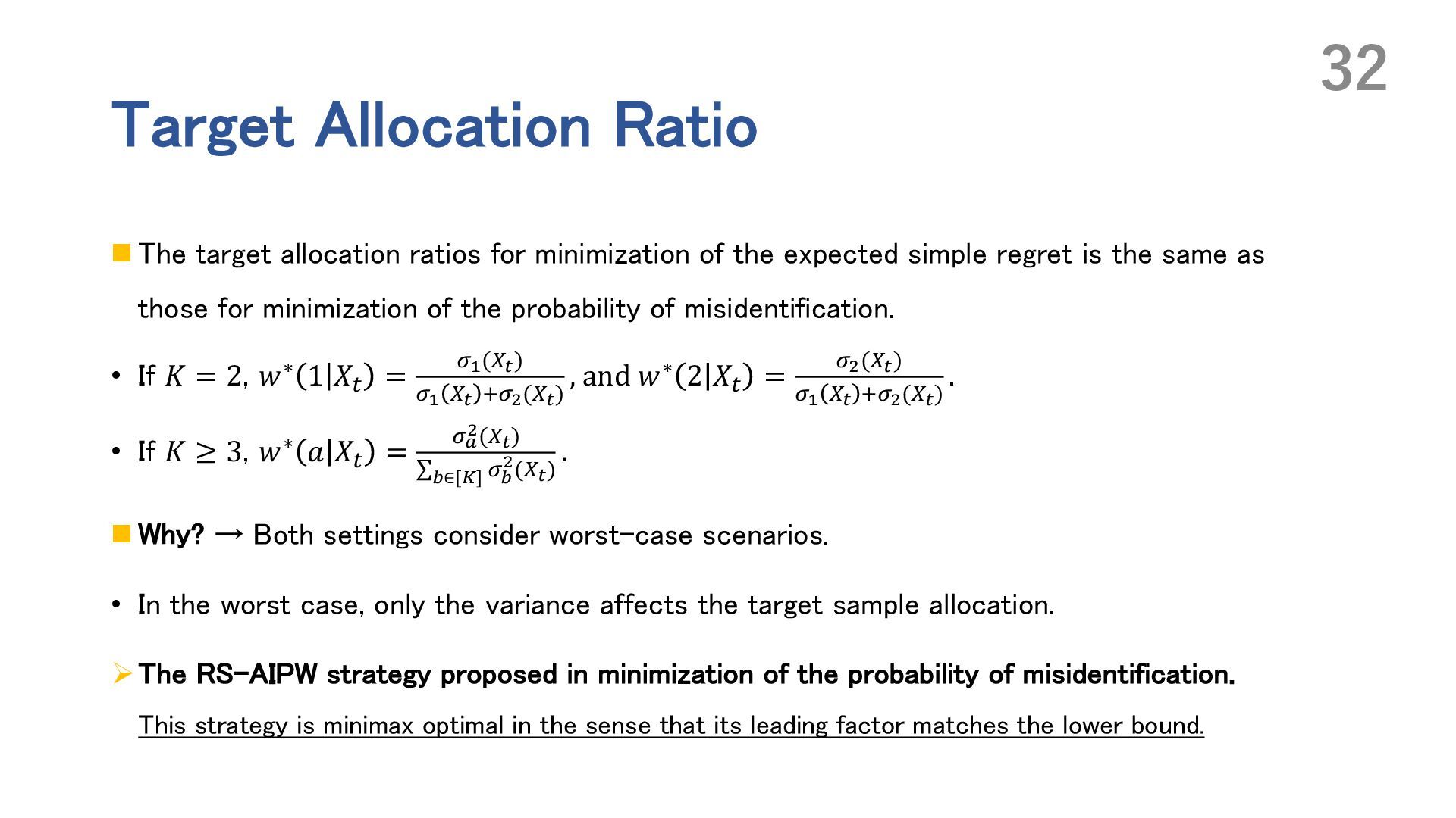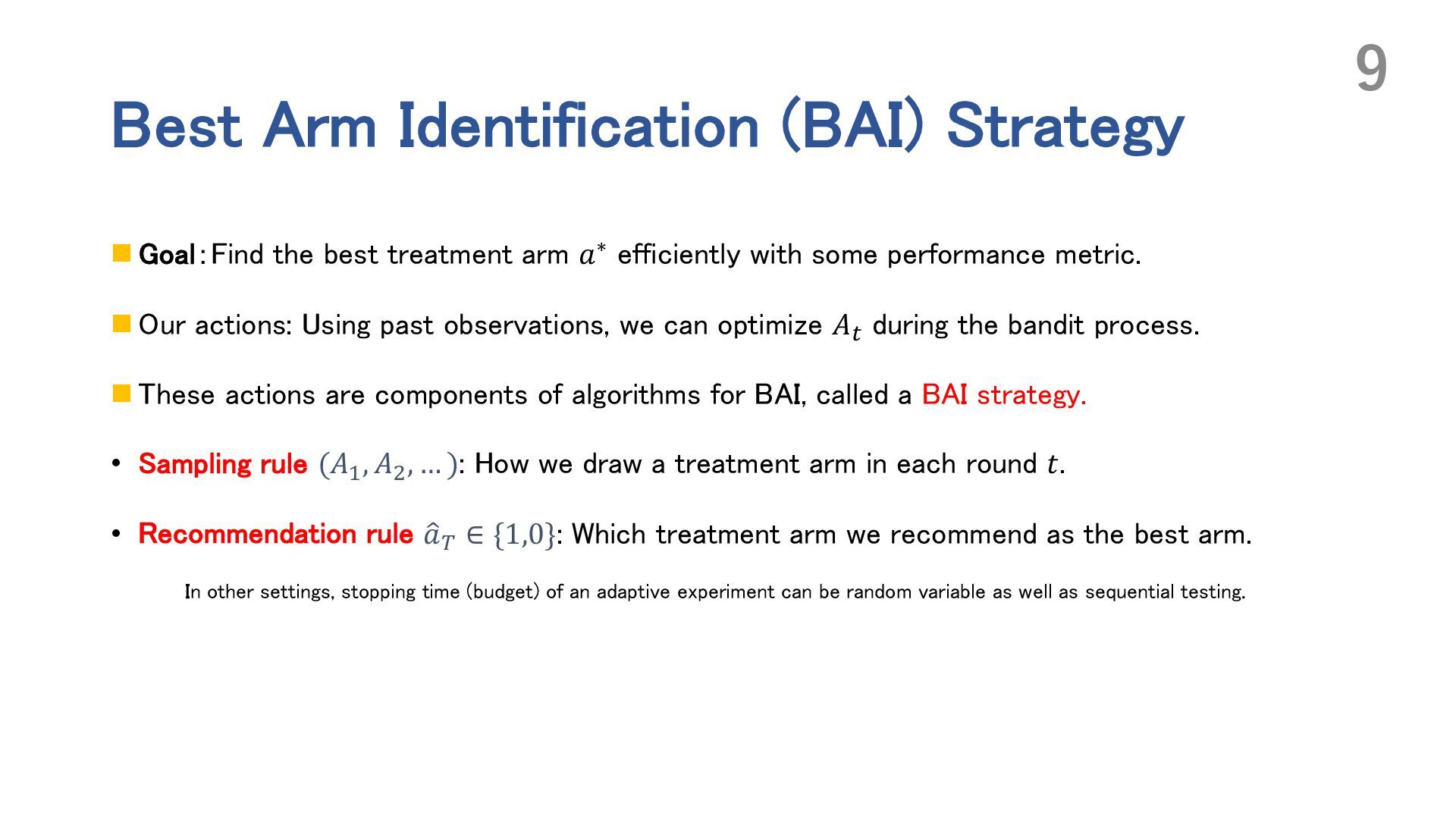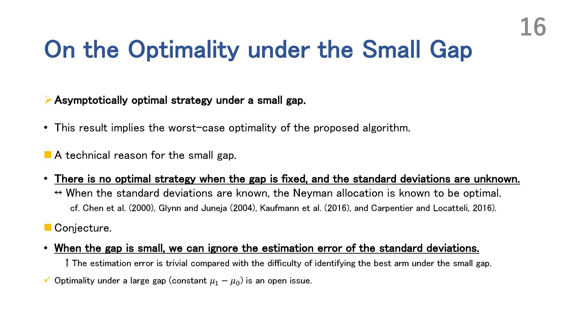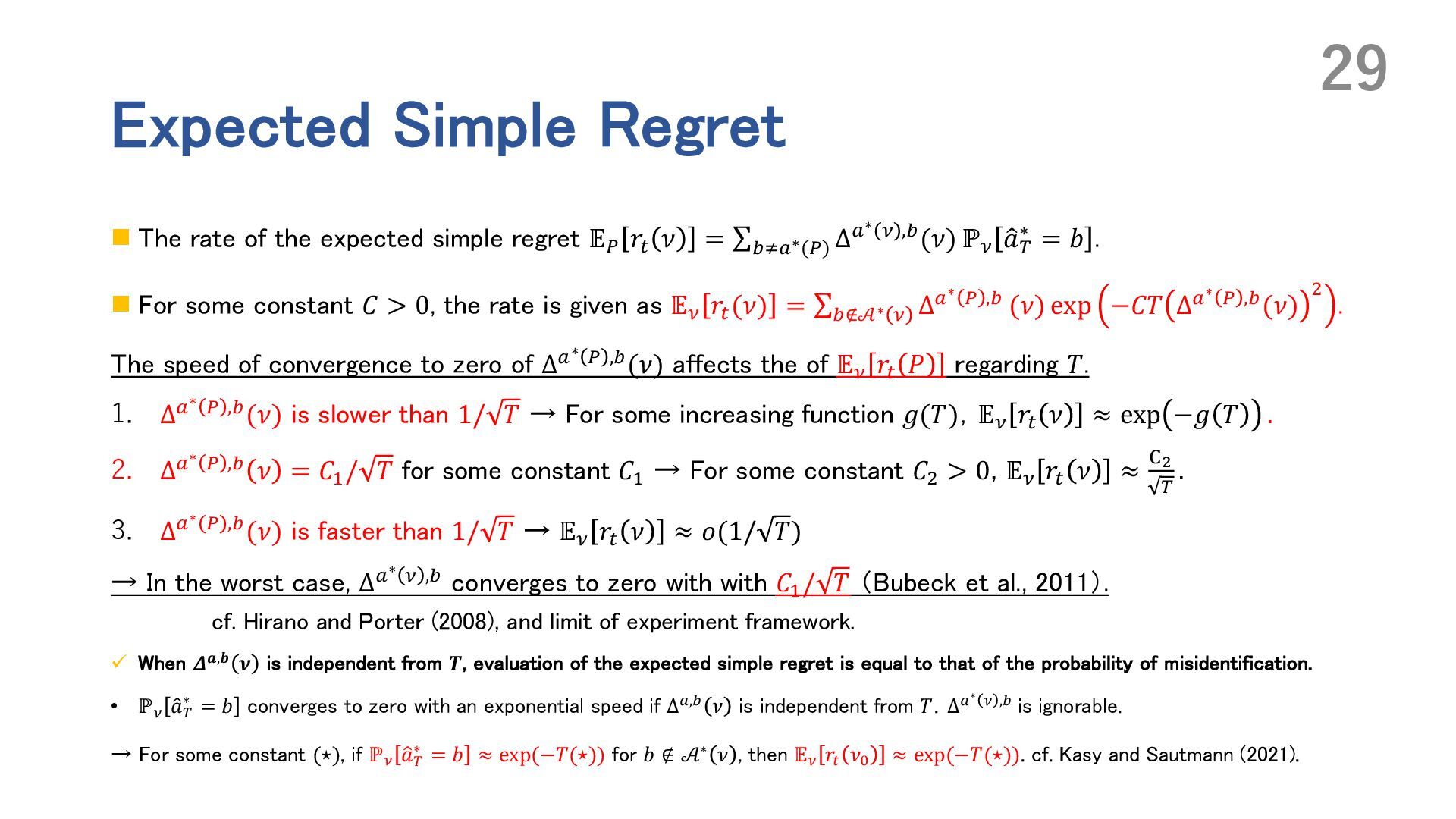 and Qin, C. (2022), โBest Arm Identification with a Fixed Budget under a Small Gap.โ โข Audibert, J.-Y., Bubeck, S., and Munos, R. (2010), โBest Arm Identification in Multi-Armed Bandits,โ in COLT. โข Bubeck, S., Munos, R., and Stoltz, G. (2011), โPure exploration in finitely-armed and continuous-armed bandits,โ Theoretical Computer Science. โข Carpentier, A. and Locatelli, A. (2016), โTight (Lower) Bounds for the Fixed Budget Best Arm Identification Bandit Problem,โ in COLT โข Chen, C.-H., Lin, J., Yรผcesan, E., and Chick, S. E (2000). Simulation budget allocation for further enhancing the efficiency of ordinal optimization. Discrete Event Dynamic Systems, โข Garivier, A. and Kaufmann, E. (2016), โOptimal Best Arm Identification with Fixed Confidence,โ in COLT. โข Glynn, P. and Juneja, S. (2004), โA large deviations perspective on ordinal optimization,โ in Proceedings of the 2004 Winter Simulation Conference, IEEE. โข Kaufmann, E., Cappรฉ, O., and Garivier, A. (2016), โOn the Complexity of Best-Arm Identification in Multi-Armed Bandit Models,โ JMLR. โข Lai, T. and Robbins, H. (1985), โAsymptotically efficient adaptive allocation rules,โ Advances in Applied Mathematics. โข Manski, C. F. (2000), โIdentification problems and decisions under ambiguity: Empirical analysis of treatment response and normative analysis of treatment choice,โ Journal of Econometrics. - (2002), โTreatment choice under ambiguity induced by inferential problems,โ Journal of Statistical Planning and Inference. - (2004), โStatistical treatment rules for heterogeneous populations,โ Econometrica. โข Manski, C. F. and Tetenov, A. (2016), โSufficient trial size to inform clinical practice,โ Proceedings of the National Academy of Science. โข Stoye, J. (2009), โMinimax regret treatment choice with finite samples,โ Journal of Econometrics. 35