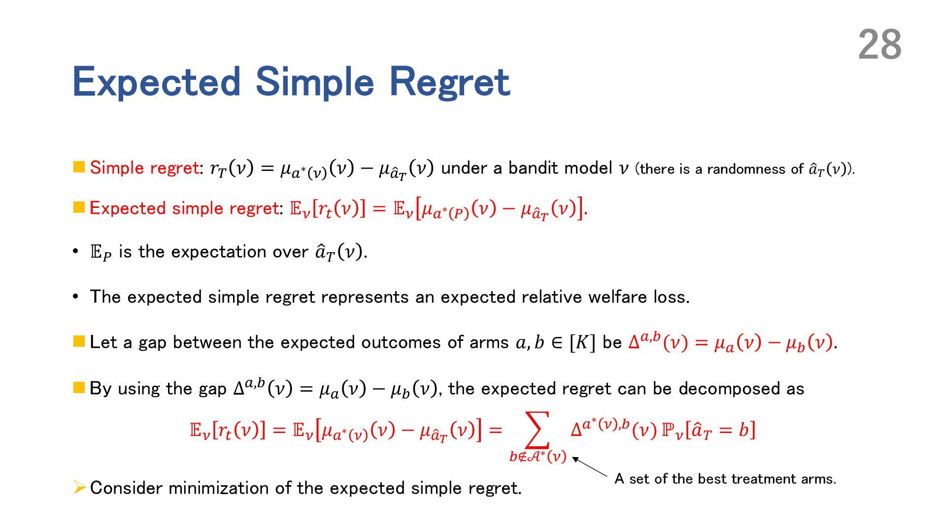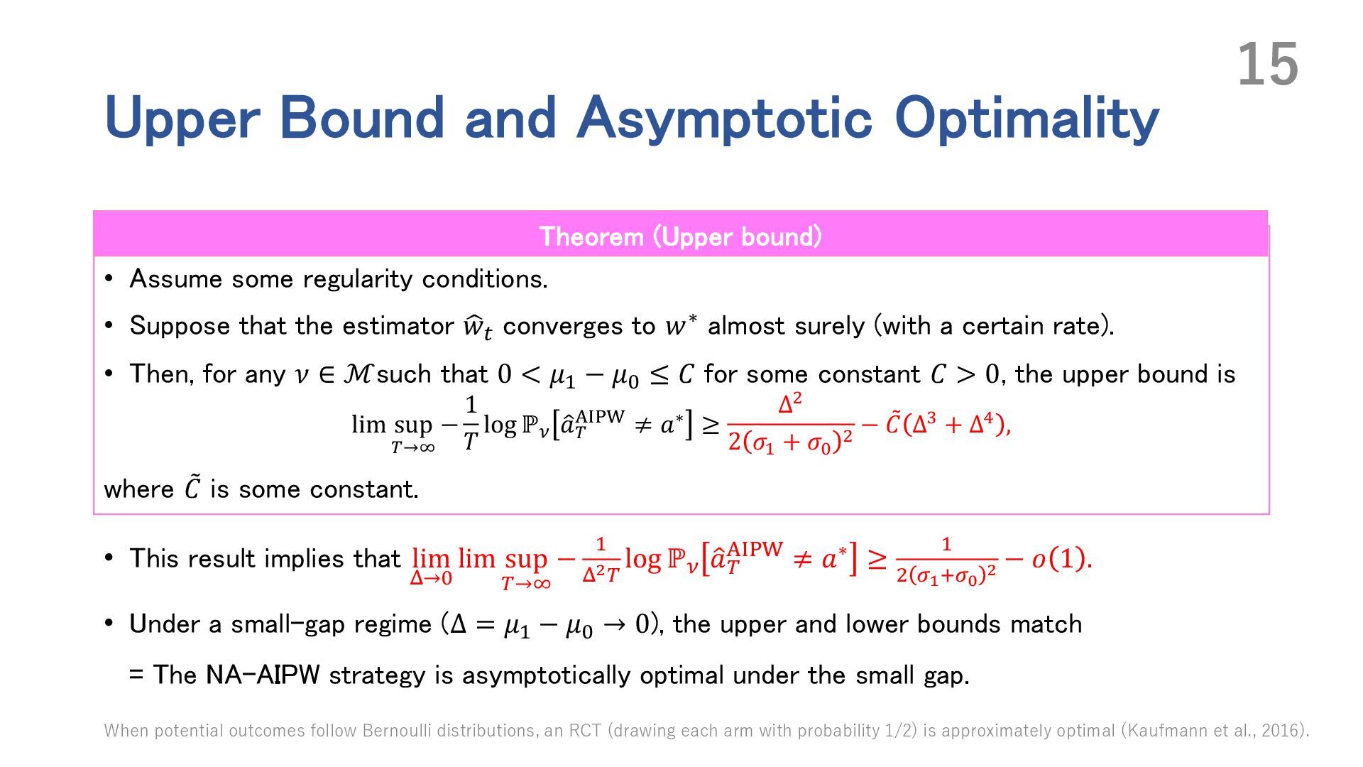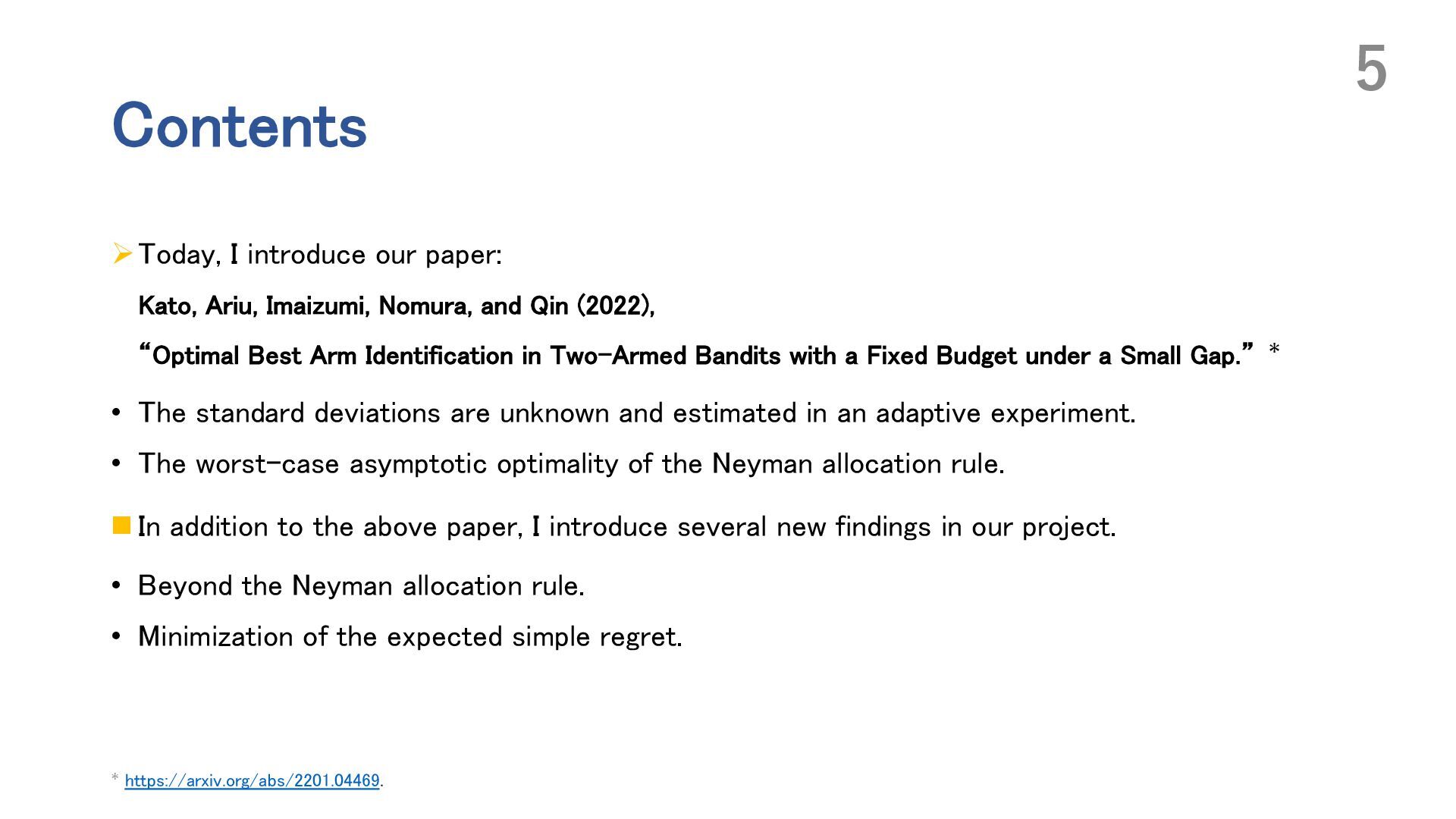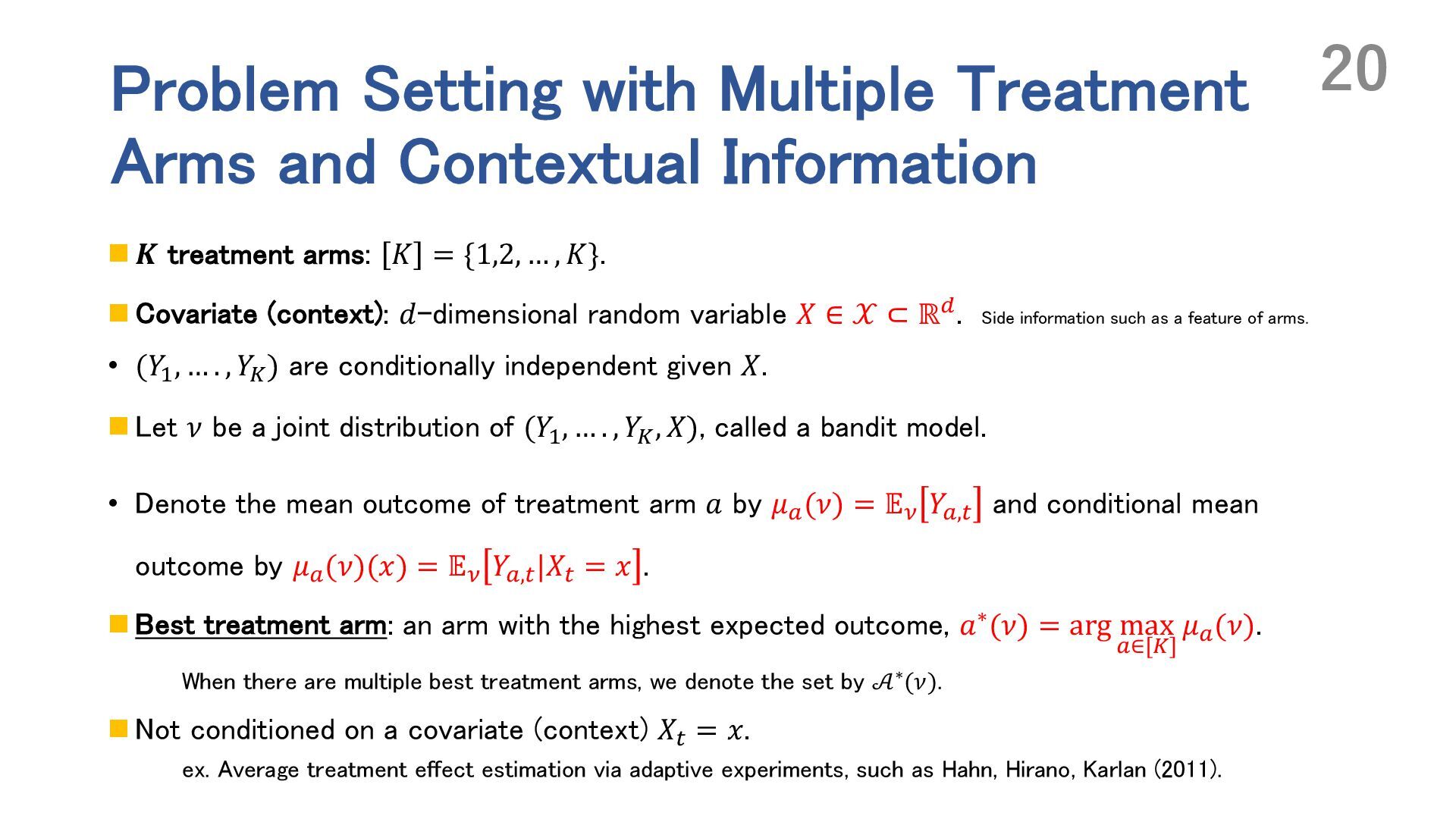 and Qin, C. (2022), โBest Arm Identification with a Fixed Budget under a Small Gap.โ โข Audibert, J.-Y., Bubeck, S., and Munos, R. (2010), โBest Arm Identification in Multi-Armed Bandits,โ in COLT. โข Bubeck, S., Munos, R., and Stoltz, G. (2011), โPure exploration in finitely-armed and continuous-armed bandits,โ Theoretical Computer Science. โข Carpentier, A. and Locatelli, A. (2016), โTight (Lower) Bounds for the Fixed Budget Best Arm Identification Bandit Problem,โ in COLT โข Chen, C.-H., Lin, J., Yรผcesan, E., and Chick, S. E (2000). Simulation budget allocation for further enhancing the efficiency of ordinal optimization. Discrete Event Dynamic Systems, โข Garivier, A. and Kaufmann, E. (2016), โOptimal Best Arm Identification with Fixed Confidence,โ in COLT. โข Glynn, P. and Juneja, S. (2004), โA large deviations perspective on ordinal optimization,โ in Proceedings of the 2004 Winter Simulation Conference, IEEE. โข Kaufmann, E., Cappรฉ, O., and Garivier, A. (2016), โOn the Complexity of Best-Arm Identification in Multi-Armed Bandit Models,โ JMLR. โข Lai, T. and Robbins, H. (1985), โAsymptotically efficient adaptive allocation rules,โ Advances in Applied Mathematics. โข Manski, C. F. (2000), โIdentification problems and decisions under ambiguity: Empirical analysis of treatment response and normative analysis of treatment choice,โ Journal of Econometrics. - (2002), โTreatment choice under ambiguity induced by inferential problems,โ Journal of Statistical Planning and Inference. - (2004), โStatistical treatment rules for heterogeneous populations,โ Econometrica. โข Manski, C. F. and Tetenov, A. (2016), โSufficient trial size to inform clinical practice,โ Proceedings of the National Academy of Science. โข Stoye, J. (2009), โMinimax regret treatment choice with finite samples,โ Journal of Econometrics. 35
