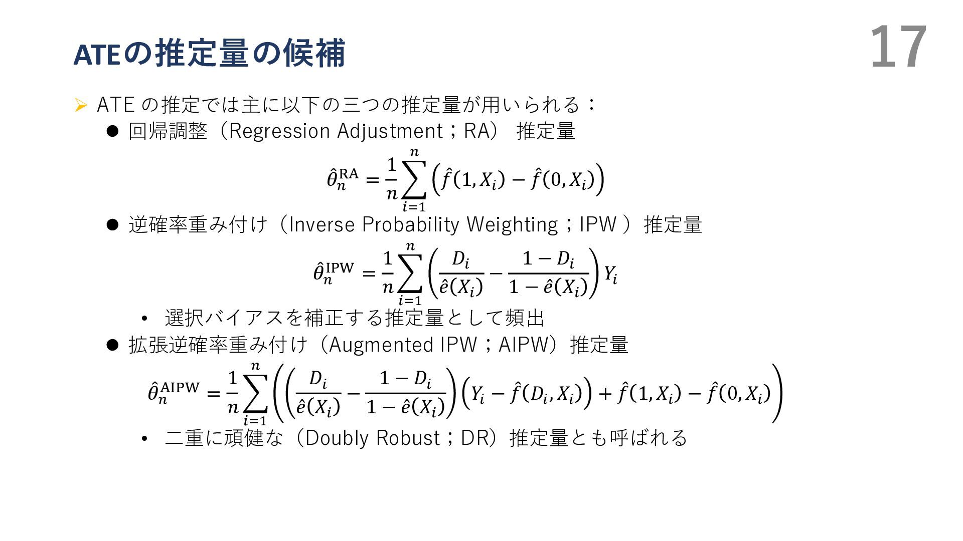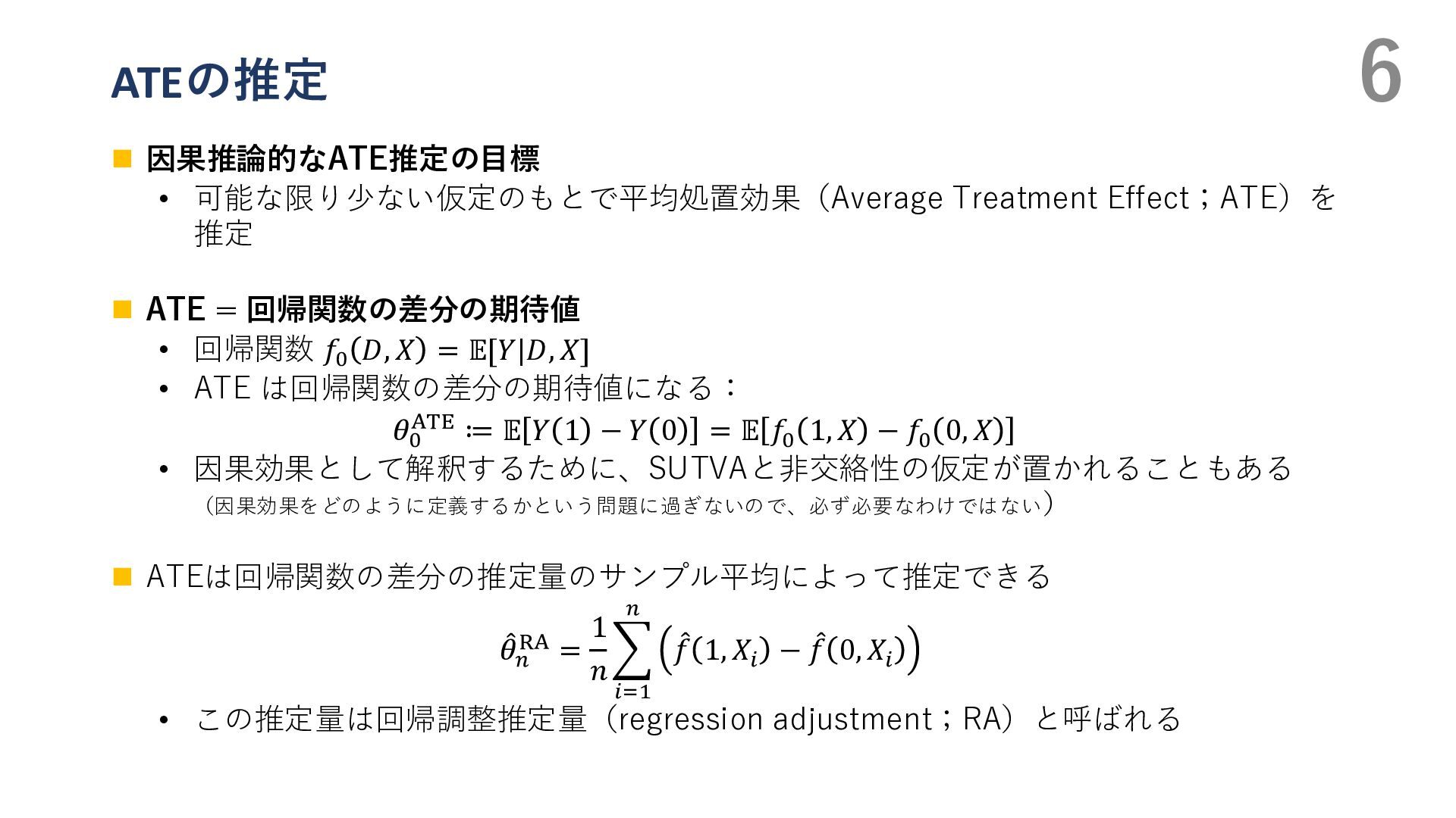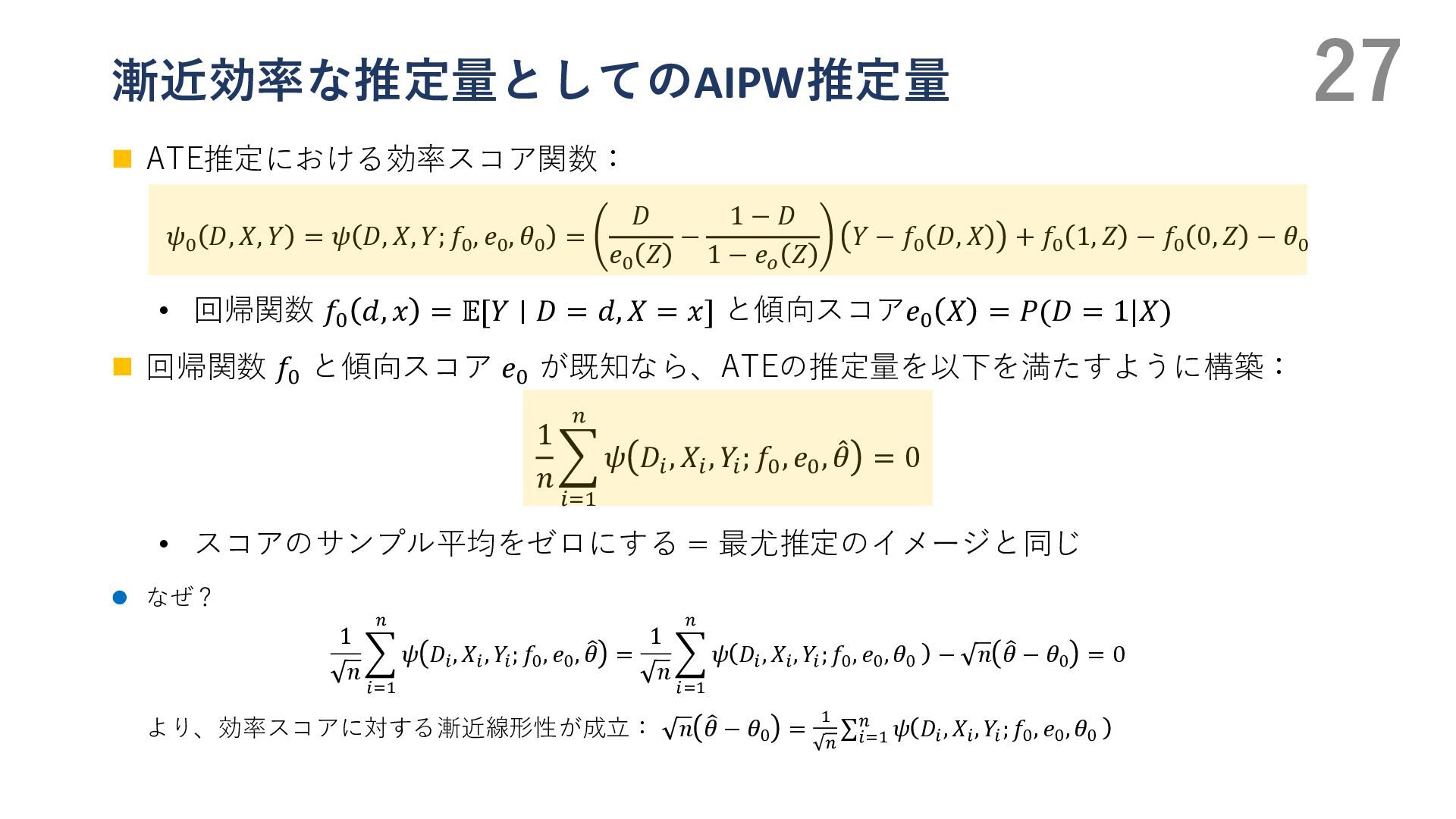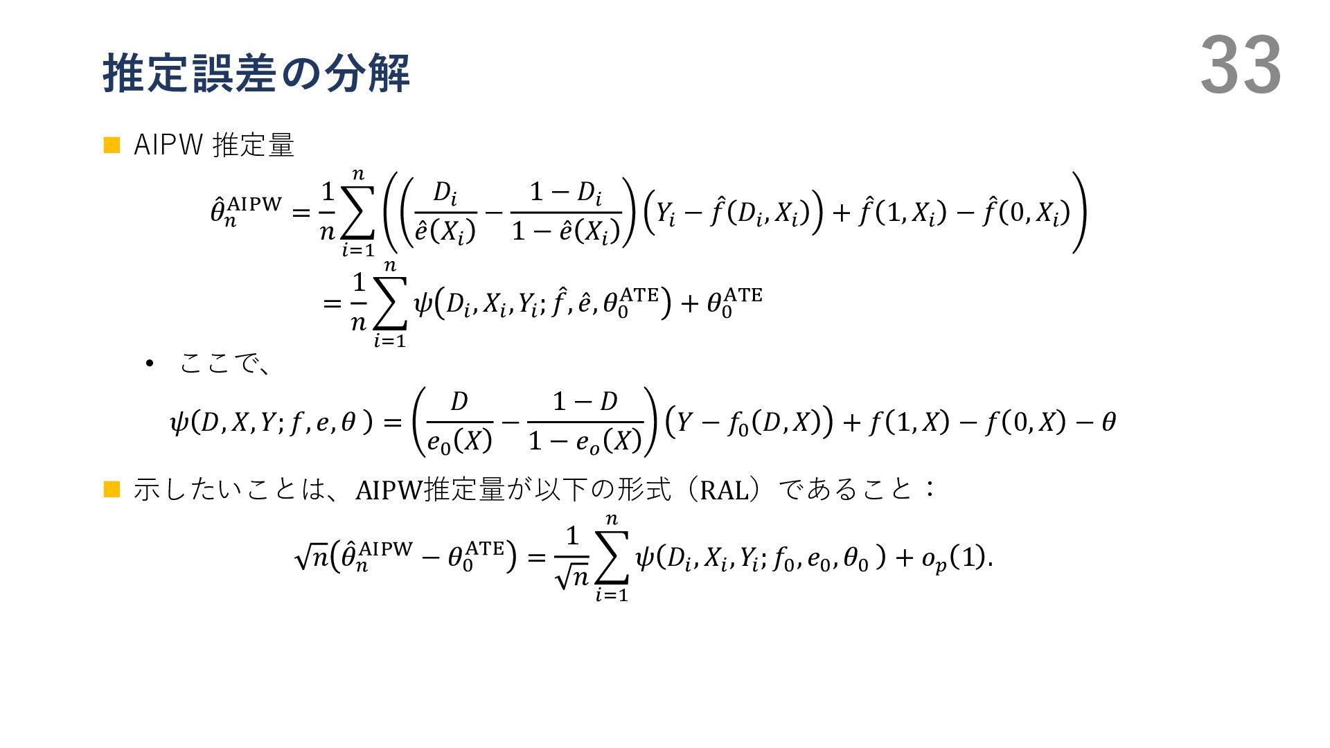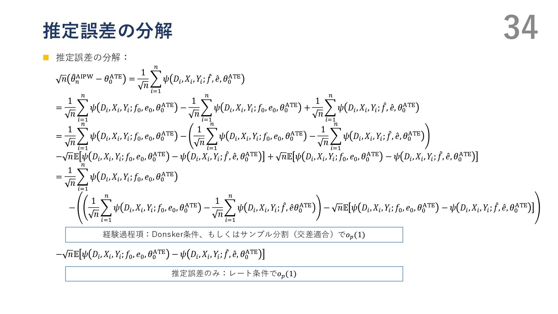 ATE = 1 𝑛 𝑖=1 𝑛 𝜓 𝐷𝑖 , 𝑋𝑖 , 𝑌𝑖 ; መ 𝑓, Ƹ 𝑒, 𝜃0 ATE = 1 𝑛 𝑖=1 𝑛 𝜓 𝐷𝑖 , 𝑋𝑖 , 𝑌𝑖 ; 𝑓0 , 𝑒0 , 𝜃0 ATE − 1 𝑛 𝑖=1 𝑛 𝜓 𝐷𝑖 , 𝑋𝑖 , 𝑌𝑖 ; 𝑓0 , 𝑒0 , 𝜃0 ATE + 1 𝑛 𝑖=1 𝑛 𝜓 𝐷𝑖 , 𝑋𝑖 , 𝑌𝑖 ; መ 𝑓, Ƹ 𝑒, 𝜃0 ATE = 1 𝑛 𝑖=1 𝑛 𝜓 𝐷𝑖 , 𝑋𝑖 , 𝑌𝑖 ; 𝑓0 , 𝑒0 , 𝜃0 ATE − 1 𝑛 𝑖=1 𝑛 𝜓 𝐷𝑖 , 𝑋𝑖 , 𝑌𝑖 ; 𝑓0 , 𝑒0 , 𝜃0 ATE − 1 𝑛 𝑖=1 𝑛 𝜓 𝐷𝑖 , 𝑋𝑖 , 𝑌𝑖 ; መ 𝑓, Ƹ 𝑒, 𝜃0 ATE − 𝑛𝔼 𝜓 𝐷𝑖 , 𝑋𝑖 , 𝑌𝑖 ; 𝑓0 , 𝑒0 , 𝜃0 ATE − 𝜓 𝐷𝑖 , 𝑋𝑖 , 𝑌𝑖 ; መ 𝑓, Ƹ 𝑒, 𝜃0 ATE + 𝑛𝔼 𝜓 𝐷𝑖 , 𝑋𝑖 , 𝑌𝑖 ; 𝑓0 , 𝑒0 , 𝜃0 ATE − 𝜓 𝐷𝑖 , 𝑋𝑖 , 𝑌𝑖 ; መ 𝑓, Ƹ 𝑒, 𝜃0 ATE = 1 𝑛 𝑖=1 𝑛 𝜓 𝐷𝑖 , 𝑋𝑖 , 𝑌𝑖 ; 𝑓0 , 𝑒0 , 𝜃0 ATE − 1 𝑛 𝑖=1 𝑛 𝜓 𝐷𝑖 , 𝑋𝑖 , 𝑌𝑖 ; 𝑓0 , 𝑒0 , 𝜃0 ATE − 1 𝑛 𝑖=1 𝑛 𝜓 𝐷𝑖 , 𝑋𝑖 , 𝑌𝑖 ; መ 𝑓, Ƹ 𝑒𝜃0 ATE − 𝑛𝔼 𝜓 𝐷𝑖 , 𝑋𝑖 , 𝑌𝑖 ; 𝑓0 , 𝑒0 , 𝜃0 ATE − 𝜓 𝐷𝑖 , 𝑋𝑖 , 𝑌𝑖 ; መ 𝑓, Ƹ 𝑒, 𝜃0 ATE − 𝑛𝔼 𝜓 𝐷𝑖 , 𝑋𝑖 , 𝑌𝑖 ; 𝑓0 , 𝑒0 , 𝜃0 ATE − 𝜓 𝐷𝑖 , 𝑋𝑖 , 𝑌𝑖 ; መ 𝑓, Ƹ 𝑒, 𝜃0 ATE 経験過程項:Donsker条件、もしくはサンプル分割(交差適合)で𝑜𝑝 (1) 推定誤差のみ:レート条件で𝑜𝑝 (1)