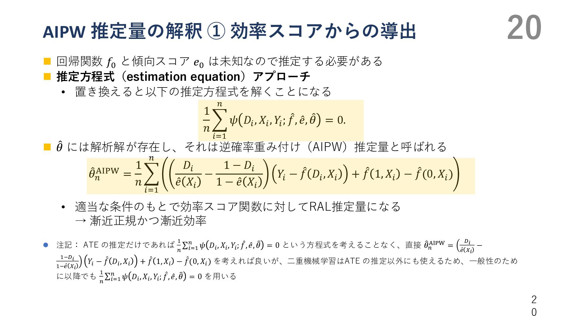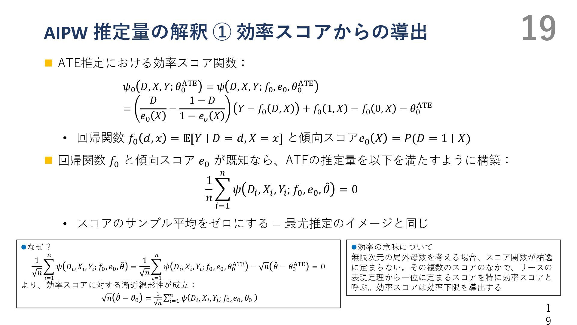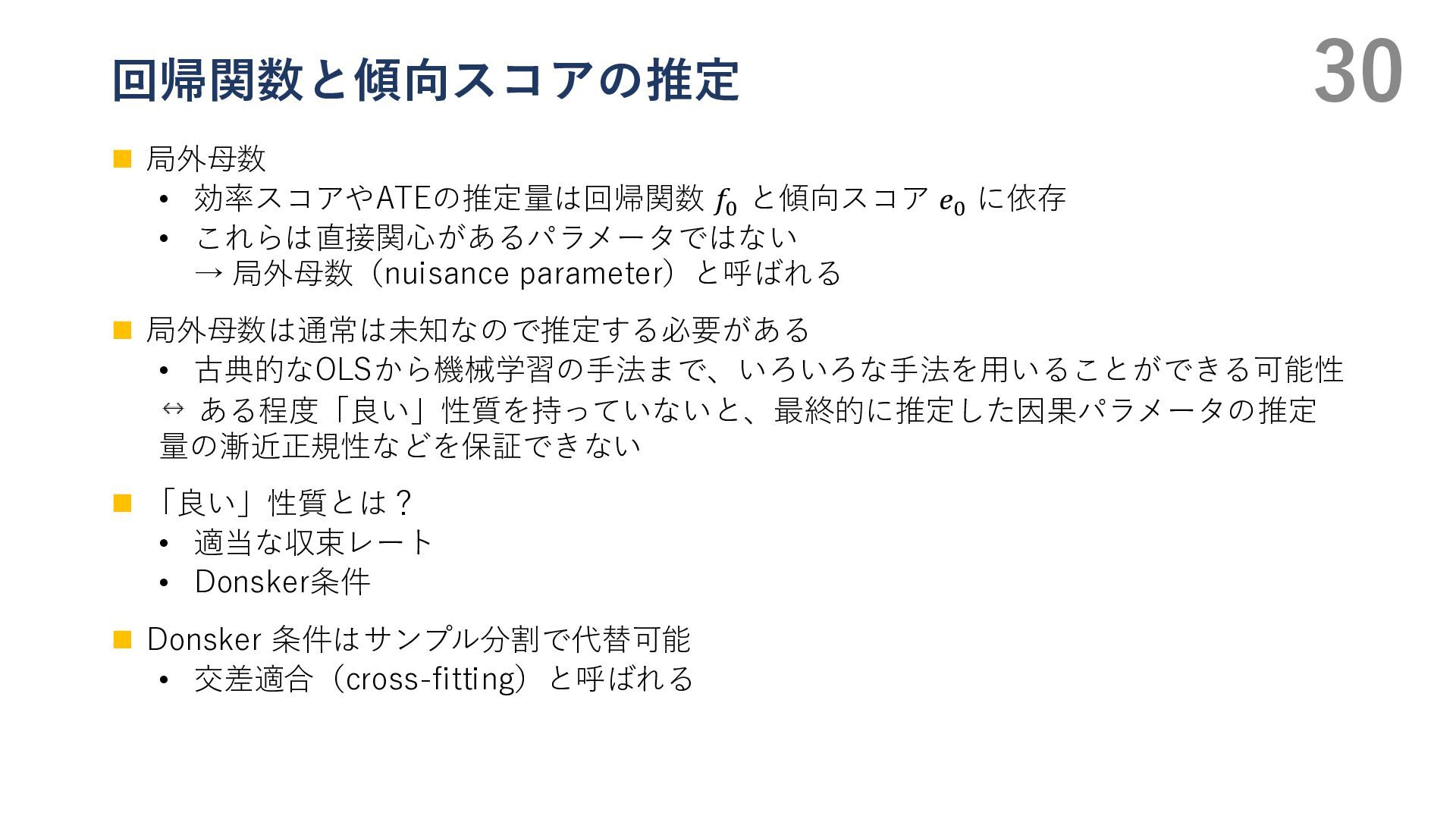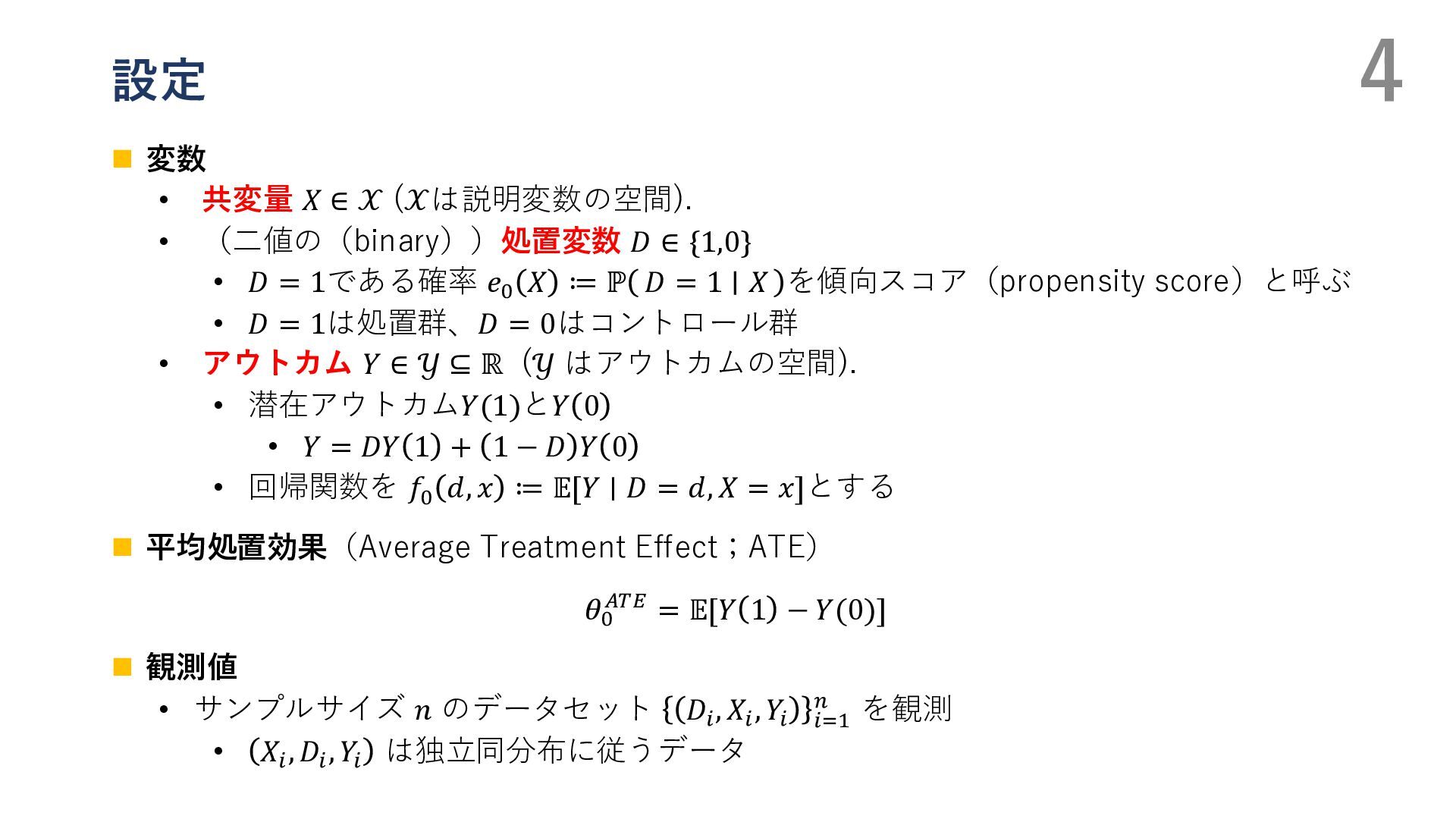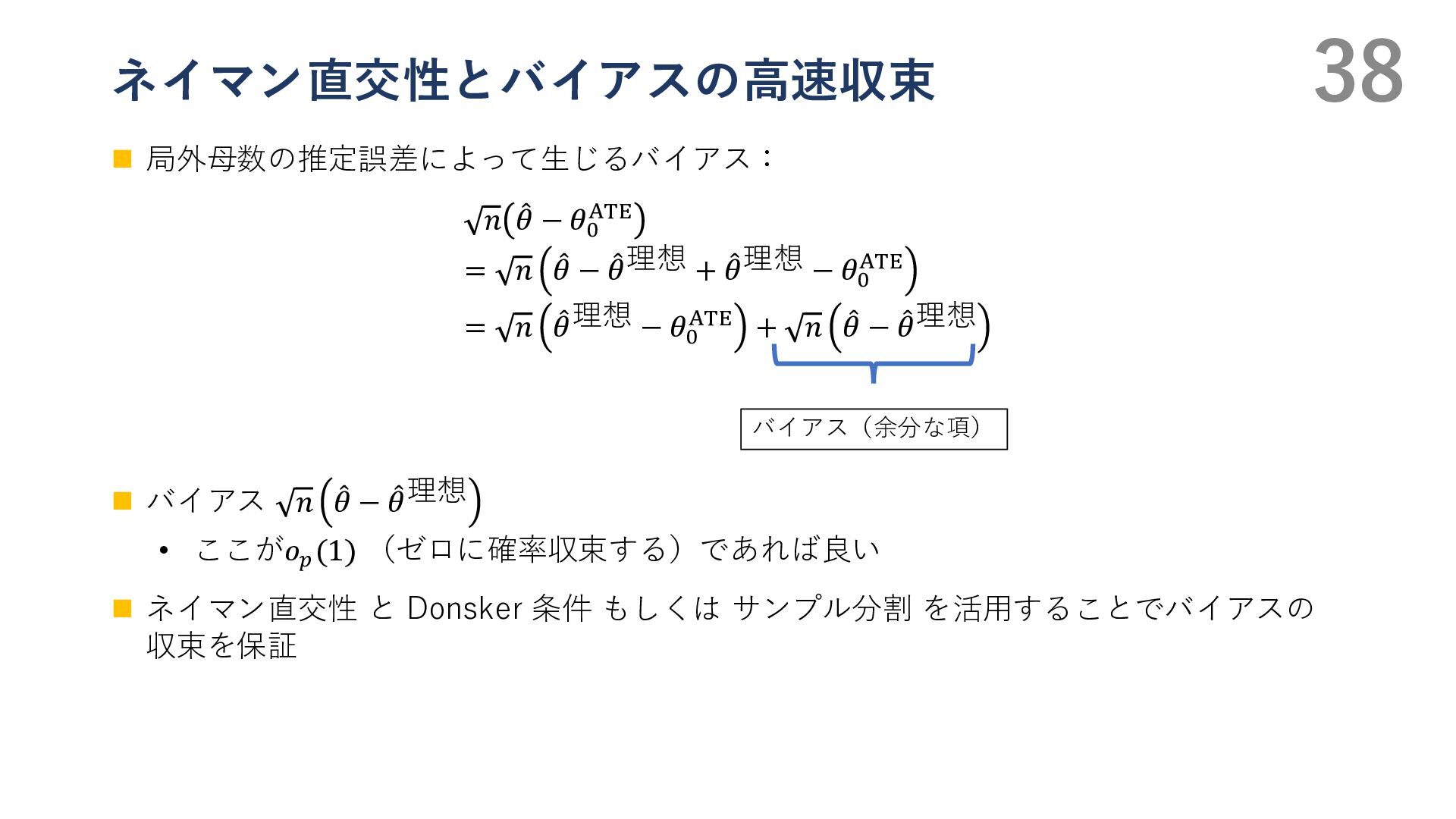 ATE = 1 𝑛 𝑖=1 𝑛 𝜓 𝐷𝑖 , 𝑋𝑖 , 𝑌𝑖 ; መ 𝑓, Ƹ 𝑒, 𝜃0 ATE = 1 𝑛 𝑖=1 𝑛 𝜓 𝐷𝑖 , 𝑋𝑖 , 𝑌𝑖 ; 𝑓0 , 𝑒0 , 𝜃0 ATE − 1 𝑛 𝑖=1 𝑛 𝜓 𝐷𝑖 , 𝑋𝑖 , 𝑌𝑖 ; 𝑓0 , 𝑒0 , 𝜃0 ATE + 1 𝑛 𝑖=1 𝑛 𝜓 𝐷𝑖 , 𝑋𝑖 , 𝑌𝑖 ; መ 𝑓, Ƹ 𝑒, 𝜃0 ATE = 1 𝑛 𝑖=1 𝑛 𝜓 𝐷𝑖 , 𝑋𝑖 , 𝑌𝑖 ; 𝑓0 , 𝑒0 , 𝜃0 ATE − 1 𝑛 𝑖=1 𝑛 𝜓 𝐷𝑖 , 𝑋𝑖 , 𝑌𝑖 ; 𝑓0 , 𝑒0 , 𝜃0 ATE − 1 𝑛 𝑖=1 𝑛 𝜓 𝐷𝑖 , 𝑋𝑖 , 𝑌𝑖 ; መ 𝑓, Ƹ 𝑒, 𝜃0 ATE − 𝑛𝔼 𝜓 𝐷𝑖 , 𝑋𝑖 , 𝑌𝑖 ; 𝑓0 , 𝑒0 , 𝜃0 ATE − 𝜓 𝐷𝑖 , 𝑋𝑖 , 𝑌𝑖 ; መ 𝑓, Ƹ 𝑒, 𝜃0 ATE + 𝑛𝔼 𝜓 𝐷𝑖 , 𝑋𝑖 , 𝑌𝑖 ; 𝑓0 , 𝑒0 , 𝜃0 ATE − 𝜓 𝐷𝑖 , 𝑋𝑖 , 𝑌𝑖 ; መ 𝑓, Ƹ 𝑒, 𝜃0 ATE = 1 𝑛 𝑖=1 𝑛 𝜓 𝐷𝑖 , 𝑋𝑖 , 𝑌𝑖 ; 𝑓0 , 𝑒0 , 𝜃0 ATE − 1 𝑛 𝑖=1 𝑛 𝜓 𝐷𝑖 , 𝑋𝑖 , 𝑌𝑖 ; 𝑓0 , 𝑒0 , 𝜃0 ATE − 1 𝑛 𝑖=1 𝑛 𝜓 𝐷𝑖 , 𝑋𝑖 , 𝑌𝑖 ; መ 𝑓, Ƹ 𝑒𝜃0 ATE − 𝑛𝔼 𝜓 𝐷𝑖 , 𝑋𝑖 , 𝑌𝑖 ; 𝑓0 , 𝑒0 , 𝜃0 ATE − 𝜓 𝐷𝑖 , 𝑋𝑖 , 𝑌𝑖 ; መ 𝑓, Ƹ 𝑒, 𝜃0 ATE − 𝑛𝔼 𝜓 𝐷𝑖 , 𝑋𝑖 , 𝑌𝑖 ; 𝑓0 , 𝑒0 , 𝜃0 ATE − 𝜓 𝐷𝑖 , 𝑋𝑖 , 𝑌𝑖 ; መ 𝑓, Ƹ 𝑒, 𝜃0 ATE 経験過程項:Donsker条件、もしくはサンプル分割(交差適合)で𝑜𝑝 (1) 推定誤差のみ:レート条件で𝑜𝑝 (1)