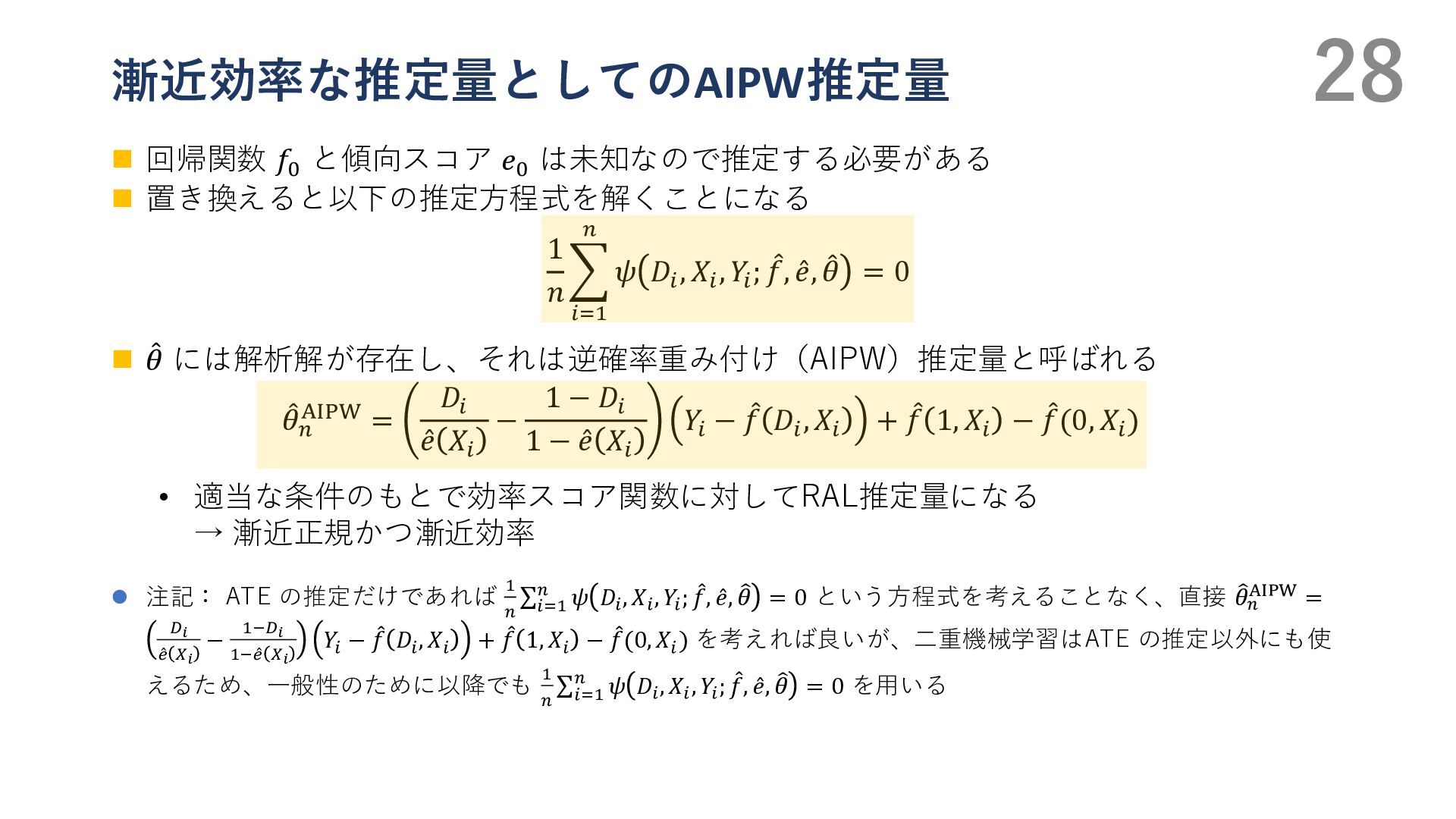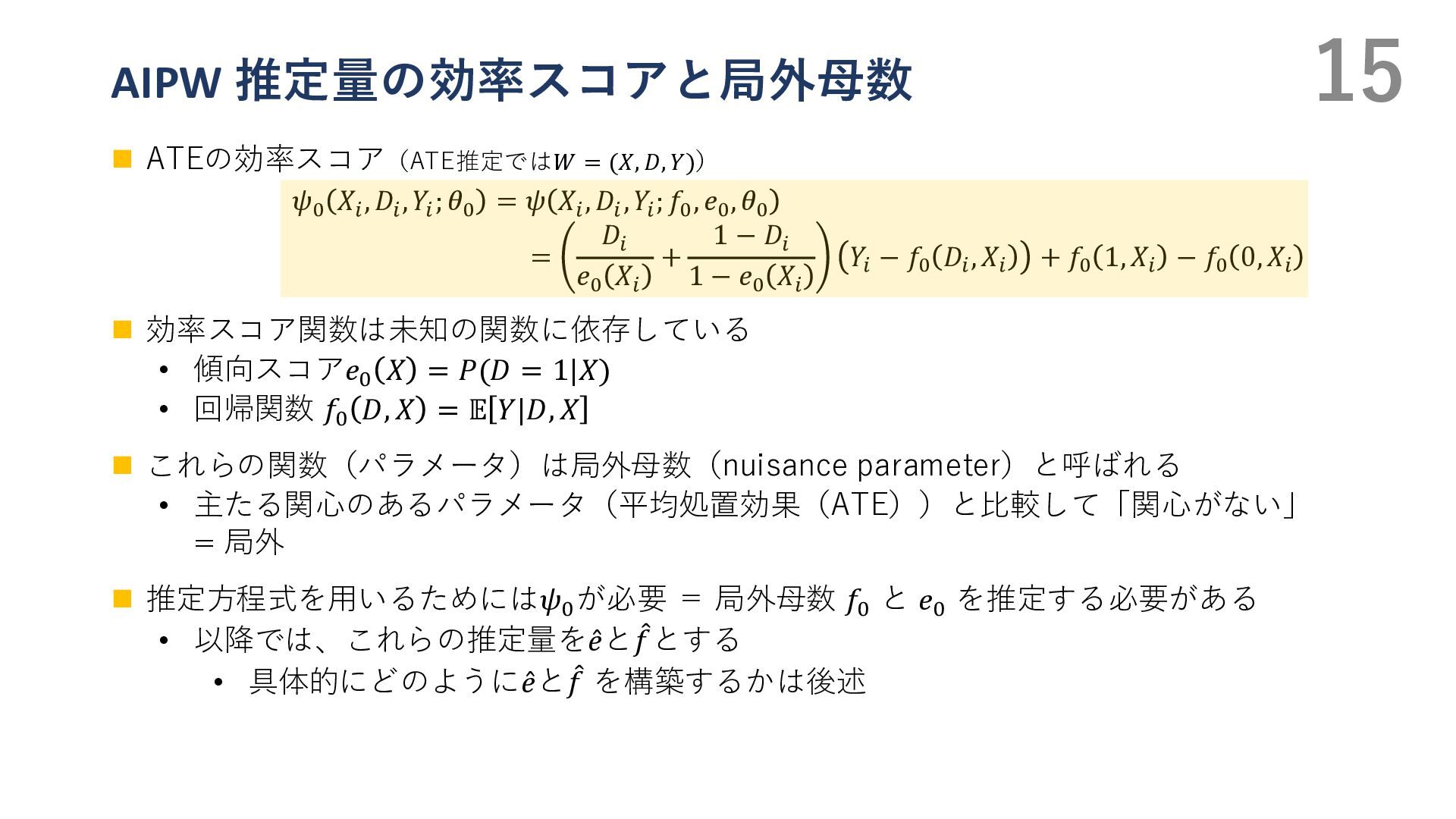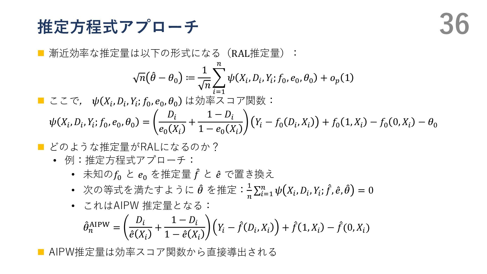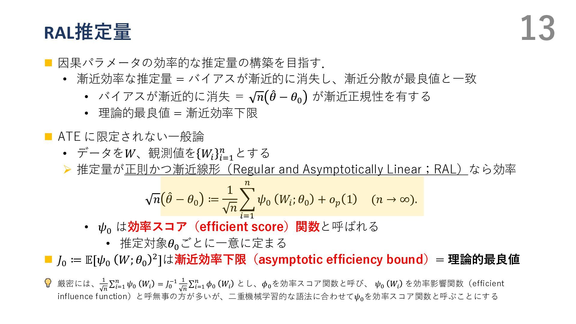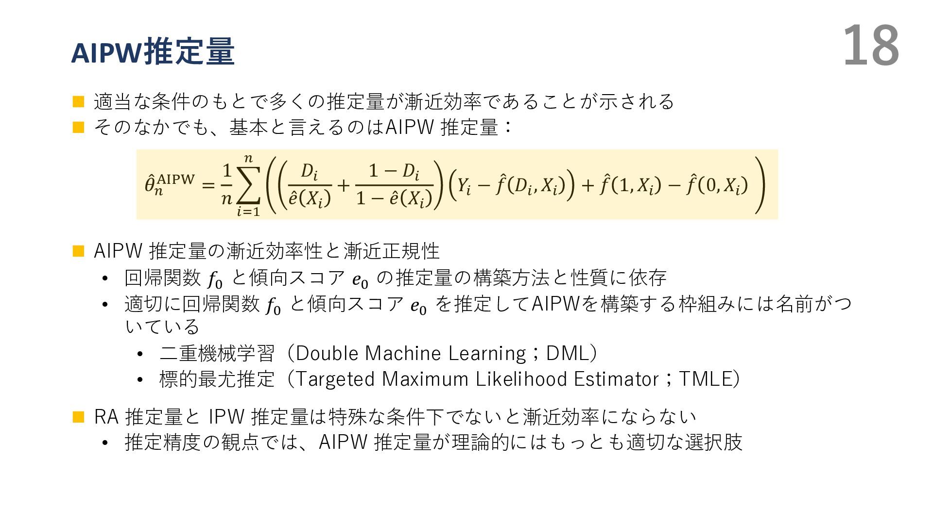 ATE = 1 𝑛 𝑖=1 𝑛 𝜓 𝐷𝑖 , 𝑋𝑖 , 𝑌𝑖 ; መ 𝑓, Ƹ 𝑒, 𝜃0 ATE = 1 𝑛 𝑖=1 𝑛 𝜓 𝐷𝑖 , 𝑋𝑖 , 𝑌𝑖 ; 𝑓0 , 𝑒0 , 𝜃0 ATE − 1 𝑛 𝑖=1 𝑛 𝜓 𝐷𝑖 , 𝑋𝑖 , 𝑌𝑖 ; 𝑓0 , 𝑒0 , 𝜃0 ATE + 1 𝑛 𝑖=1 𝑛 𝜓 𝐷𝑖 , 𝑋𝑖 , 𝑌𝑖 ; መ 𝑓, Ƹ 𝑒, 𝜃0 ATE = 1 𝑛 𝑖=1 𝑛 𝜓 𝐷𝑖 , 𝑋𝑖 , 𝑌𝑖 ; 𝑓0 , 𝑒0 , 𝜃0 ATE − 1 𝑛 𝑖=1 𝑛 𝜓 𝐷𝑖 , 𝑋𝑖 , 𝑌𝑖 ; 𝑓0 , 𝑒0 , 𝜃0 ATE − 1 𝑛 𝑖=1 𝑛 𝜓 𝐷𝑖 , 𝑋𝑖 , 𝑌𝑖 ; መ 𝑓, Ƹ 𝑒, 𝜃0 ATE − 𝑛𝔼 𝜓 𝐷𝑖 , 𝑋𝑖 , 𝑌𝑖 ; 𝑓0 , 𝑒0 , 𝜃0 ATE − 𝜓 𝐷𝑖 , 𝑋𝑖 , 𝑌𝑖 ; መ 𝑓, Ƹ 𝑒, 𝜃0 ATE + 𝑛𝔼 𝜓 𝐷𝑖 , 𝑋𝑖 , 𝑌𝑖 ; 𝑓0 , 𝑒0 , 𝜃0 ATE − 𝜓 𝐷𝑖 , 𝑋𝑖 , 𝑌𝑖 ; መ 𝑓, Ƹ 𝑒, 𝜃0 ATE = 1 𝑛 𝑖=1 𝑛 𝜓 𝐷𝑖 , 𝑋𝑖 , 𝑌𝑖 ; 𝑓0 , 𝑒0 , 𝜃0 ATE − 1 𝑛 𝑖=1 𝑛 𝜓 𝐷𝑖 , 𝑋𝑖 , 𝑌𝑖 ; 𝑓0 , 𝑒0 , 𝜃0 ATE − 1 𝑛 𝑖=1 𝑛 𝜓 𝐷𝑖 , 𝑋𝑖 , 𝑌𝑖 ; መ 𝑓, Ƹ 𝑒𝜃0 ATE − 𝑛𝔼 𝜓 𝐷𝑖 , 𝑋𝑖 , 𝑌𝑖 ; 𝑓0 , 𝑒0 , 𝜃0 ATE − 𝜓 𝐷𝑖 , 𝑋𝑖 , 𝑌𝑖 ; መ 𝑓, Ƹ 𝑒, 𝜃0 ATE − 𝑛𝔼 𝜓 𝐷𝑖 , 𝑋𝑖 , 𝑌𝑖 ; 𝑓0 , 𝑒0 , 𝜃0 ATE − 𝜓 𝐷𝑖 , 𝑋𝑖 , 𝑌𝑖 ; መ 𝑓, Ƹ 𝑒, 𝜃0 ATE 経験過程項:Donsker条件、もしくはサンプル分割(交差適合)で𝑜𝑝 (1) 推定誤差のみ:レート条件で𝑜𝑝 (1)