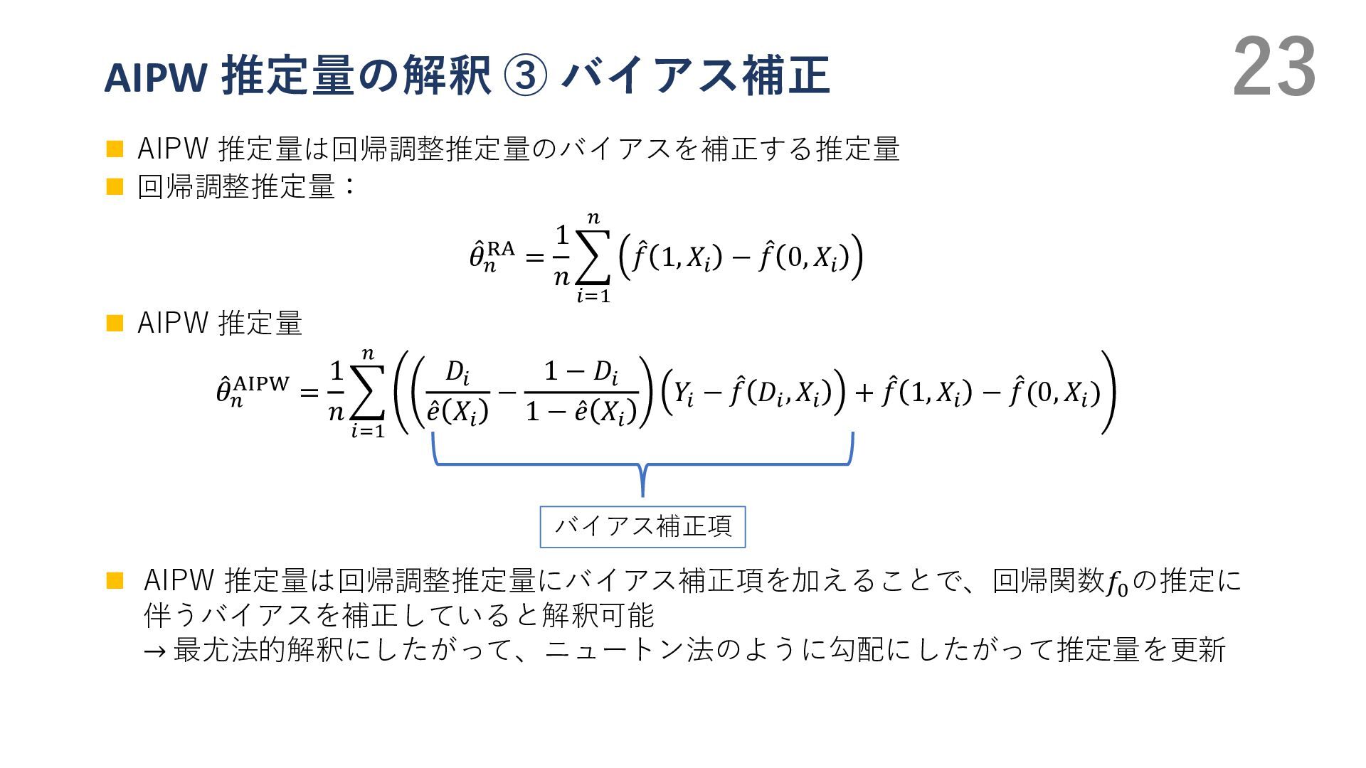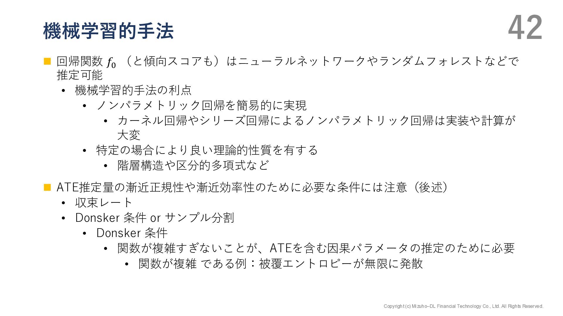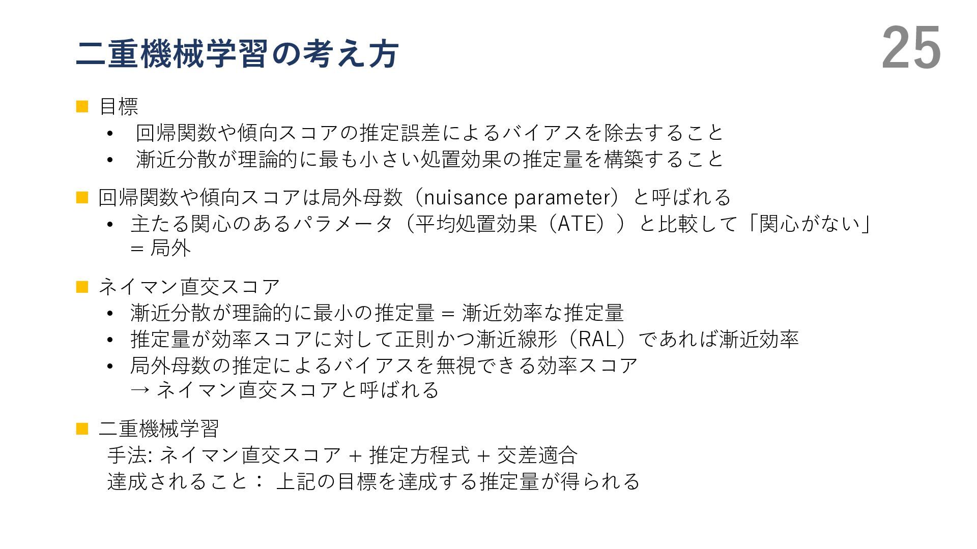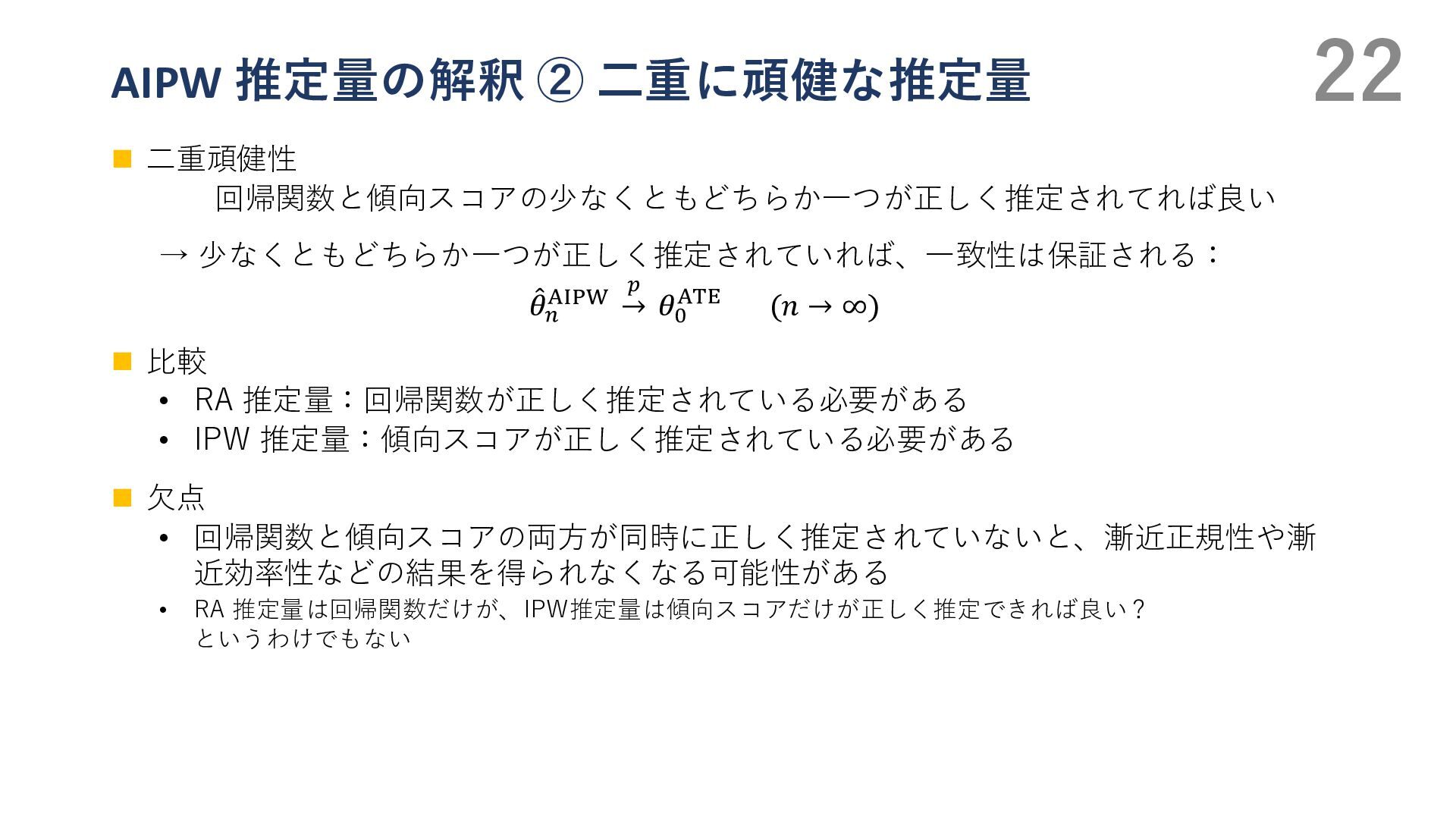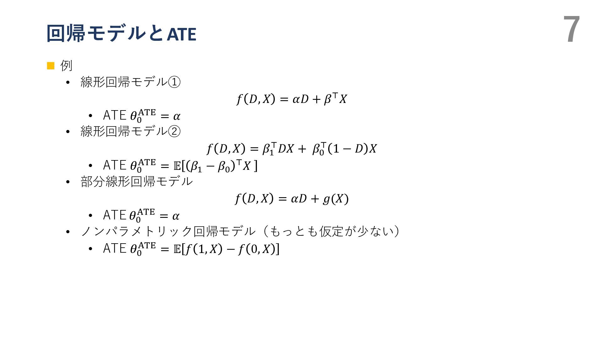 ATE = 1 𝑛 𝑖=1 𝑛 𝜓 𝐷𝑖 , 𝑋𝑖 , 𝑌𝑖 ; መ 𝑓, Ƹ 𝑒, 𝜃0 ATE = 1 𝑛 𝑖=1 𝑛 𝜓 𝐷𝑖 , 𝑋𝑖 , 𝑌𝑖 ; 𝑓0 , 𝑒0 , 𝜃0 ATE − 1 𝑛 𝑖=1 𝑛 𝜓 𝐷𝑖 , 𝑋𝑖 , 𝑌𝑖 ; 𝑓0 , 𝑒0 , 𝜃0 ATE + 1 𝑛 𝑖=1 𝑛 𝜓 𝐷𝑖 , 𝑋𝑖 , 𝑌𝑖 ; መ 𝑓, Ƹ 𝑒, 𝜃0 ATE = 1 𝑛 𝑖=1 𝑛 𝜓 𝐷𝑖 , 𝑋𝑖 , 𝑌𝑖 ; 𝑓0 , 𝑒0 , 𝜃0 ATE − 1 𝑛 𝑖=1 𝑛 𝜓 𝐷𝑖 , 𝑋𝑖 , 𝑌𝑖 ; 𝑓0 , 𝑒0 , 𝜃0 ATE − 1 𝑛 𝑖=1 𝑛 𝜓 𝐷𝑖 , 𝑋𝑖 , 𝑌𝑖 ; መ 𝑓, Ƹ 𝑒, 𝜃0 ATE − 𝑛𝔼 𝜓 𝐷𝑖 , 𝑋𝑖 , 𝑌𝑖 ; 𝑓0 , 𝑒0 , 𝜃0 ATE − 𝜓 𝐷𝑖 , 𝑋𝑖 , 𝑌𝑖 ; መ 𝑓, Ƹ 𝑒, 𝜃0 ATE + 𝑛𝔼 𝜓 𝐷𝑖 , 𝑋𝑖 , 𝑌𝑖 ; 𝑓0 , 𝑒0 , 𝜃0 ATE − 𝜓 𝐷𝑖 , 𝑋𝑖 , 𝑌𝑖 ; መ 𝑓, Ƹ 𝑒, 𝜃0 ATE = 1 𝑛 𝑖=1 𝑛 𝜓 𝐷𝑖 , 𝑋𝑖 , 𝑌𝑖 ; 𝑓0 , 𝑒0 , 𝜃0 ATE − 1 𝑛 𝑖=1 𝑛 𝜓 𝐷𝑖 , 𝑋𝑖 , 𝑌𝑖 ; 𝑓0 , 𝑒0 , 𝜃0 ATE − 1 𝑛 𝑖=1 𝑛 𝜓 𝐷𝑖 , 𝑋𝑖 , 𝑌𝑖 ; መ 𝑓, Ƹ 𝑒𝜃0 ATE − 𝑛𝔼 𝜓 𝐷𝑖 , 𝑋𝑖 , 𝑌𝑖 ; 𝑓0 , 𝑒0 , 𝜃0 ATE − 𝜓 𝐷𝑖 , 𝑋𝑖 , 𝑌𝑖 ; መ 𝑓, Ƹ 𝑒, 𝜃0 ATE − 𝑛𝔼 𝜓 𝐷𝑖 , 𝑋𝑖 , 𝑌𝑖 ; 𝑓0 , 𝑒0 , 𝜃0 ATE − 𝜓 𝐷𝑖 , 𝑋𝑖 , 𝑌𝑖 ; መ 𝑓, Ƹ 𝑒, 𝜃0 ATE 経験過程項:Donsker条件、もしくはサンプル分割(交差適合)で𝑜𝑝 (1) 推定誤差のみ:レート条件で𝑜𝑝 (1)