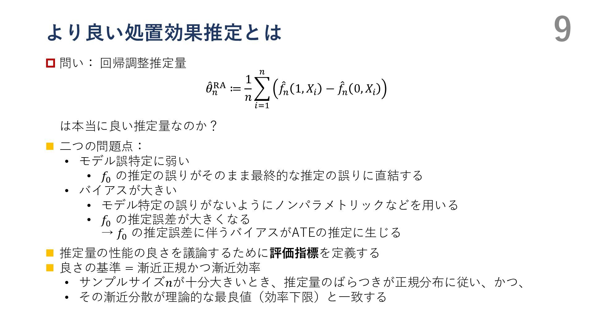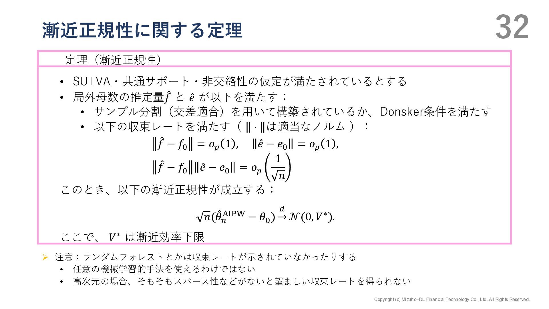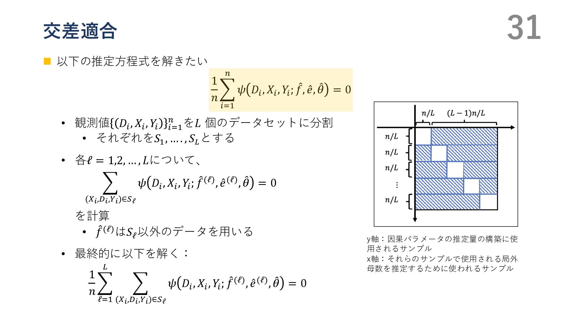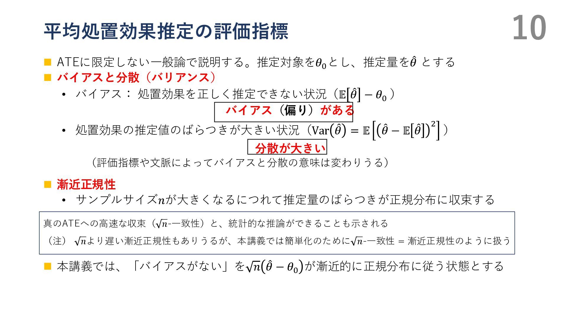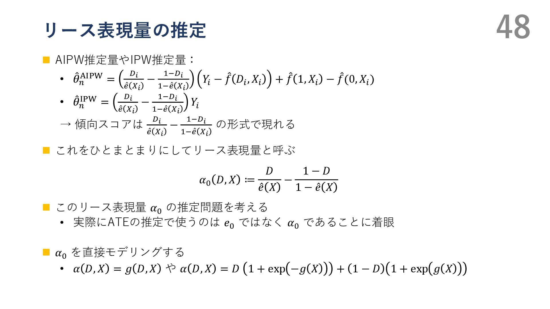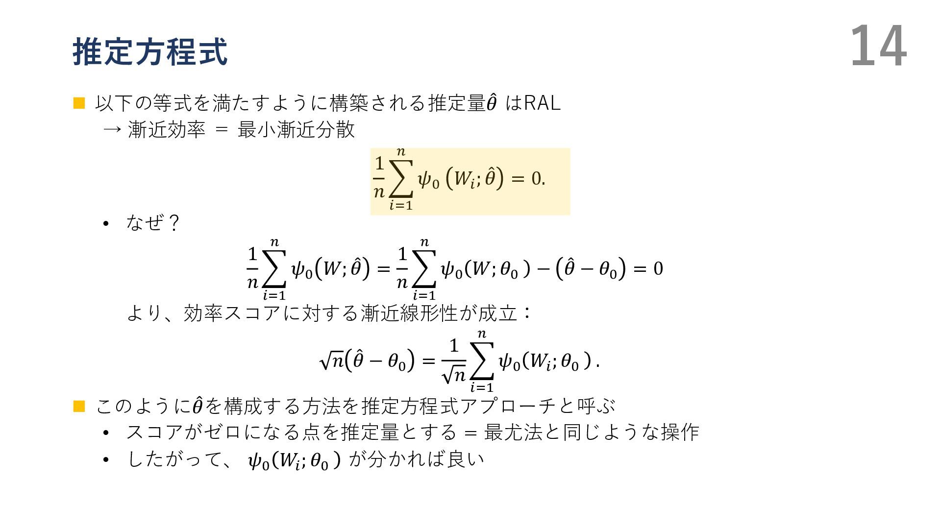 ATE = 1 𝑛 𝑖=1 𝑛 𝜓 𝐷𝑖 , 𝑋𝑖 , 𝑌𝑖 ; መ 𝑓, Ƹ 𝑒, 𝜃0 ATE = 1 𝑛 𝑖=1 𝑛 𝜓 𝐷𝑖 , 𝑋𝑖 , 𝑌𝑖 ; 𝑓0 , 𝑒0 , 𝜃0 ATE − 1 𝑛 𝑖=1 𝑛 𝜓 𝐷𝑖 , 𝑋𝑖 , 𝑌𝑖 ; 𝑓0 , 𝑒0 , 𝜃0 ATE + 1 𝑛 𝑖=1 𝑛 𝜓 𝐷𝑖 , 𝑋𝑖 , 𝑌𝑖 ; መ 𝑓, Ƹ 𝑒, 𝜃0 ATE = 1 𝑛 𝑖=1 𝑛 𝜓 𝐷𝑖 , 𝑋𝑖 , 𝑌𝑖 ; 𝑓0 , 𝑒0 , 𝜃0 ATE − 1 𝑛 𝑖=1 𝑛 𝜓 𝐷𝑖 , 𝑋𝑖 , 𝑌𝑖 ; 𝑓0 , 𝑒0 , 𝜃0 ATE − 1 𝑛 𝑖=1 𝑛 𝜓 𝐷𝑖 , 𝑋𝑖 , 𝑌𝑖 ; መ 𝑓, Ƹ 𝑒, 𝜃0 ATE − 𝑛𝔼 𝜓 𝐷𝑖 , 𝑋𝑖 , 𝑌𝑖 ; 𝑓0 , 𝑒0 , 𝜃0 ATE − 𝜓 𝐷𝑖 , 𝑋𝑖 , 𝑌𝑖 ; መ 𝑓, Ƹ 𝑒, 𝜃0 ATE + 𝑛𝔼 𝜓 𝐷𝑖 , 𝑋𝑖 , 𝑌𝑖 ; 𝑓0 , 𝑒0 , 𝜃0 ATE − 𝜓 𝐷𝑖 , 𝑋𝑖 , 𝑌𝑖 ; መ 𝑓, Ƹ 𝑒, 𝜃0 ATE = 1 𝑛 𝑖=1 𝑛 𝜓 𝐷𝑖 , 𝑋𝑖 , 𝑌𝑖 ; 𝑓0 , 𝑒0 , 𝜃0 ATE − 1 𝑛 𝑖=1 𝑛 𝜓 𝐷𝑖 , 𝑋𝑖 , 𝑌𝑖 ; 𝑓0 , 𝑒0 , 𝜃0 ATE − 1 𝑛 𝑖=1 𝑛 𝜓 𝐷𝑖 , 𝑋𝑖 , 𝑌𝑖 ; መ 𝑓, Ƹ 𝑒𝜃0 ATE − 𝑛𝔼 𝜓 𝐷𝑖 , 𝑋𝑖 , 𝑌𝑖 ; 𝑓0 , 𝑒0 , 𝜃0 ATE − 𝜓 𝐷𝑖 , 𝑋𝑖 , 𝑌𝑖 ; መ 𝑓, Ƹ 𝑒, 𝜃0 ATE − 𝑛𝔼 𝜓 𝐷𝑖 , 𝑋𝑖 , 𝑌𝑖 ; 𝑓0 , 𝑒0 , 𝜃0 ATE − 𝜓 𝐷𝑖 , 𝑋𝑖 , 𝑌𝑖 ; መ 𝑓, Ƹ 𝑒, 𝜃0 ATE 経験過程項:Donsker条件、もしくはサンプル分割(交差適合)で𝑜𝑝 (1) 推定誤差のみ:レート条件で𝑜𝑝 (1)