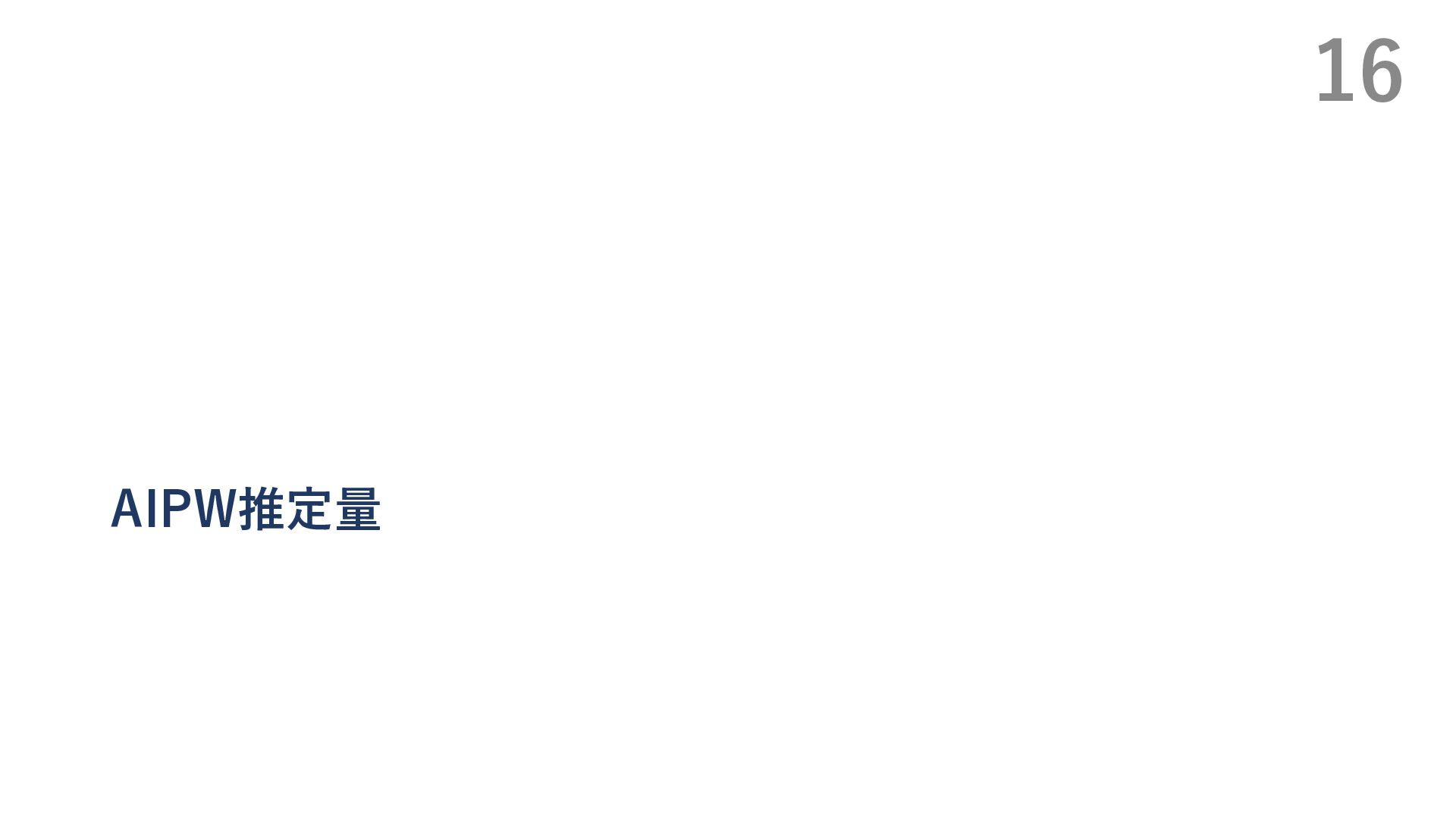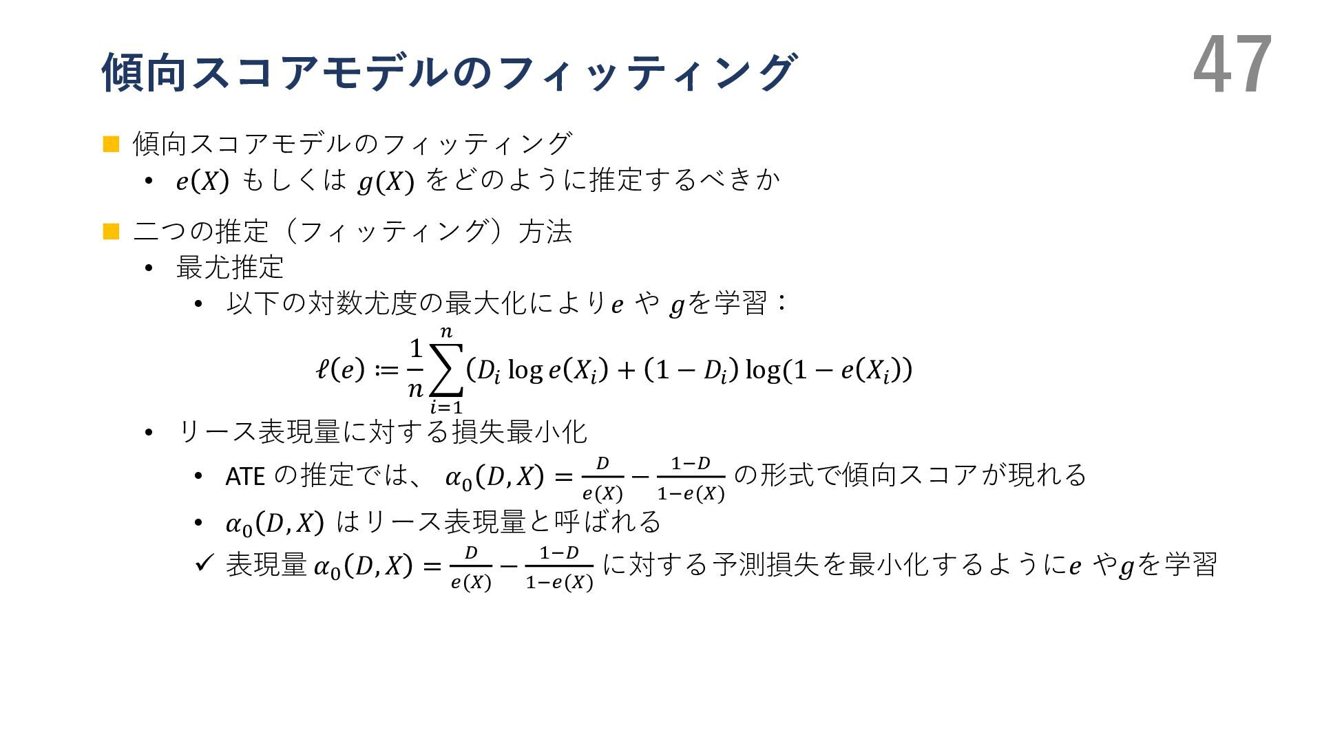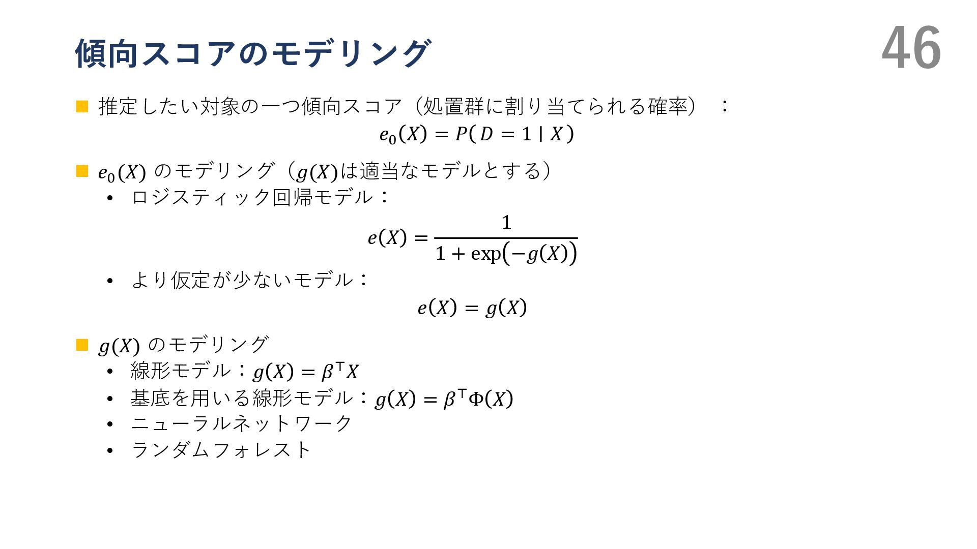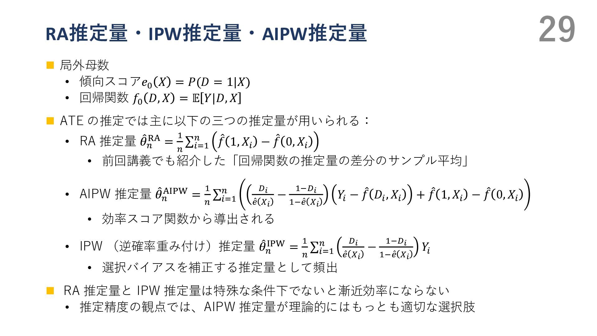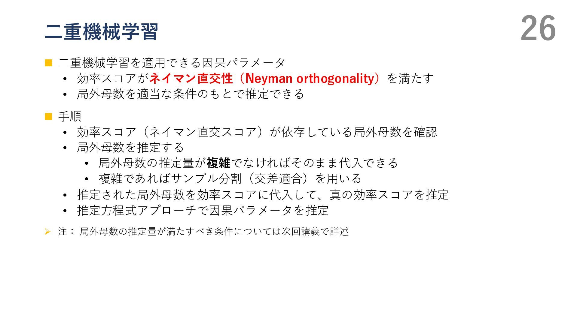 ATE = 1 𝑛 𝑖=1 𝑛 𝜓 𝐷𝑖 , 𝑋𝑖 , 𝑌𝑖 ; መ 𝑓, Ƹ 𝑒, 𝜃0 ATE = 1 𝑛 𝑖=1 𝑛 𝜓 𝐷𝑖 , 𝑋𝑖 , 𝑌𝑖 ; 𝑓0 , 𝑒0 , 𝜃0 ATE − 1 𝑛 𝑖=1 𝑛 𝜓 𝐷𝑖 , 𝑋𝑖 , 𝑌𝑖 ; 𝑓0 , 𝑒0 , 𝜃0 ATE + 1 𝑛 𝑖=1 𝑛 𝜓 𝐷𝑖 , 𝑋𝑖 , 𝑌𝑖 ; መ 𝑓, Ƹ 𝑒, 𝜃0 ATE = 1 𝑛 𝑖=1 𝑛 𝜓 𝐷𝑖 , 𝑋𝑖 , 𝑌𝑖 ; 𝑓0 , 𝑒0 , 𝜃0 ATE − 1 𝑛 𝑖=1 𝑛 𝜓 𝐷𝑖 , 𝑋𝑖 , 𝑌𝑖 ; 𝑓0 , 𝑒0 , 𝜃0 ATE − 1 𝑛 𝑖=1 𝑛 𝜓 𝐷𝑖 , 𝑋𝑖 , 𝑌𝑖 ; መ 𝑓, Ƹ 𝑒, 𝜃0 ATE − 𝑛𝔼 𝜓 𝐷𝑖 , 𝑋𝑖 , 𝑌𝑖 ; 𝑓0 , 𝑒0 , 𝜃0 ATE − 𝜓 𝐷𝑖 , 𝑋𝑖 , 𝑌𝑖 ; መ 𝑓, Ƹ 𝑒, 𝜃0 ATE + 𝑛𝔼 𝜓 𝐷𝑖 , 𝑋𝑖 , 𝑌𝑖 ; 𝑓0 , 𝑒0 , 𝜃0 ATE − 𝜓 𝐷𝑖 , 𝑋𝑖 , 𝑌𝑖 ; መ 𝑓, Ƹ 𝑒, 𝜃0 ATE = 1 𝑛 𝑖=1 𝑛 𝜓 𝐷𝑖 , 𝑋𝑖 , 𝑌𝑖 ; 𝑓0 , 𝑒0 , 𝜃0 ATE − 1 𝑛 𝑖=1 𝑛 𝜓 𝐷𝑖 , 𝑋𝑖 , 𝑌𝑖 ; 𝑓0 , 𝑒0 , 𝜃0 ATE − 1 𝑛 𝑖=1 𝑛 𝜓 𝐷𝑖 , 𝑋𝑖 , 𝑌𝑖 ; መ 𝑓, Ƹ 𝑒𝜃0 ATE − 𝑛𝔼 𝜓 𝐷𝑖 , 𝑋𝑖 , 𝑌𝑖 ; 𝑓0 , 𝑒0 , 𝜃0 ATE − 𝜓 𝐷𝑖 , 𝑋𝑖 , 𝑌𝑖 ; መ 𝑓, Ƹ 𝑒, 𝜃0 ATE − 𝑛𝔼 𝜓 𝐷𝑖 , 𝑋𝑖 , 𝑌𝑖 ; 𝑓0 , 𝑒0 , 𝜃0 ATE − 𝜓 𝐷𝑖 , 𝑋𝑖 , 𝑌𝑖 ; መ 𝑓, Ƹ 𝑒, 𝜃0 ATE 経験過程項:Donsker条件、もしくはサンプル分割(交差適合)で𝑜𝑝 (1) 推定誤差のみ:レート条件で𝑜𝑝 (1)