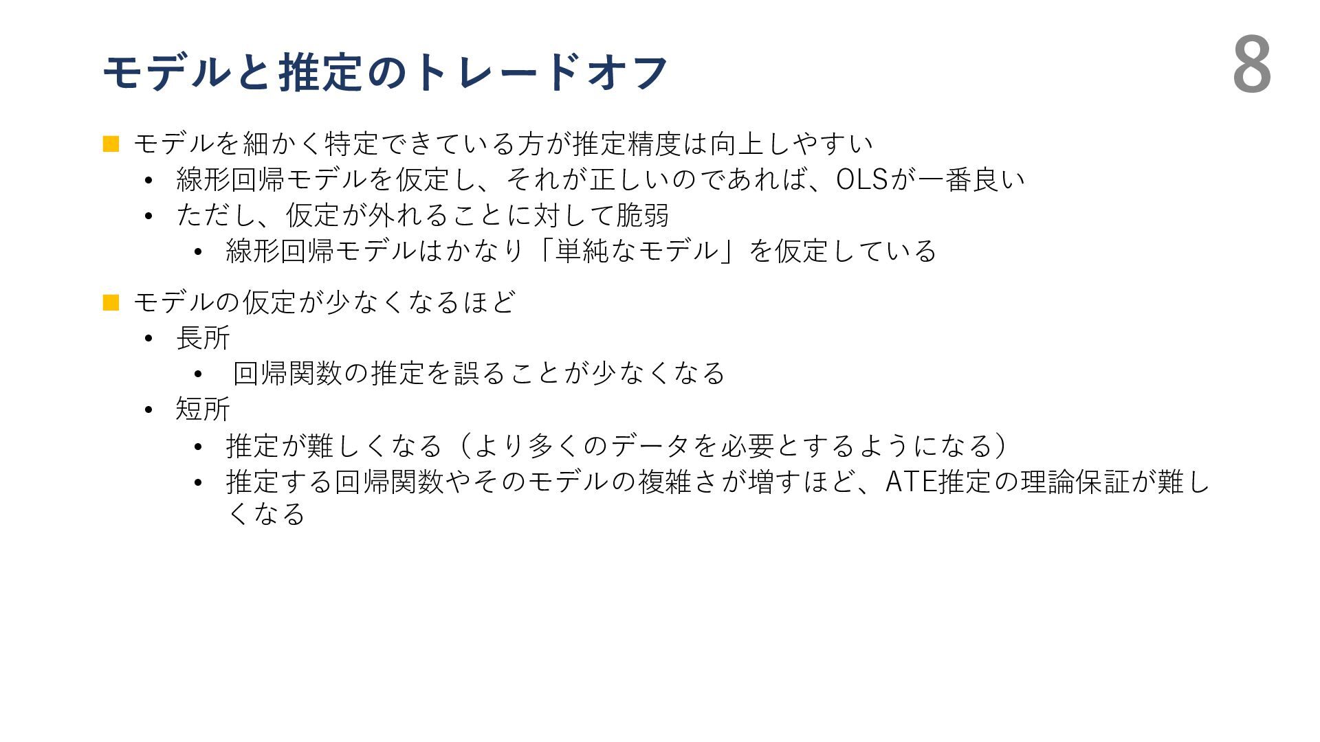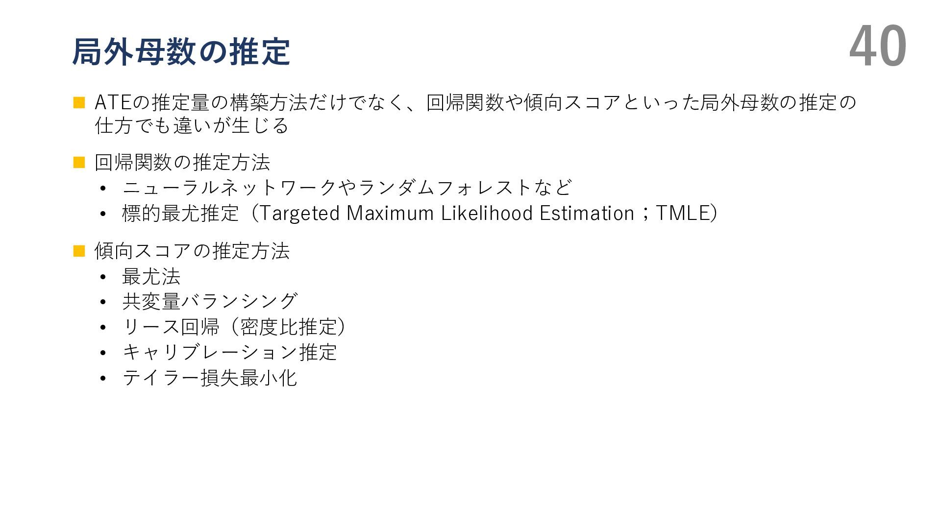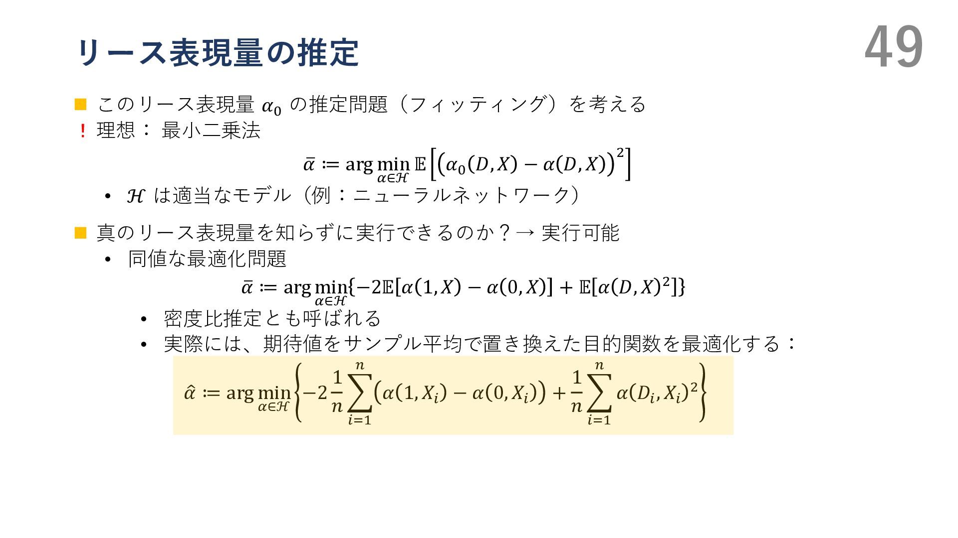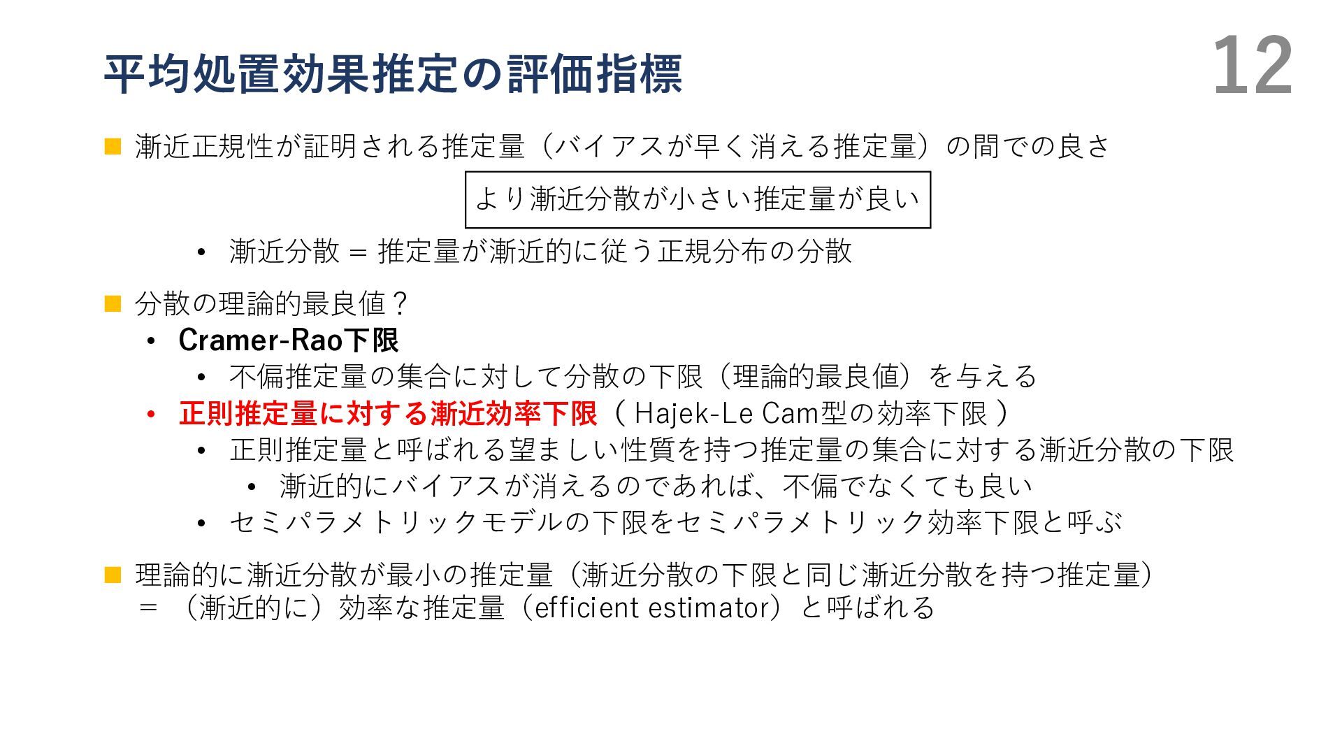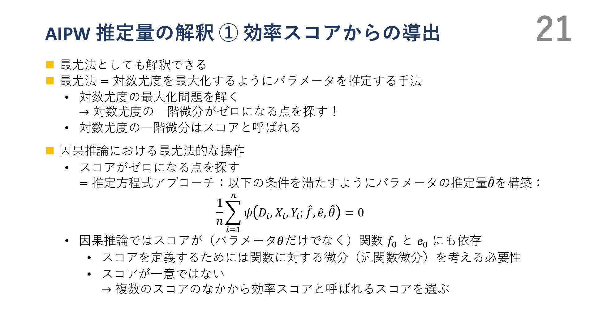 ATE = 1 𝑛 𝑖=1 𝑛 𝜓 𝐷𝑖 , 𝑋𝑖 , 𝑌𝑖 ; መ 𝑓, Ƹ 𝑒, 𝜃0 ATE = 1 𝑛 𝑖=1 𝑛 𝜓 𝐷𝑖 , 𝑋𝑖 , 𝑌𝑖 ; 𝑓0 , 𝑒0 , 𝜃0 ATE − 1 𝑛 𝑖=1 𝑛 𝜓 𝐷𝑖 , 𝑋𝑖 , 𝑌𝑖 ; 𝑓0 , 𝑒0 , 𝜃0 ATE + 1 𝑛 𝑖=1 𝑛 𝜓 𝐷𝑖 , 𝑋𝑖 , 𝑌𝑖 ; መ 𝑓, Ƹ 𝑒, 𝜃0 ATE = 1 𝑛 𝑖=1 𝑛 𝜓 𝐷𝑖 , 𝑋𝑖 , 𝑌𝑖 ; 𝑓0 , 𝑒0 , 𝜃0 ATE − 1 𝑛 𝑖=1 𝑛 𝜓 𝐷𝑖 , 𝑋𝑖 , 𝑌𝑖 ; 𝑓0 , 𝑒0 , 𝜃0 ATE − 1 𝑛 𝑖=1 𝑛 𝜓 𝐷𝑖 , 𝑋𝑖 , 𝑌𝑖 ; መ 𝑓, Ƹ 𝑒, 𝜃0 ATE − 𝑛𝔼 𝜓 𝐷𝑖 , 𝑋𝑖 , 𝑌𝑖 ; 𝑓0 , 𝑒0 , 𝜃0 ATE − 𝜓 𝐷𝑖 , 𝑋𝑖 , 𝑌𝑖 ; መ 𝑓, Ƹ 𝑒, 𝜃0 ATE + 𝑛𝔼 𝜓 𝐷𝑖 , 𝑋𝑖 , 𝑌𝑖 ; 𝑓0 , 𝑒0 , 𝜃0 ATE − 𝜓 𝐷𝑖 , 𝑋𝑖 , 𝑌𝑖 ; መ 𝑓, Ƹ 𝑒, 𝜃0 ATE = 1 𝑛 𝑖=1 𝑛 𝜓 𝐷𝑖 , 𝑋𝑖 , 𝑌𝑖 ; 𝑓0 , 𝑒0 , 𝜃0 ATE − 1 𝑛 𝑖=1 𝑛 𝜓 𝐷𝑖 , 𝑋𝑖 , 𝑌𝑖 ; 𝑓0 , 𝑒0 , 𝜃0 ATE − 1 𝑛 𝑖=1 𝑛 𝜓 𝐷𝑖 , 𝑋𝑖 , 𝑌𝑖 ; መ 𝑓, Ƹ 𝑒𝜃0 ATE − 𝑛𝔼 𝜓 𝐷𝑖 , 𝑋𝑖 , 𝑌𝑖 ; 𝑓0 , 𝑒0 , 𝜃0 ATE − 𝜓 𝐷𝑖 , 𝑋𝑖 , 𝑌𝑖 ; መ 𝑓, Ƹ 𝑒, 𝜃0 ATE − 𝑛𝔼 𝜓 𝐷𝑖 , 𝑋𝑖 , 𝑌𝑖 ; 𝑓0 , 𝑒0 , 𝜃0 ATE − 𝜓 𝐷𝑖 , 𝑋𝑖 , 𝑌𝑖 ; መ 𝑓, Ƹ 𝑒, 𝜃0 ATE 経験過程項:Donsker条件、もしくはサンプル分割(交差適合)で𝑜𝑝 (1) 推定誤差のみ:レート条件で𝑜𝑝 (1)