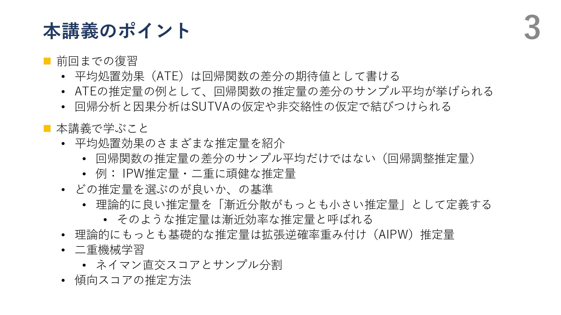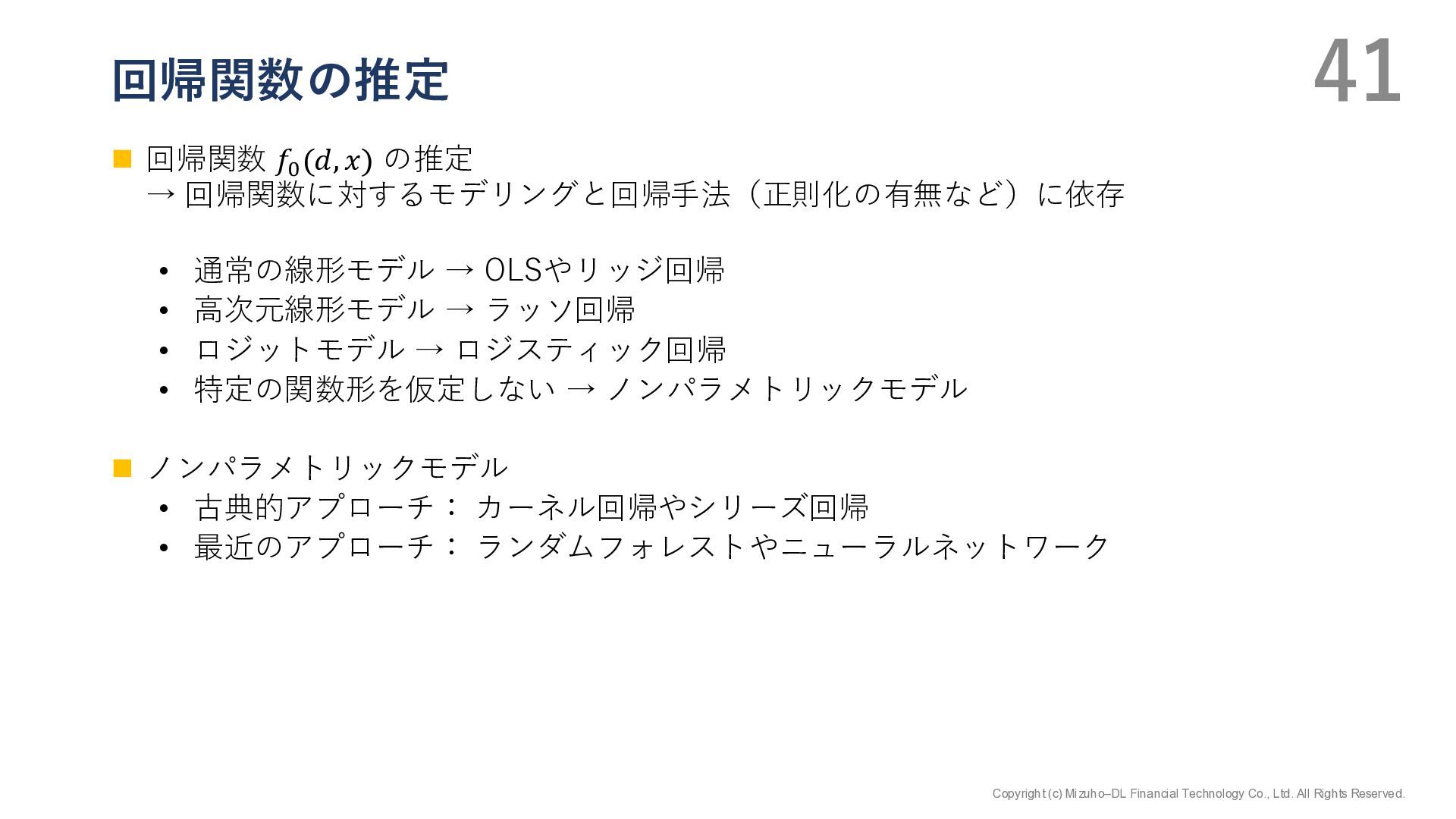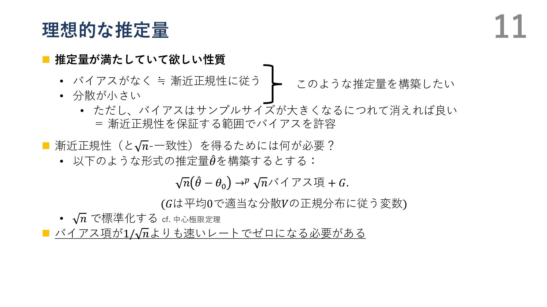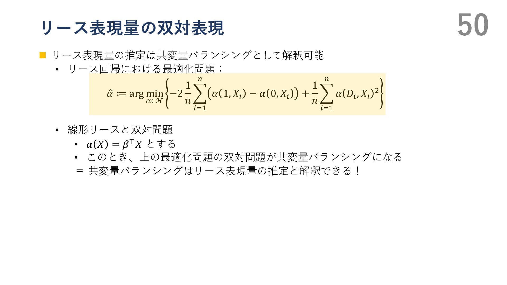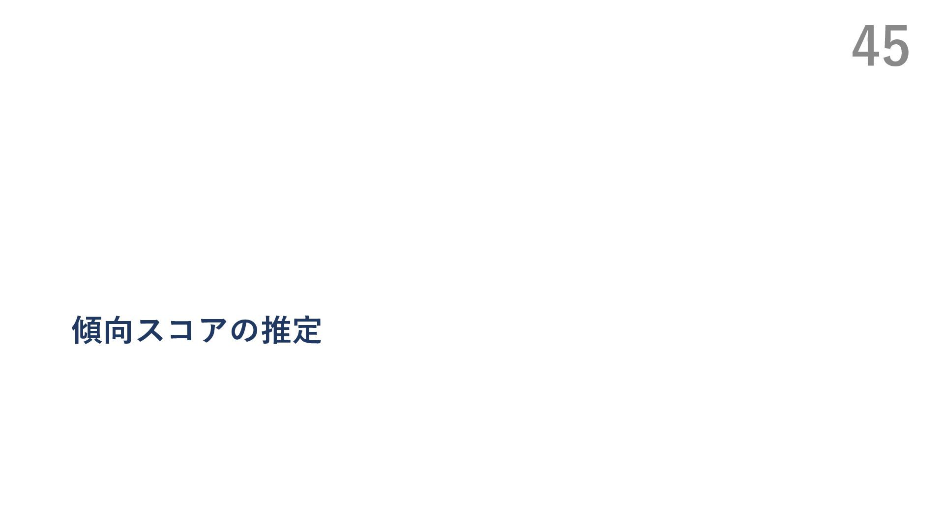 ATE = 1 𝑛 𝑖=1 𝑛 𝜓 𝐷𝑖 , 𝑋𝑖 , 𝑌𝑖 ; መ 𝑓, Ƹ 𝑒, 𝜃0 ATE = 1 𝑛 𝑖=1 𝑛 𝜓 𝐷𝑖 , 𝑋𝑖 , 𝑌𝑖 ; 𝑓0 , 𝑒0 , 𝜃0 ATE − 1 𝑛 𝑖=1 𝑛 𝜓 𝐷𝑖 , 𝑋𝑖 , 𝑌𝑖 ; 𝑓0 , 𝑒0 , 𝜃0 ATE + 1 𝑛 𝑖=1 𝑛 𝜓 𝐷𝑖 , 𝑋𝑖 , 𝑌𝑖 ; መ 𝑓, Ƹ 𝑒, 𝜃0 ATE = 1 𝑛 𝑖=1 𝑛 𝜓 𝐷𝑖 , 𝑋𝑖 , 𝑌𝑖 ; 𝑓0 , 𝑒0 , 𝜃0 ATE − 1 𝑛 𝑖=1 𝑛 𝜓 𝐷𝑖 , 𝑋𝑖 , 𝑌𝑖 ; 𝑓0 , 𝑒0 , 𝜃0 ATE − 1 𝑛 𝑖=1 𝑛 𝜓 𝐷𝑖 , 𝑋𝑖 , 𝑌𝑖 ; መ 𝑓, Ƹ 𝑒, 𝜃0 ATE − 𝑛𝔼 𝜓 𝐷𝑖 , 𝑋𝑖 , 𝑌𝑖 ; 𝑓0 , 𝑒0 , 𝜃0 ATE − 𝜓 𝐷𝑖 , 𝑋𝑖 , 𝑌𝑖 ; መ 𝑓, Ƹ 𝑒, 𝜃0 ATE + 𝑛𝔼 𝜓 𝐷𝑖 , 𝑋𝑖 , 𝑌𝑖 ; 𝑓0 , 𝑒0 , 𝜃0 ATE − 𝜓 𝐷𝑖 , 𝑋𝑖 , 𝑌𝑖 ; መ 𝑓, Ƹ 𝑒, 𝜃0 ATE = 1 𝑛 𝑖=1 𝑛 𝜓 𝐷𝑖 , 𝑋𝑖 , 𝑌𝑖 ; 𝑓0 , 𝑒0 , 𝜃0 ATE − 1 𝑛 𝑖=1 𝑛 𝜓 𝐷𝑖 , 𝑋𝑖 , 𝑌𝑖 ; 𝑓0 , 𝑒0 , 𝜃0 ATE − 1 𝑛 𝑖=1 𝑛 𝜓 𝐷𝑖 , 𝑋𝑖 , 𝑌𝑖 ; መ 𝑓, Ƹ 𝑒𝜃0 ATE − 𝑛𝔼 𝜓 𝐷𝑖 , 𝑋𝑖 , 𝑌𝑖 ; 𝑓0 , 𝑒0 , 𝜃0 ATE − 𝜓 𝐷𝑖 , 𝑋𝑖 , 𝑌𝑖 ; መ 𝑓, Ƹ 𝑒, 𝜃0 ATE − 𝑛𝔼 𝜓 𝐷𝑖 , 𝑋𝑖 , 𝑌𝑖 ; 𝑓0 , 𝑒0 , 𝜃0 ATE − 𝜓 𝐷𝑖 , 𝑋𝑖 , 𝑌𝑖 ; መ 𝑓, Ƹ 𝑒, 𝜃0 ATE 経験過程項:Donsker条件、もしくはサンプル分割(交差適合)で𝑜𝑝 (1) 推定誤差のみ:レート条件で𝑜𝑝 (1)