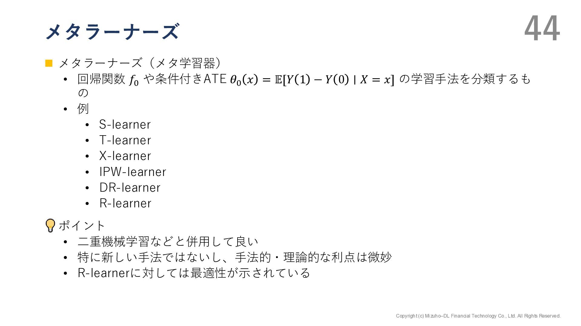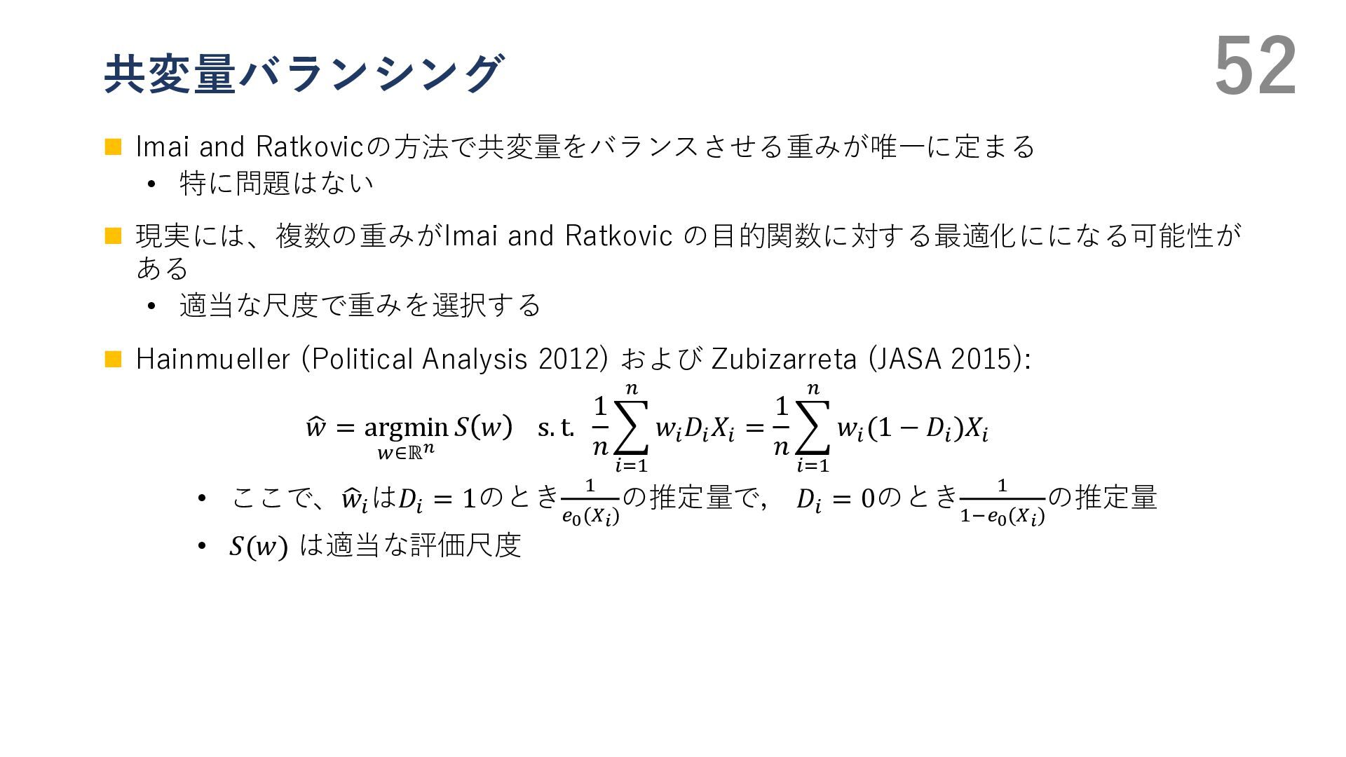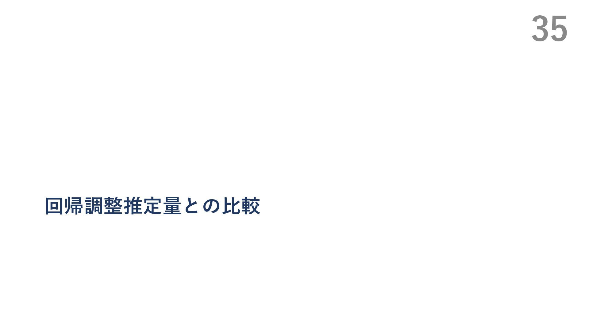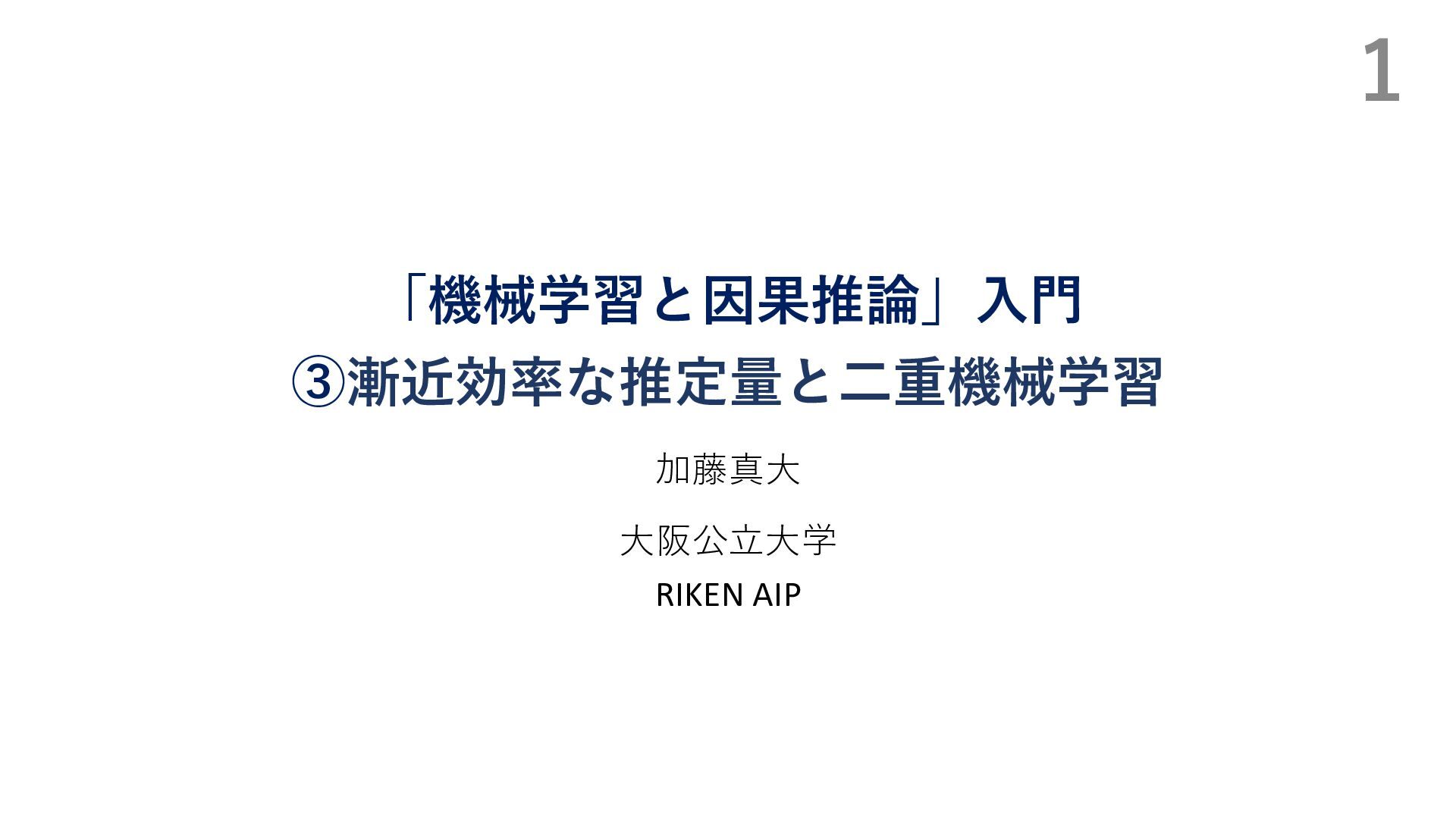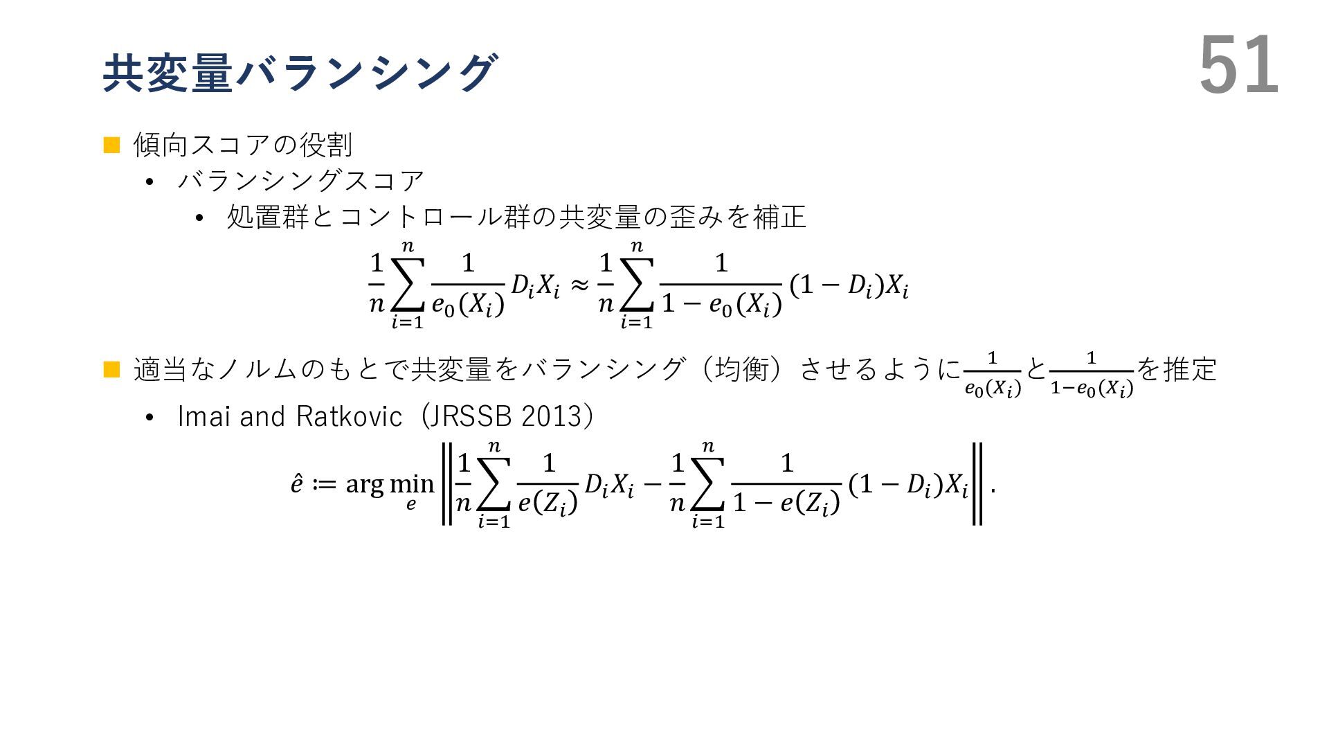 ATE = 1 𝑛 𝑖=1 𝑛 𝜓 𝐷𝑖 , 𝑋𝑖 , 𝑌𝑖 ; መ 𝑓, Ƹ 𝑒, 𝜃0 ATE = 1 𝑛 𝑖=1 𝑛 𝜓 𝐷𝑖 , 𝑋𝑖 , 𝑌𝑖 ; 𝑓0 , 𝑒0 , 𝜃0 ATE − 1 𝑛 𝑖=1 𝑛 𝜓 𝐷𝑖 , 𝑋𝑖 , 𝑌𝑖 ; 𝑓0 , 𝑒0 , 𝜃0 ATE + 1 𝑛 𝑖=1 𝑛 𝜓 𝐷𝑖 , 𝑋𝑖 , 𝑌𝑖 ; መ 𝑓, Ƹ 𝑒, 𝜃0 ATE = 1 𝑛 𝑖=1 𝑛 𝜓 𝐷𝑖 , 𝑋𝑖 , 𝑌𝑖 ; 𝑓0 , 𝑒0 , 𝜃0 ATE − 1 𝑛 𝑖=1 𝑛 𝜓 𝐷𝑖 , 𝑋𝑖 , 𝑌𝑖 ; 𝑓0 , 𝑒0 , 𝜃0 ATE − 1 𝑛 𝑖=1 𝑛 𝜓 𝐷𝑖 , 𝑋𝑖 , 𝑌𝑖 ; መ 𝑓, Ƹ 𝑒, 𝜃0 ATE − 𝑛𝔼 𝜓 𝐷𝑖 , 𝑋𝑖 , 𝑌𝑖 ; 𝑓0 , 𝑒0 , 𝜃0 ATE − 𝜓 𝐷𝑖 , 𝑋𝑖 , 𝑌𝑖 ; መ 𝑓, Ƹ 𝑒, 𝜃0 ATE + 𝑛𝔼 𝜓 𝐷𝑖 , 𝑋𝑖 , 𝑌𝑖 ; 𝑓0 , 𝑒0 , 𝜃0 ATE − 𝜓 𝐷𝑖 , 𝑋𝑖 , 𝑌𝑖 ; መ 𝑓, Ƹ 𝑒, 𝜃0 ATE = 1 𝑛 𝑖=1 𝑛 𝜓 𝐷𝑖 , 𝑋𝑖 , 𝑌𝑖 ; 𝑓0 , 𝑒0 , 𝜃0 ATE − 1 𝑛 𝑖=1 𝑛 𝜓 𝐷𝑖 , 𝑋𝑖 , 𝑌𝑖 ; 𝑓0 , 𝑒0 , 𝜃0 ATE − 1 𝑛 𝑖=1 𝑛 𝜓 𝐷𝑖 , 𝑋𝑖 , 𝑌𝑖 ; መ 𝑓, Ƹ 𝑒𝜃0 ATE − 𝑛𝔼 𝜓 𝐷𝑖 , 𝑋𝑖 , 𝑌𝑖 ; 𝑓0 , 𝑒0 , 𝜃0 ATE − 𝜓 𝐷𝑖 , 𝑋𝑖 , 𝑌𝑖 ; መ 𝑓, Ƹ 𝑒, 𝜃0 ATE − 𝑛𝔼 𝜓 𝐷𝑖 , 𝑋𝑖 , 𝑌𝑖 ; 𝑓0 , 𝑒0 , 𝜃0 ATE − 𝜓 𝐷𝑖 , 𝑋𝑖 , 𝑌𝑖 ; መ 𝑓, Ƹ 𝑒, 𝜃0 ATE 経験過程項:Donsker条件、もしくはサンプル分割(交差適合)で𝑜𝑝 (1) 推定誤差のみ:レート条件で𝑜𝑝 (1)