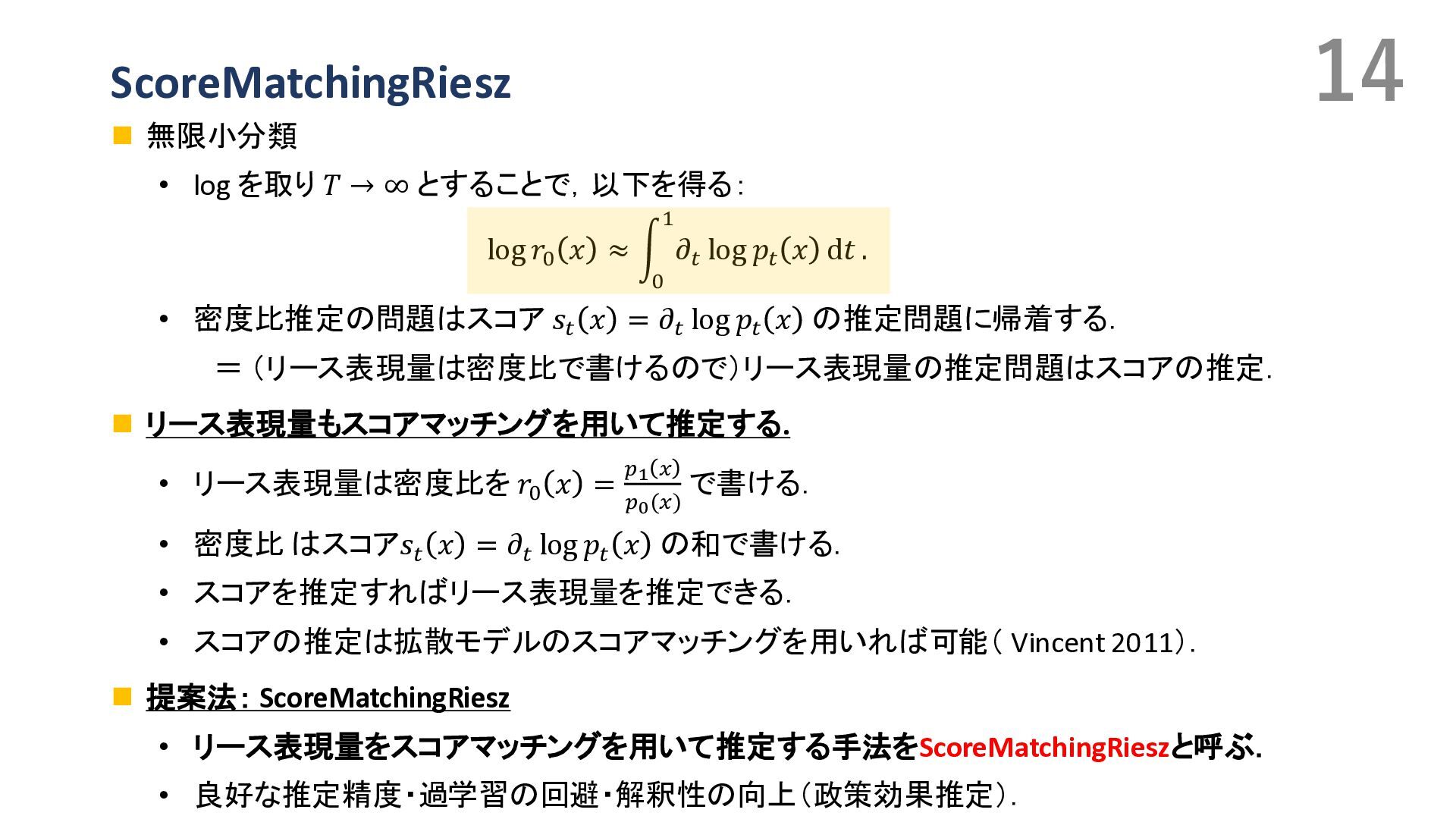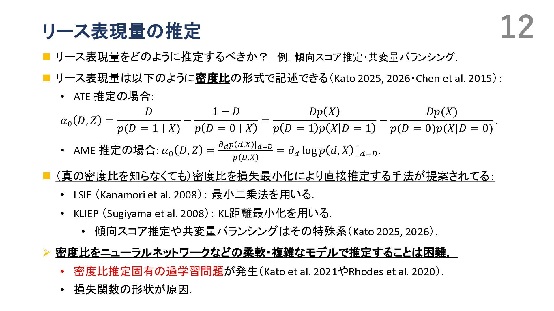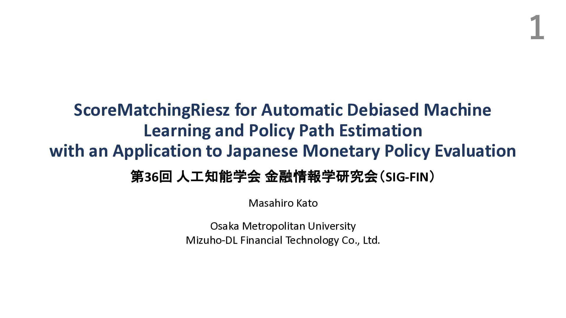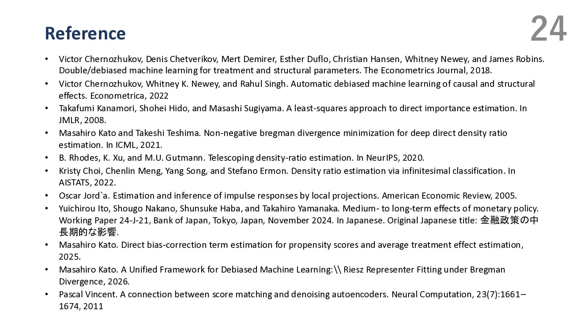 Duflo, Christian Hansen, Whitney Newey, and James Robins. Double/debiased machine learning for treatment and structural parameters. The Econometrics Journal, 2018. • Victor Chernozhukov, Whitney K. Newey, and Rahul Singh. Automatic debiased machine learning of causal and structural effects. Econometrica, 2022 • Takafumi Kanamori, Shohei Hido, and Masashi Sugiyama. A least-squares approach to direct importance estimation. In JMLR, 2008. • Masahiro Kato and Takeshi Teshima. Non-negative bregman divergence minimization for deep direct density ratio estimation. In ICML, 2021. • B. Rhodes, K. Xu, and M.U. Gutmann. Telescoping density-ratio estimation. In NeurIPS, 2020. • Kristy Choi, Chenlin Meng, Yang Song, and Stefano Ermon. Density ratio estimation via infinitesimal classification. In AISTATS, 2022. • Oscar Jord`a. Estimation and inference of impulse responses by local projections. American Economic Review, 2005. • Yuichirou Ito, Shougo Nakano, Shunsuke Haba, and Takahiro Yamanaka. Medium- to long-term effects of monetary policy. Working Paper 24-J-21, Bank of Japan, Tokyo, Japan, November 2024. In Japanese. Original Japanese title: 金融政策の中 長期的な影響. • Masahiro Kato. Direct bias-correction term estimation for propensity scores and average treatment effect estimation, 2025. • Masahiro Kato. A Unified Framework for Debiased Machine Learning:\\ Riesz Representer Fitting under Bregman Divergence, 2026. • Pascal Vincent. A connection between score matching and denoising autoencoders. Neural Computation, 23(7):1661– 1674, 2011