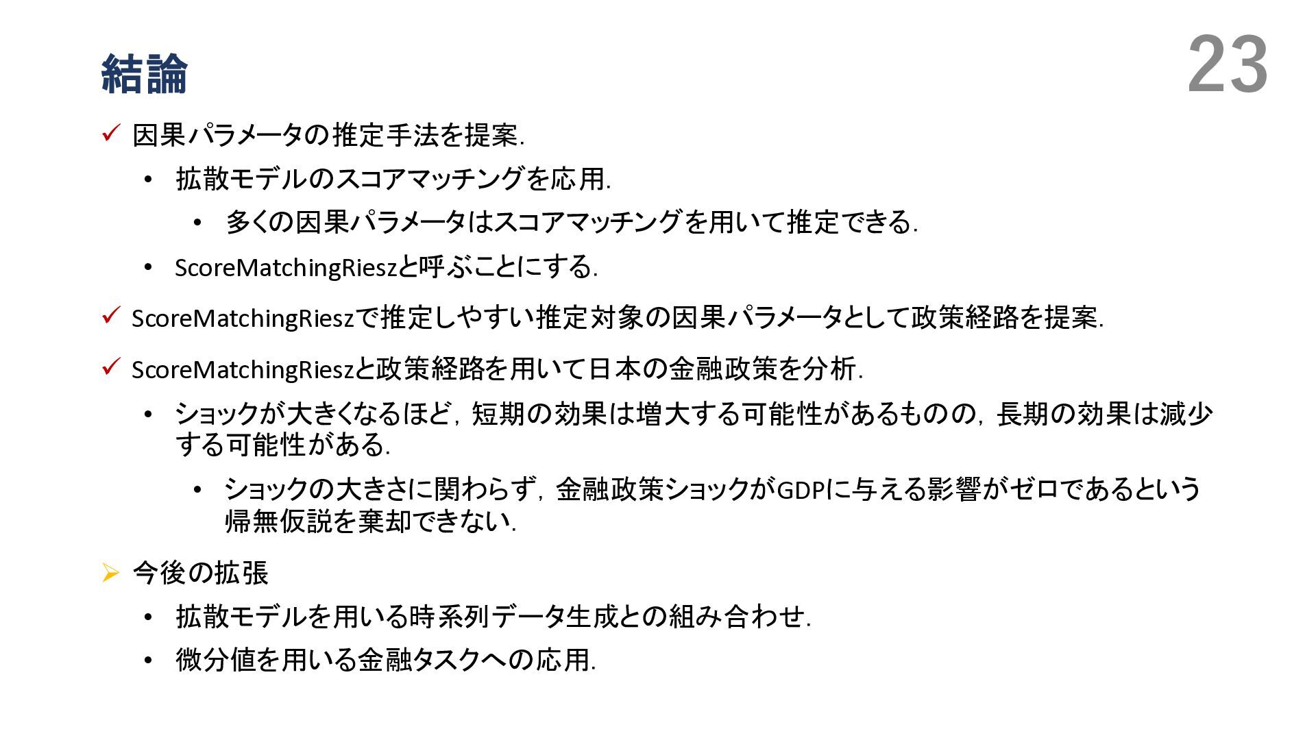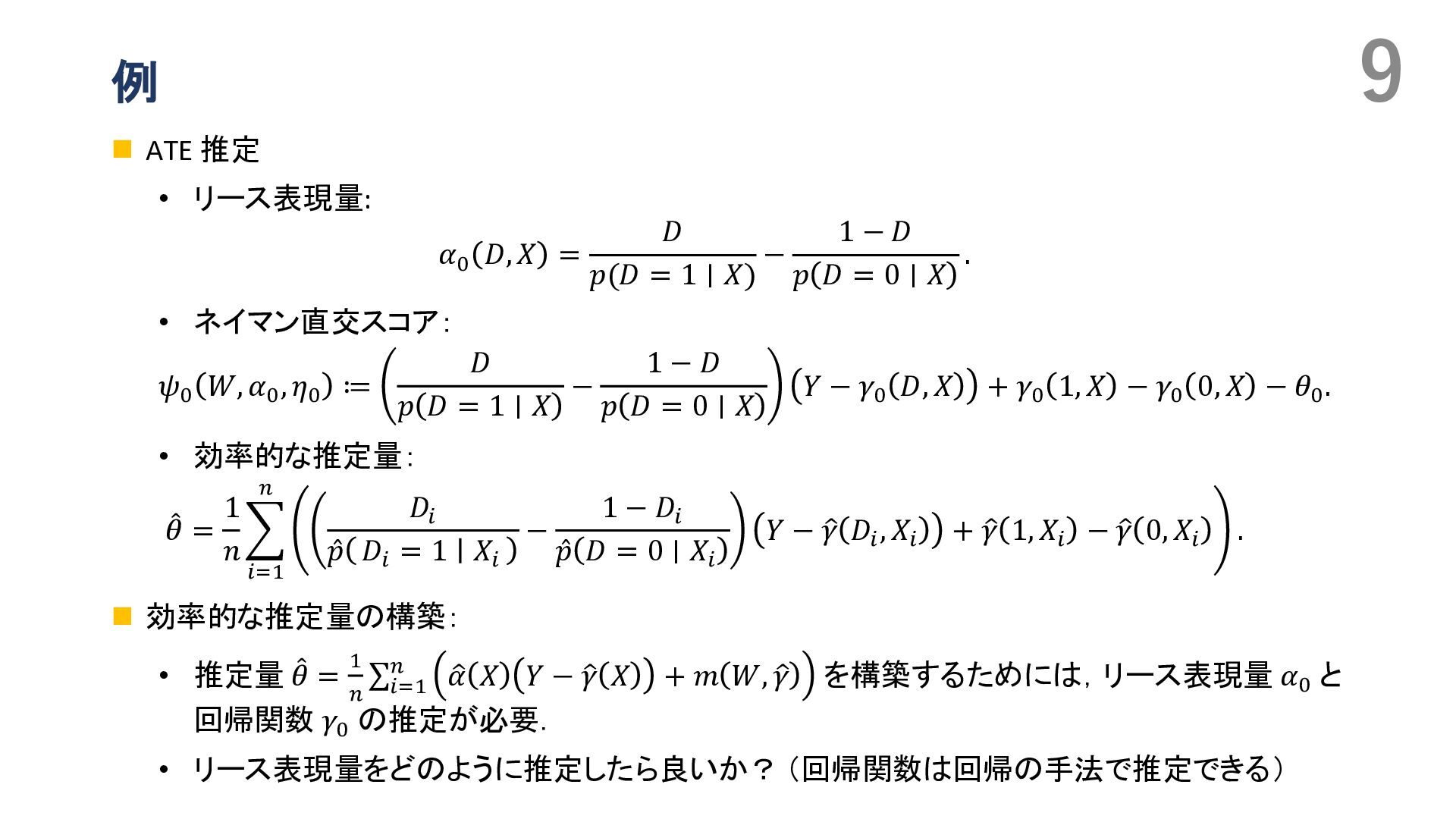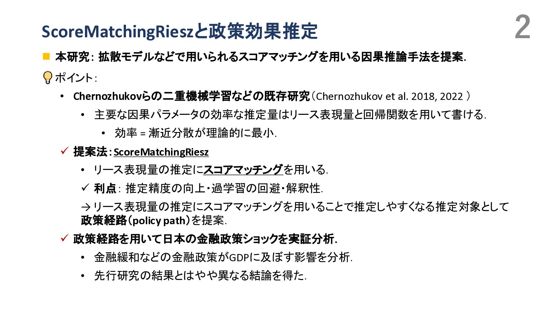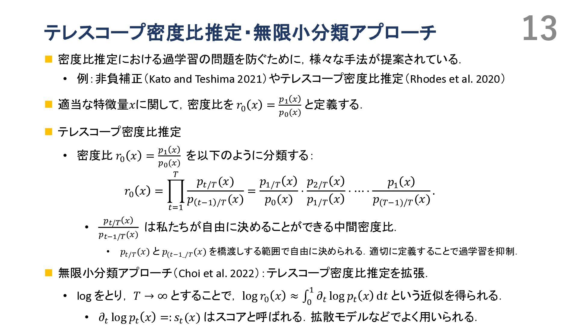 Duflo, Christian Hansen, Whitney Newey, and James Robins. Double/debiased machine learning for treatment and structural parameters. The Econometrics Journal, 2018. • Victor Chernozhukov, Whitney K. Newey, and Rahul Singh. Automatic debiased machine learning of causal and structural effects. Econometrica, 2022 • Takafumi Kanamori, Shohei Hido, and Masashi Sugiyama. A least-squares approach to direct importance estimation. In JMLR, 2008. • Masahiro Kato and Takeshi Teshima. Non-negative bregman divergence minimization for deep direct density ratio estimation. In ICML, 2021. • B. Rhodes, K. Xu, and M.U. Gutmann. Telescoping density-ratio estimation. In NeurIPS, 2020. • Kristy Choi, Chenlin Meng, Yang Song, and Stefano Ermon. Density ratio estimation via infinitesimal classification. In AISTATS, 2022. • Oscar Jord`a. Estimation and inference of impulse responses by local projections. American Economic Review, 2005. • Yuichirou Ito, Shougo Nakano, Shunsuke Haba, and Takahiro Yamanaka. Medium- to long-term effects of monetary policy. Working Paper 24-J-21, Bank of Japan, Tokyo, Japan, November 2024. In Japanese. Original Japanese title: 金融政策の中 長期的な影響. • Masahiro Kato. Direct bias-correction term estimation for propensity scores and average treatment effect estimation, 2025. • Masahiro Kato. A Unified Framework for Debiased Machine Learning:\\ Riesz Representer Fitting under Bregman Divergence, 2026. • Pascal Vincent. A connection between score matching and denoising autoencoders. Neural Computation, 23(7):1661– 1674, 2011
